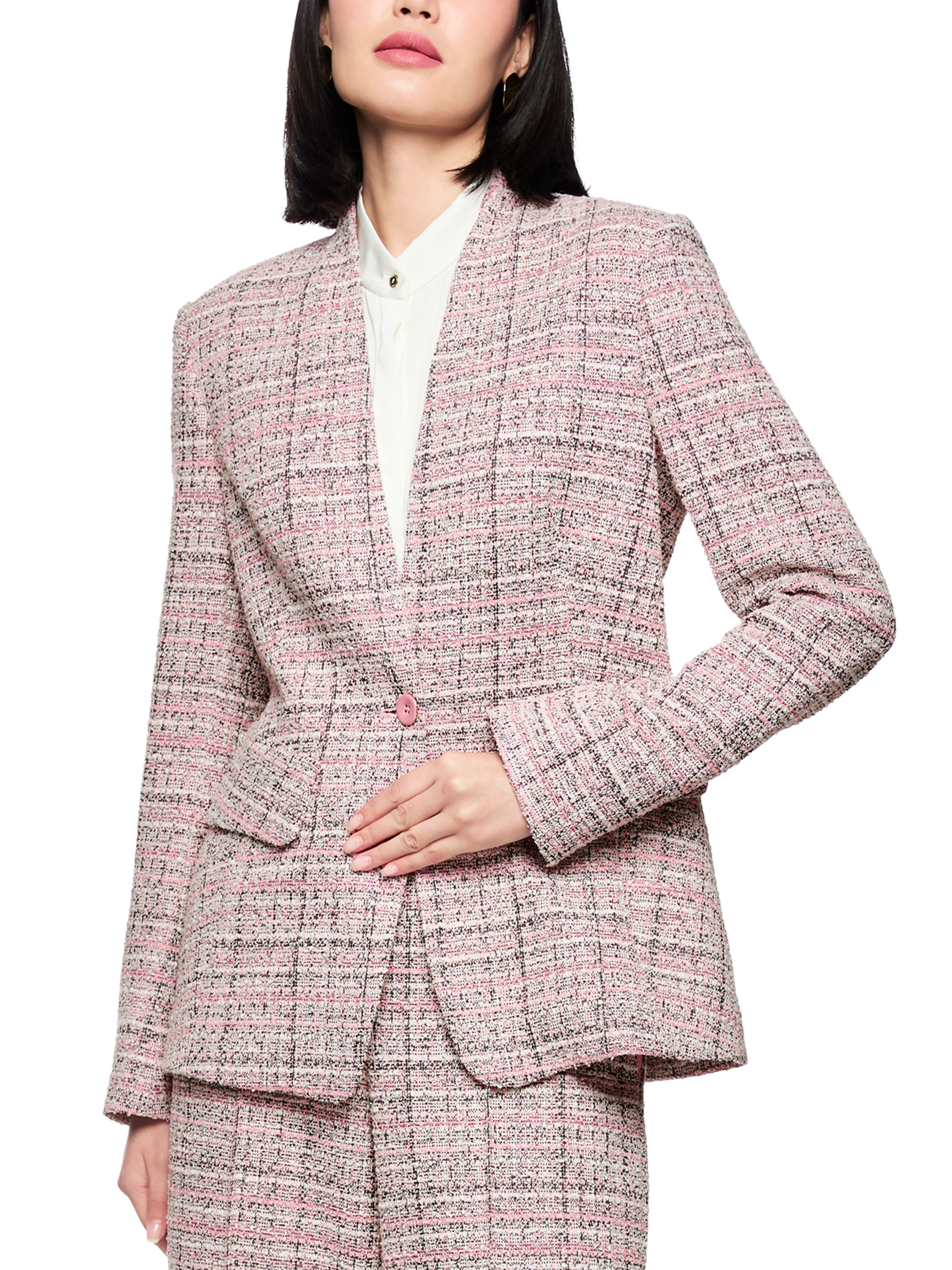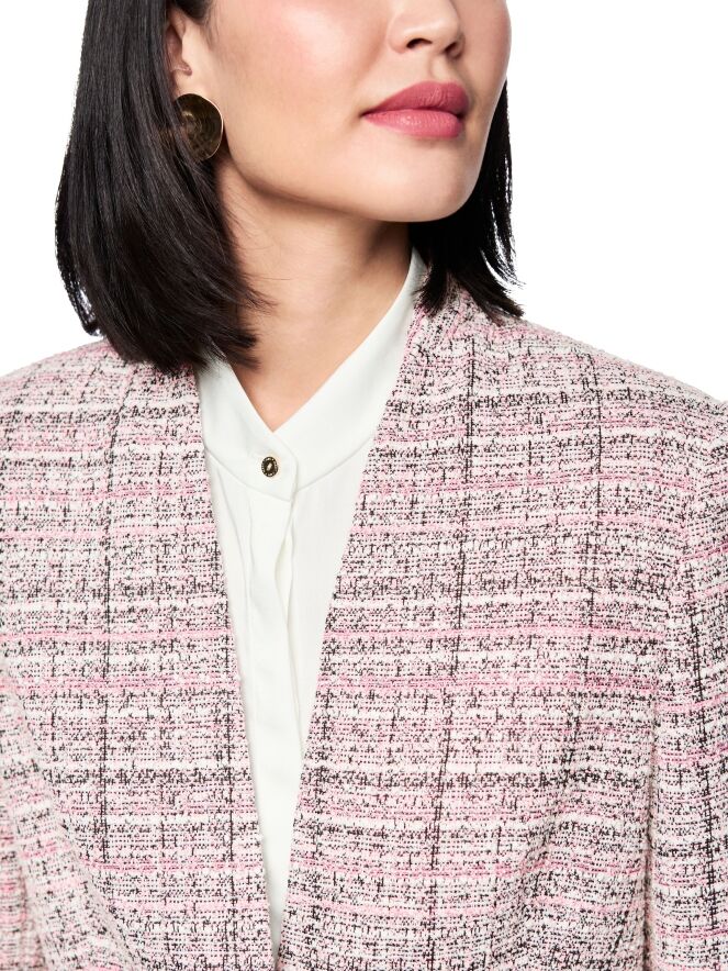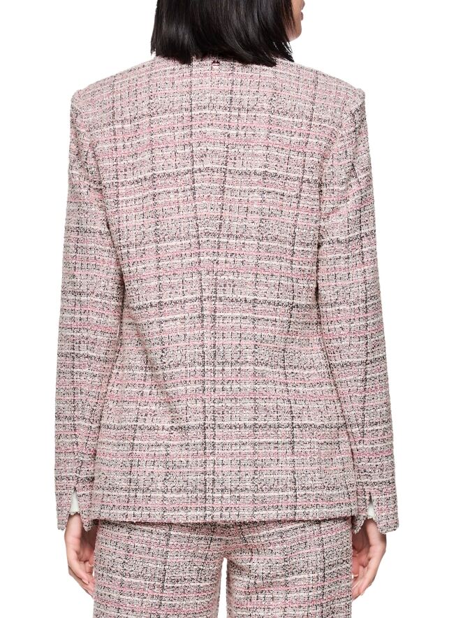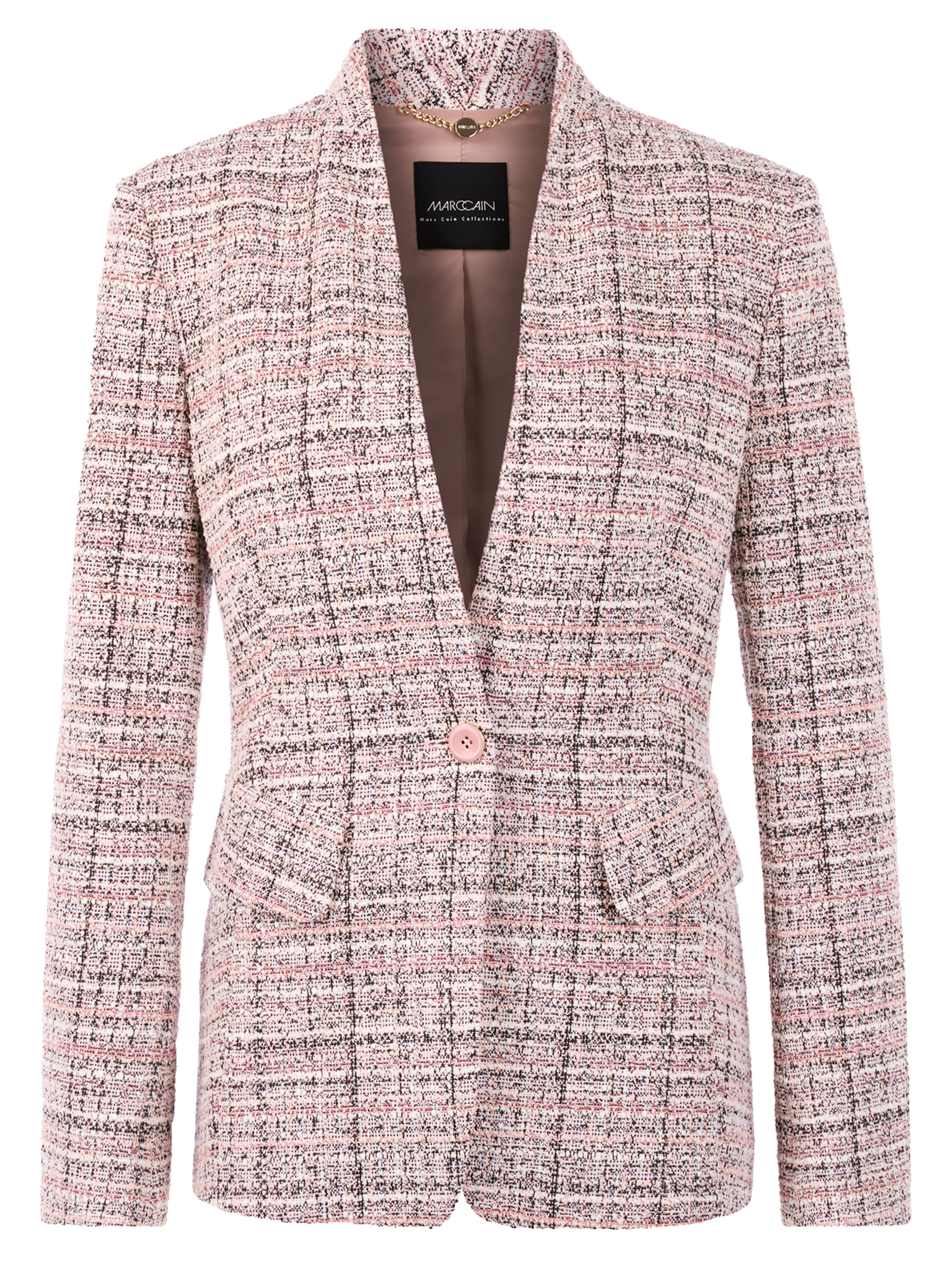 Een blazer in een tweed look met de kleuren zalmroze, roomwit, nude en zwart. De sluiting is met één geëmailleerde knoop. Aan het uiteinde van de lange mouwen is een kort splitje. De blazer is gevoerd en mag niet worden gewassen.