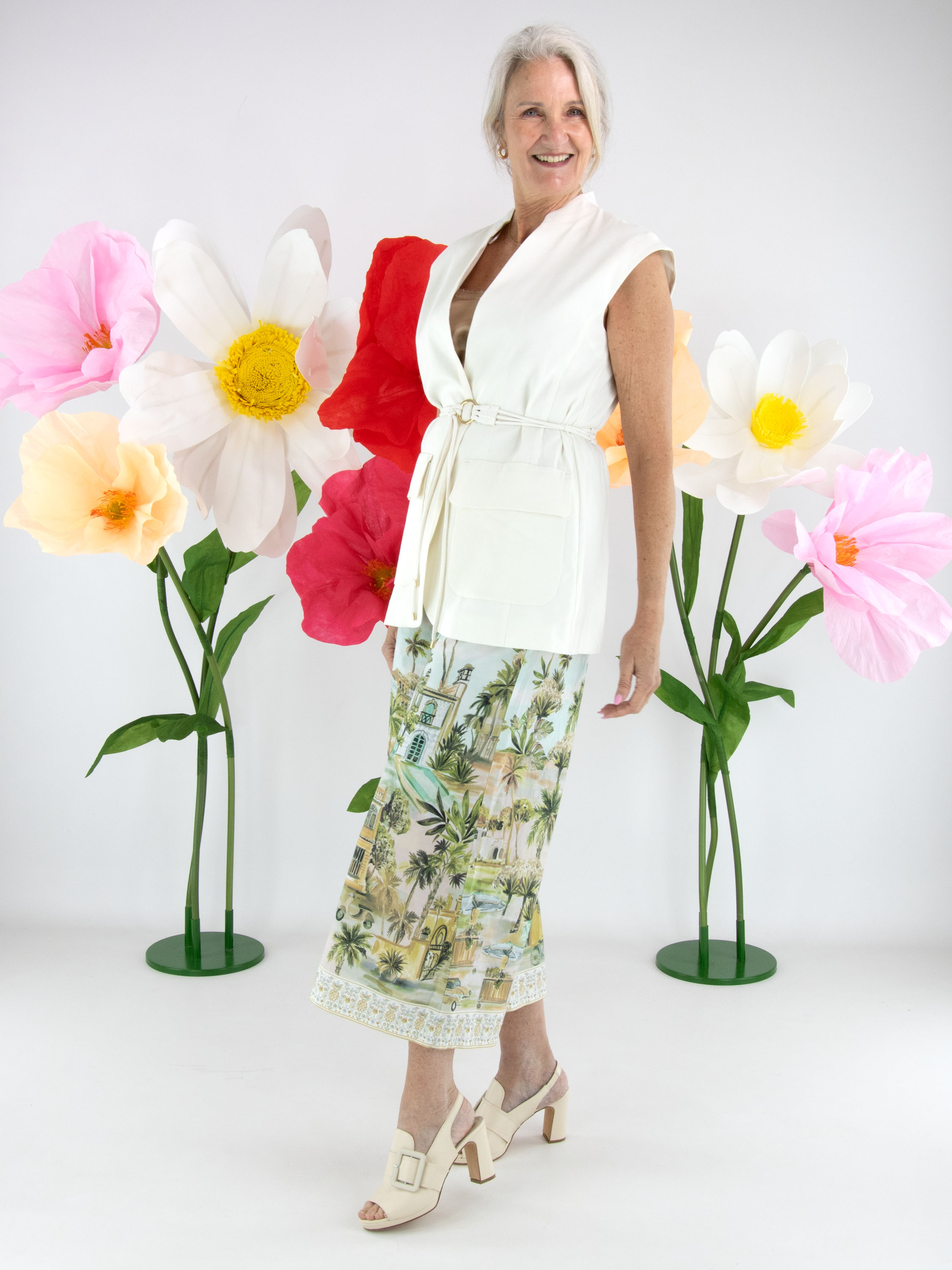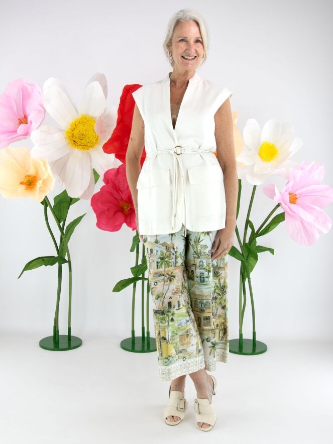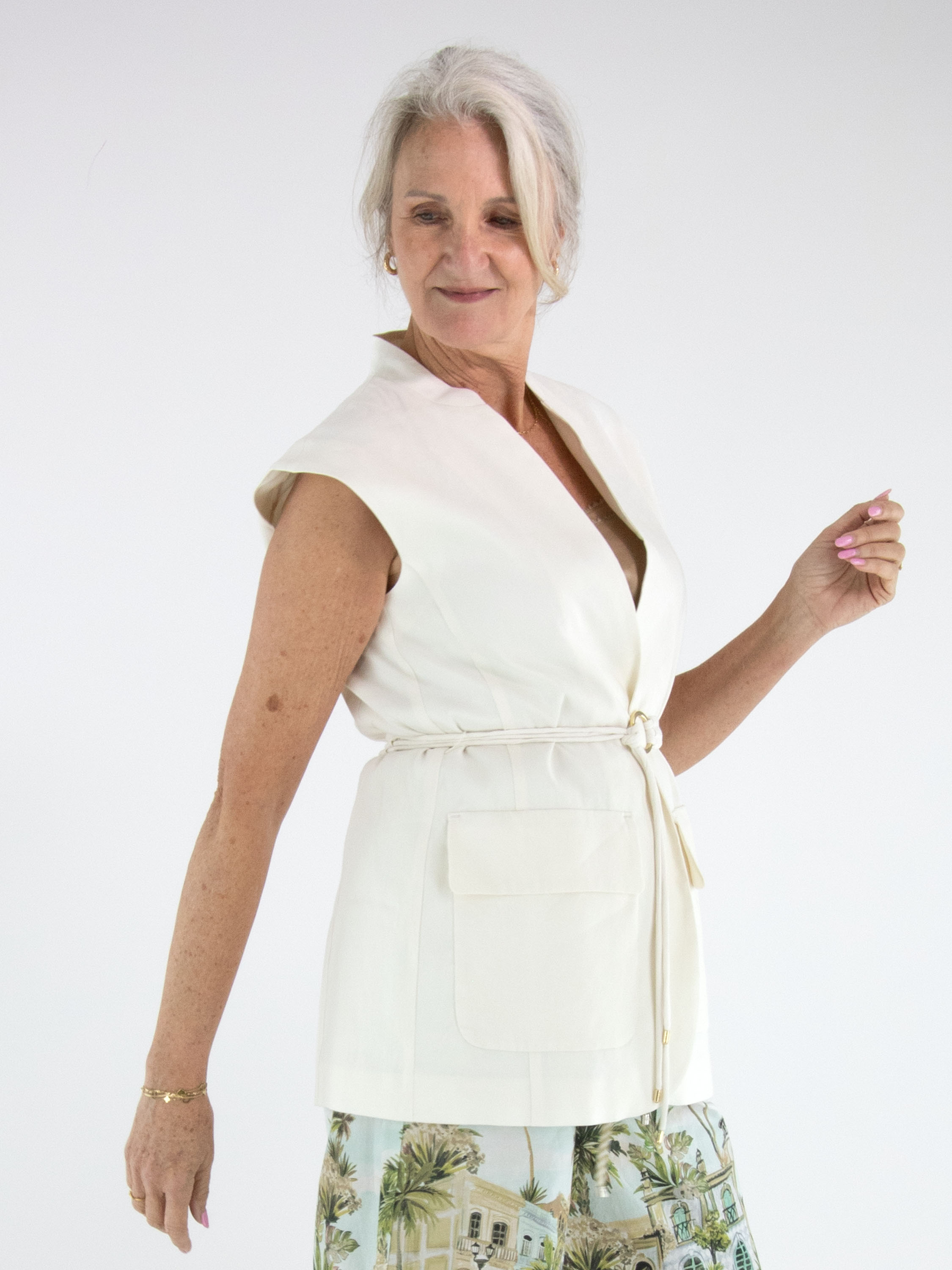 Gilet van Marc Cain in een elegante roomwitte tint. Ter hoogte van de taille is een ceintuur met drie koorden in dezelfde stof en kleur verwerkt, afgewerkt met een ronde goudkleurige gesp voor een verfijnd accent. Het gilet sluit met één drukknoop en is gevoerd, wat zorgt voor een mooie valling en extra draagcomfort. Dit gilet kan op 30 graden worden gewassen.