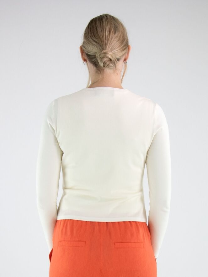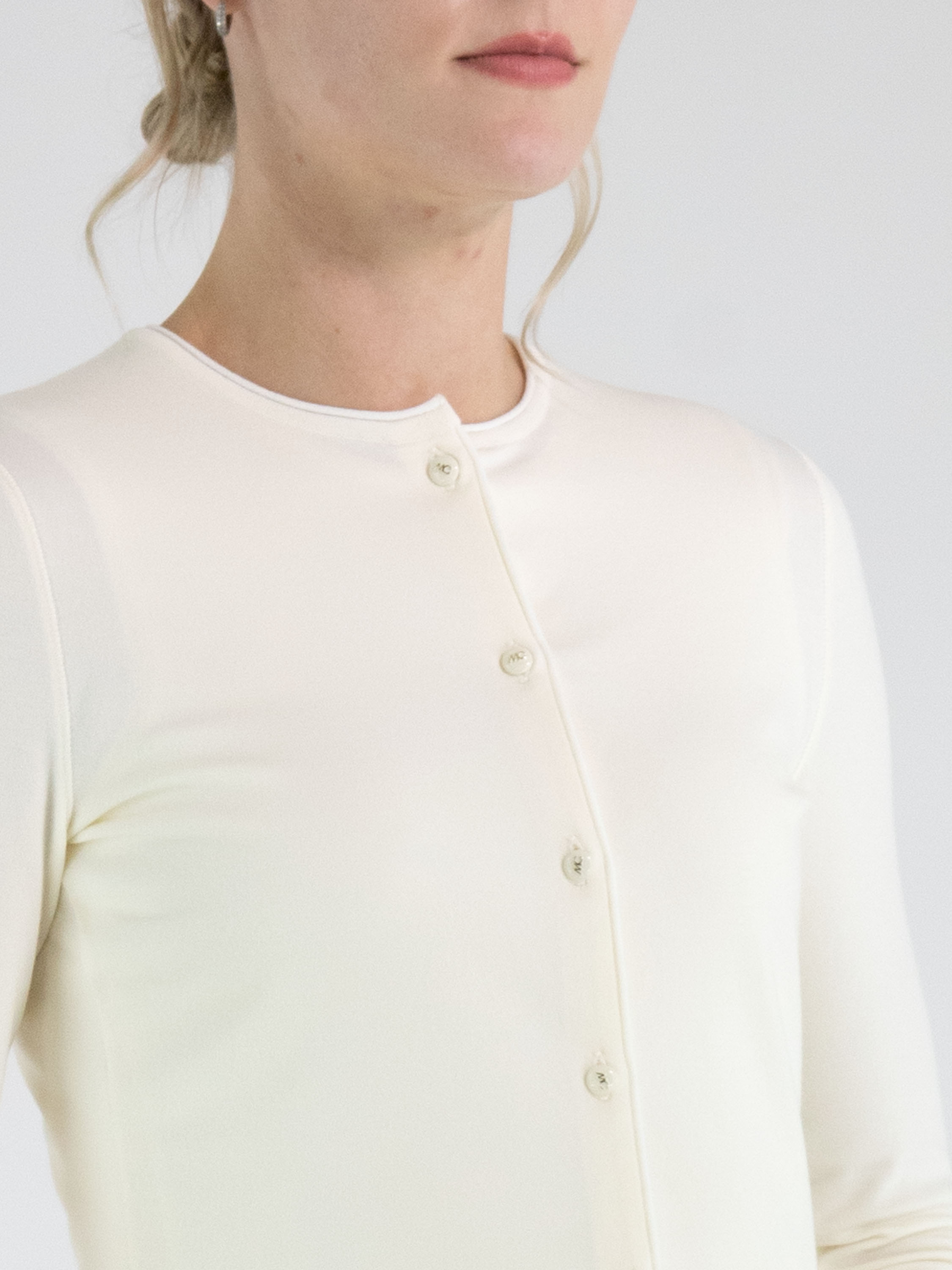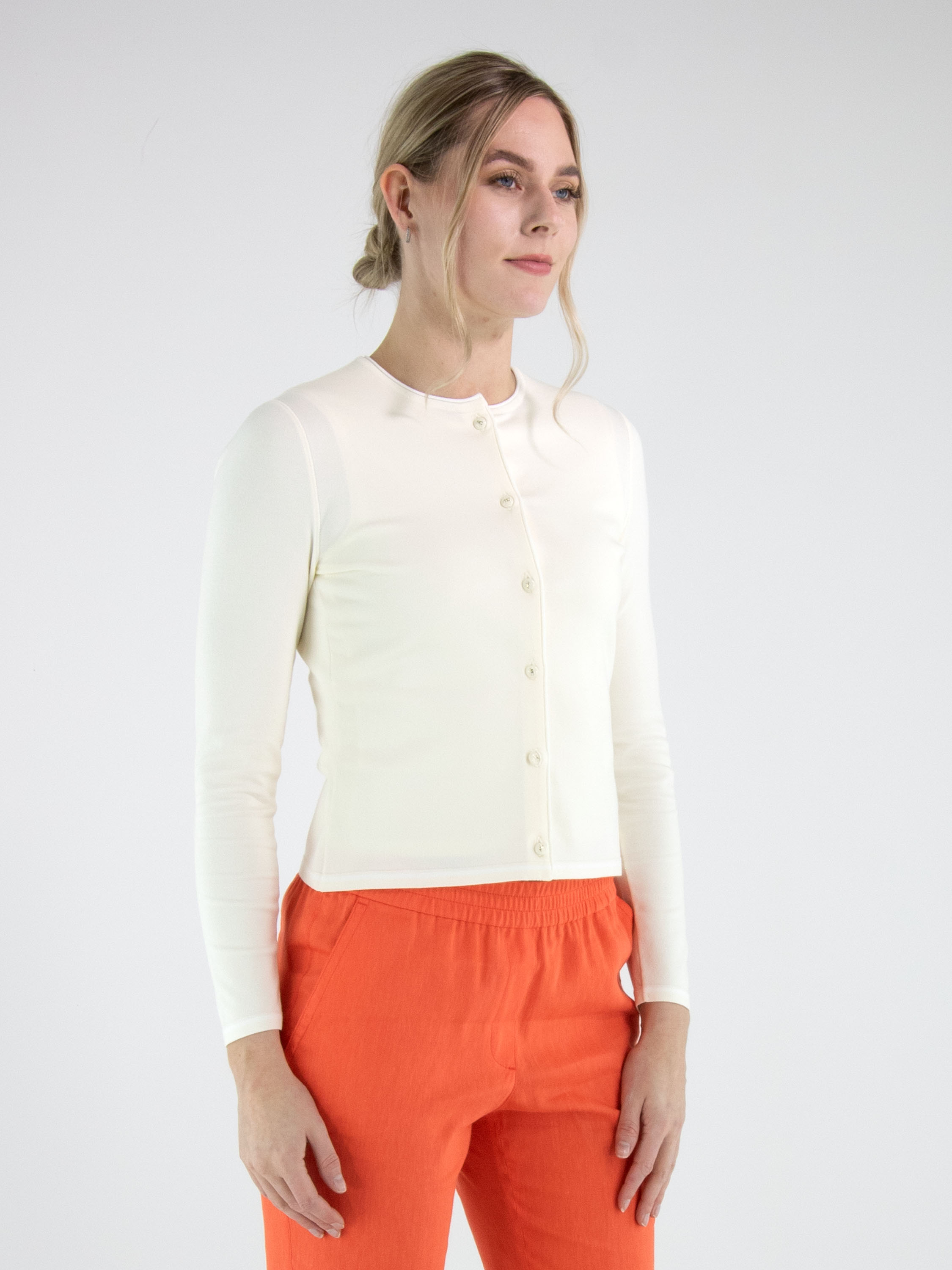 Vest van Marc Cain in een elegante roomwitte tint. Langs de rand van de ronde hals, de uiteinden van de lange mouwen en de zoom is een fijn geribbelde tricot bies verwerkt met een subtiel geprinte witte streep, wat zorgt voor een verfijnd en sportief accent. Het vest heeft een knoopsluiting en kan op 30 graden worden gewassen.