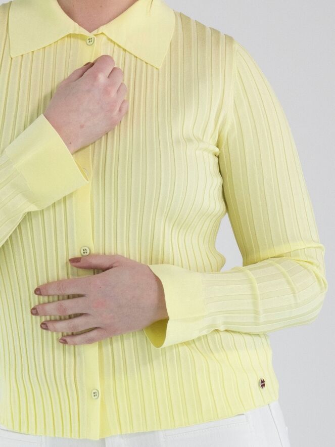 Een vest van Marc Cain in een pastelgele kleur. De stof is breed geribbeld. De kraag en de uiteinden van de lange mouwen zijn fijn geribbeld. Dit vest kan met de hand worden gewassen.