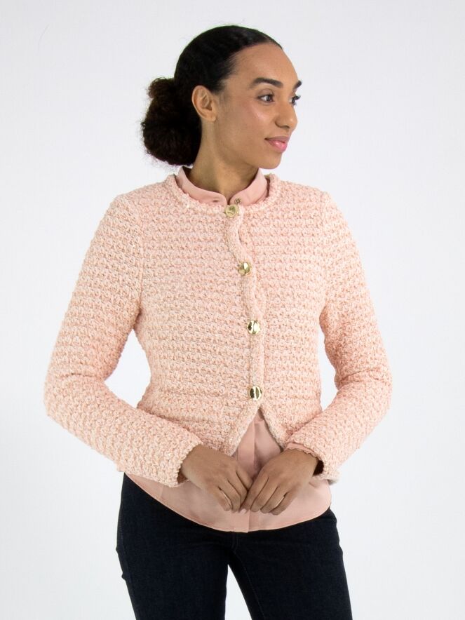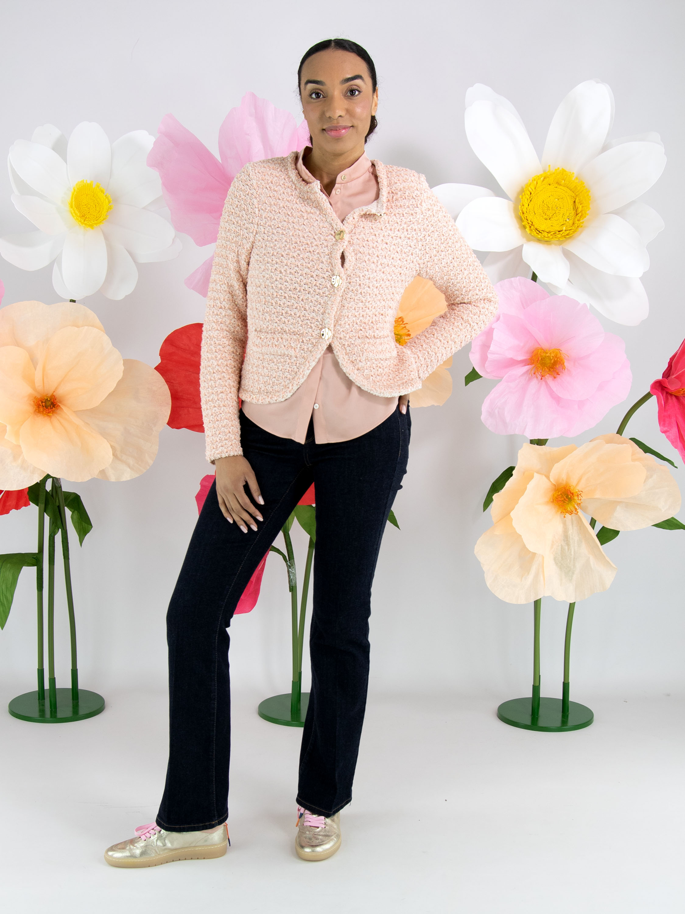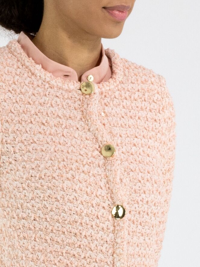 Een chanel blazer van Marc Cain in een gemêleerde stof met de kleuren zalmroze en roomwit, met door de stof heen goudkleurige lovertjes geweven. De blazer heeft een sluiting met 4 decoratieve goudkleurige knopen. De blazer is ongevoerd en mag op de hand worden gewassen.