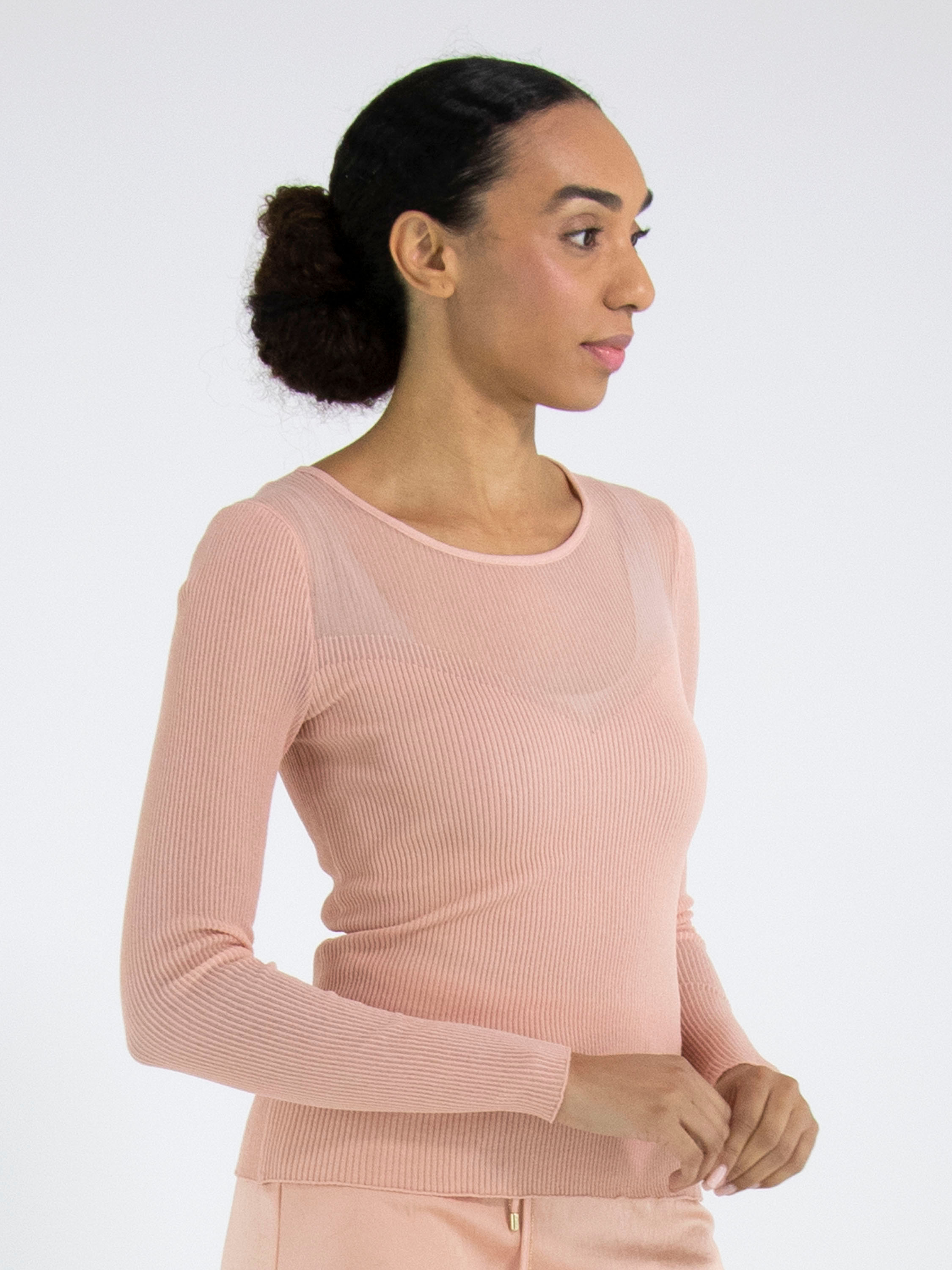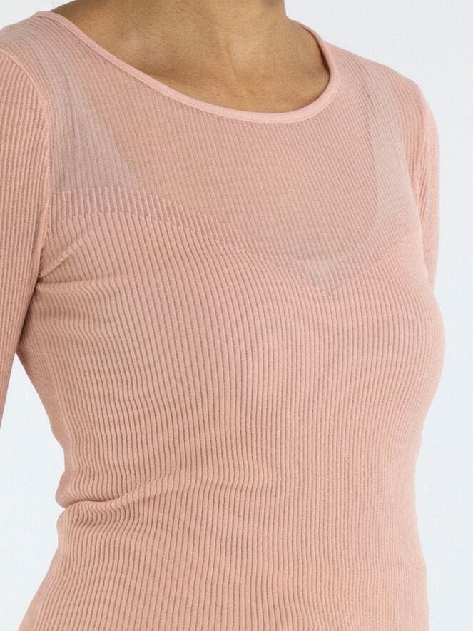 Een pullover van Marc Cain in een fijn geribbelde structuur in de kleur zalmroze. Tot aan de buste is de stof licht transparant. De pullover mag op 30 graden worden gewassen.
