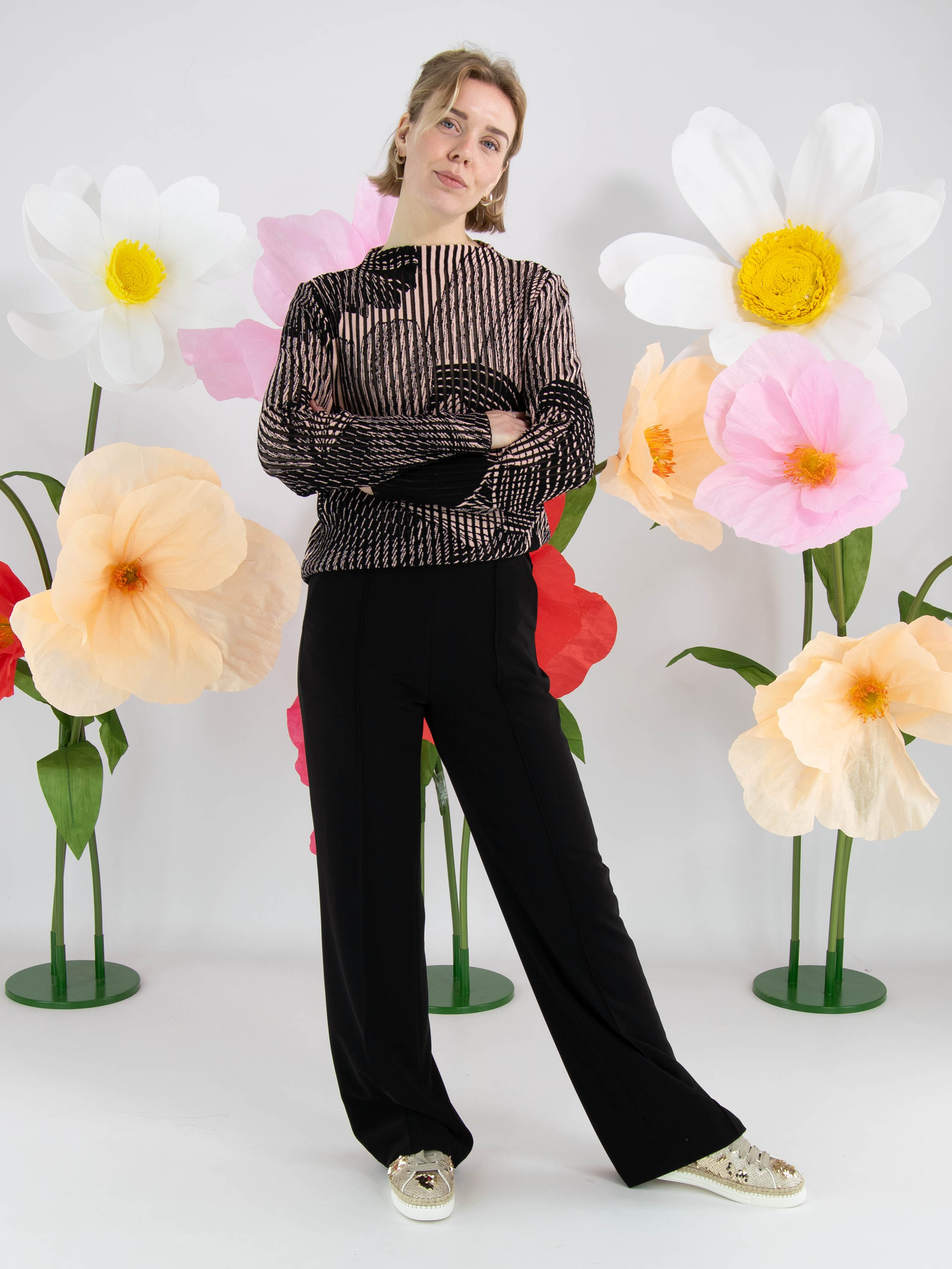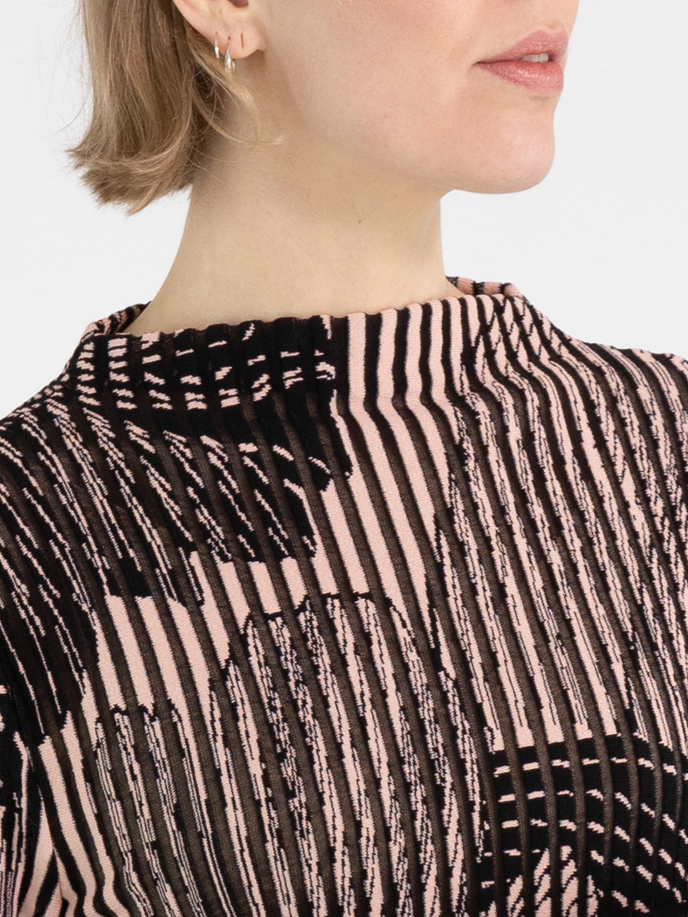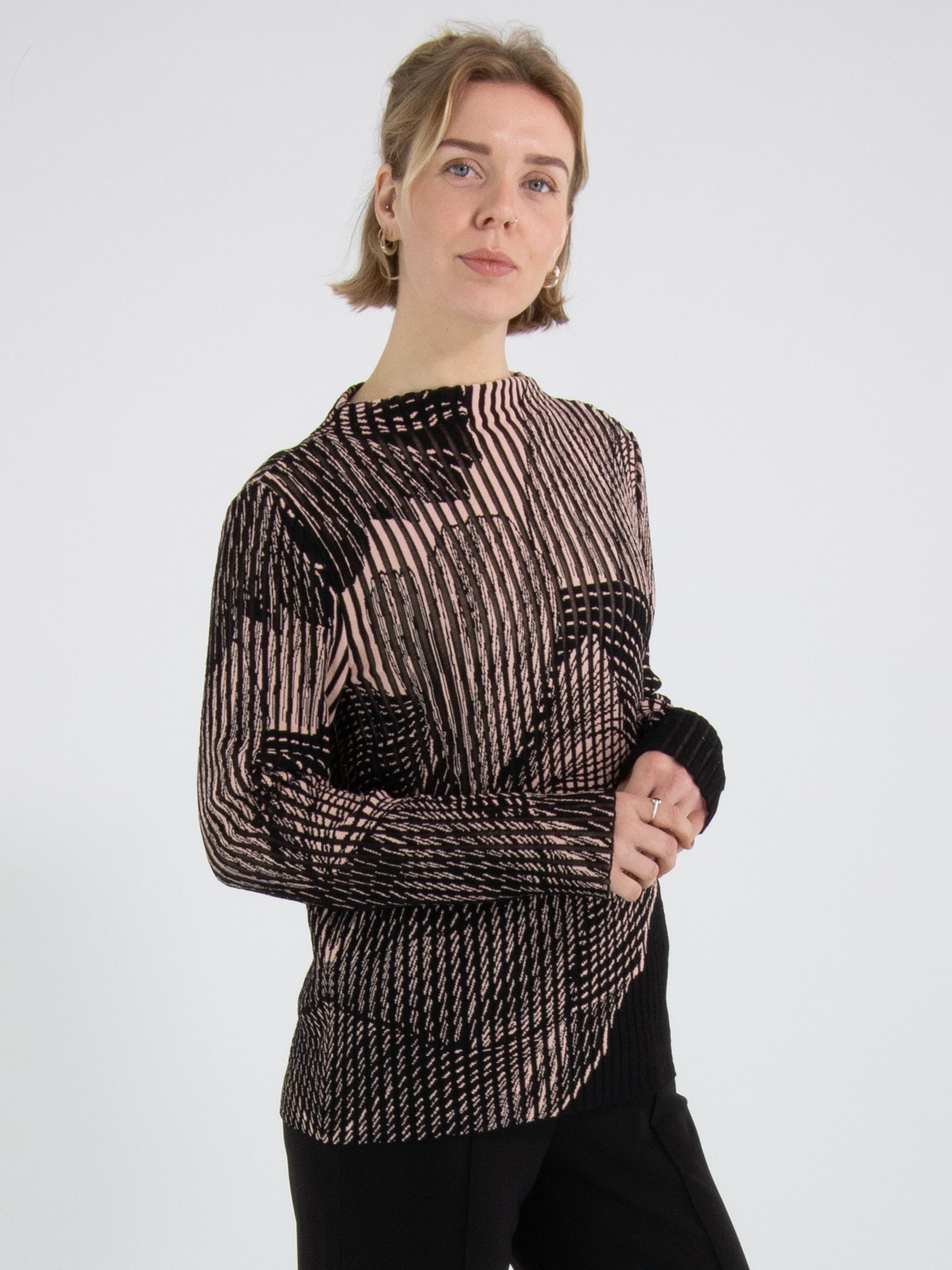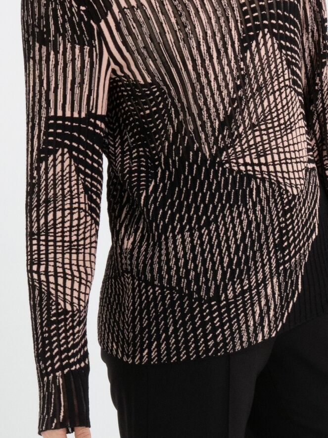 Een pullover van Marc Cain in een verticale streepstructuur waarvan de tussendelen licht transparant zijn. De pullover is uitgevoerd in een grafische print van een grote bloem in de kleuren zwart en zachtroze. De pullover heeft lange mouwen en een hoge hals. Deze pullover mag op 30 graden worden gewassen.
