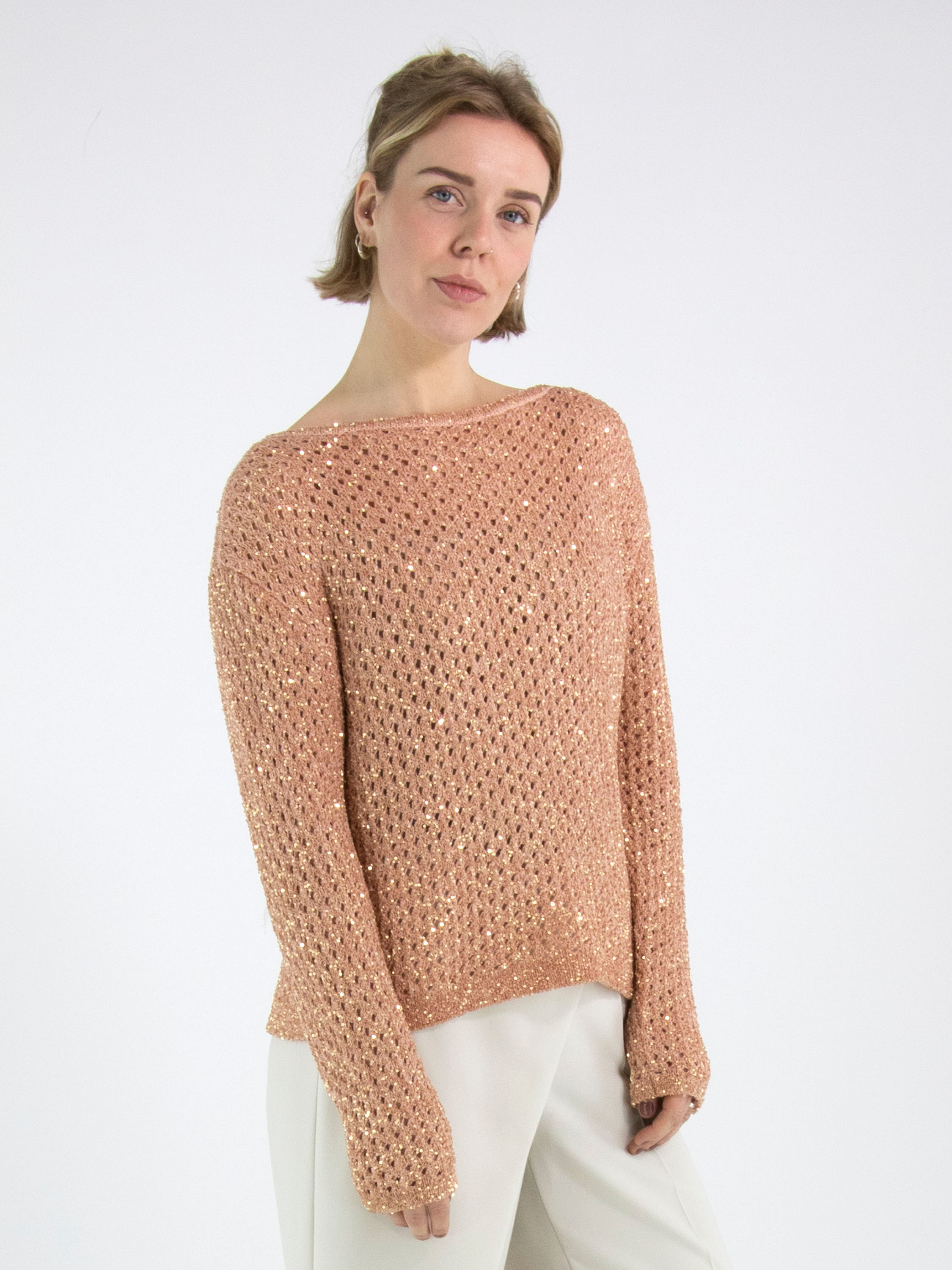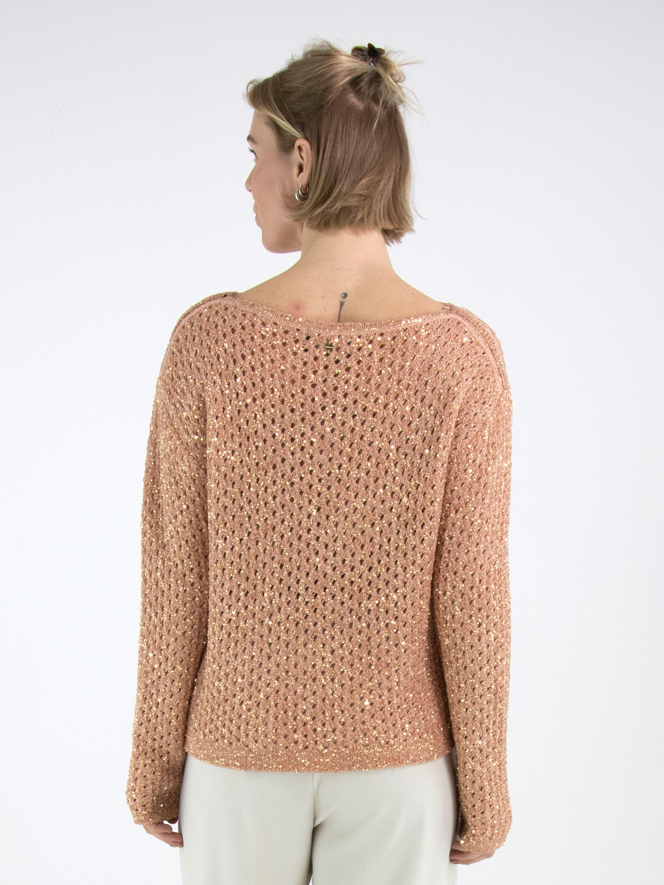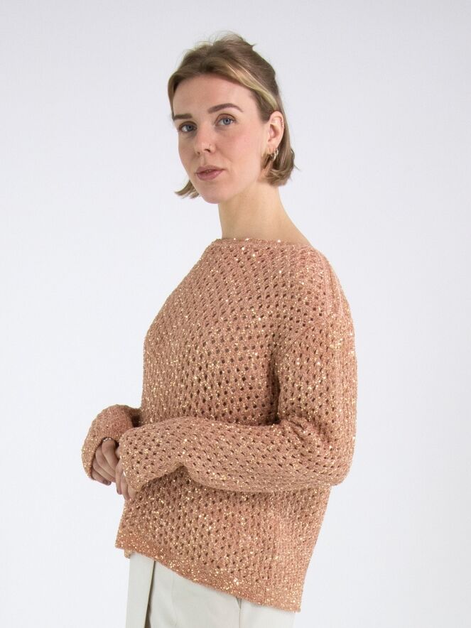 Een open gebreide pullover van Marc Cain in de kleur zalmroze. In de stof zijn goudkleurige pailletten geweven. De pullover heeft een ronde hals en mag op de hand worden gewassen.
