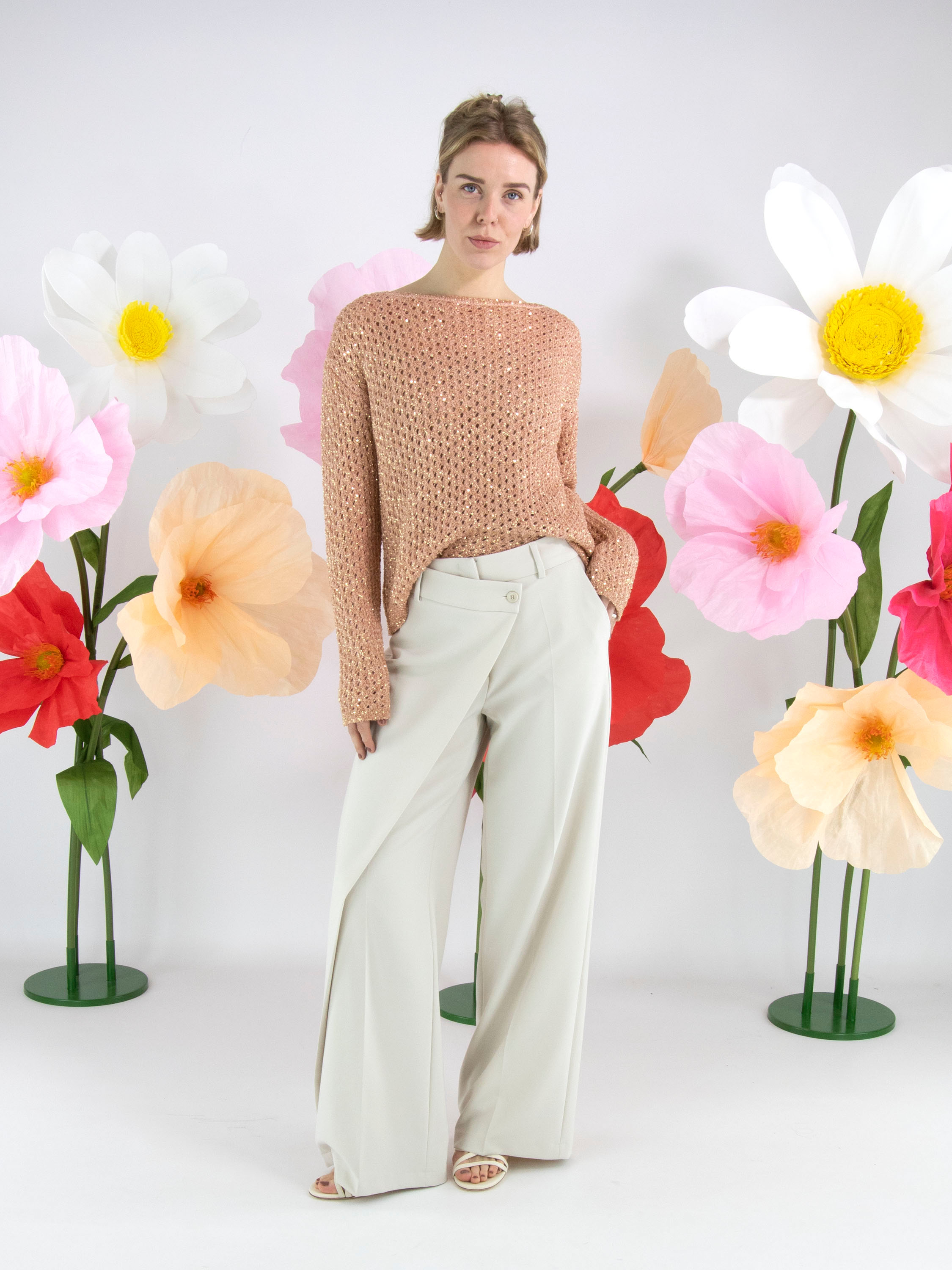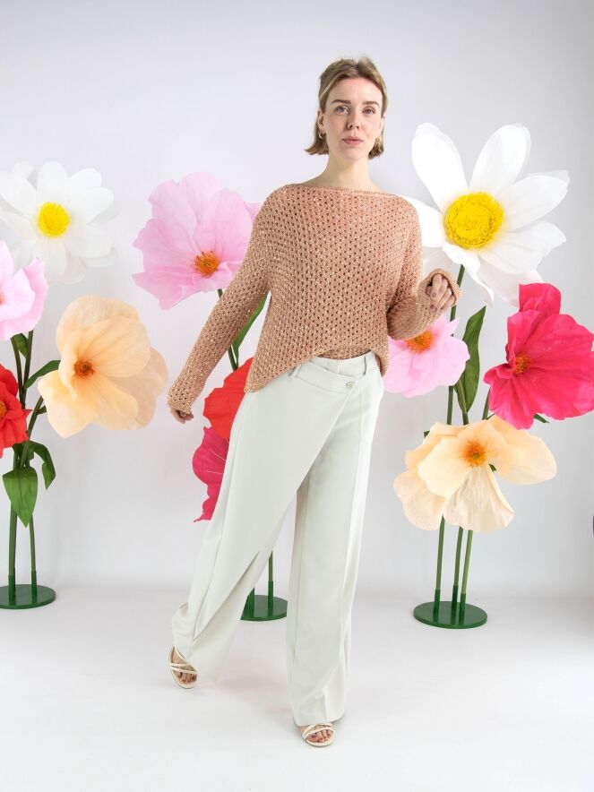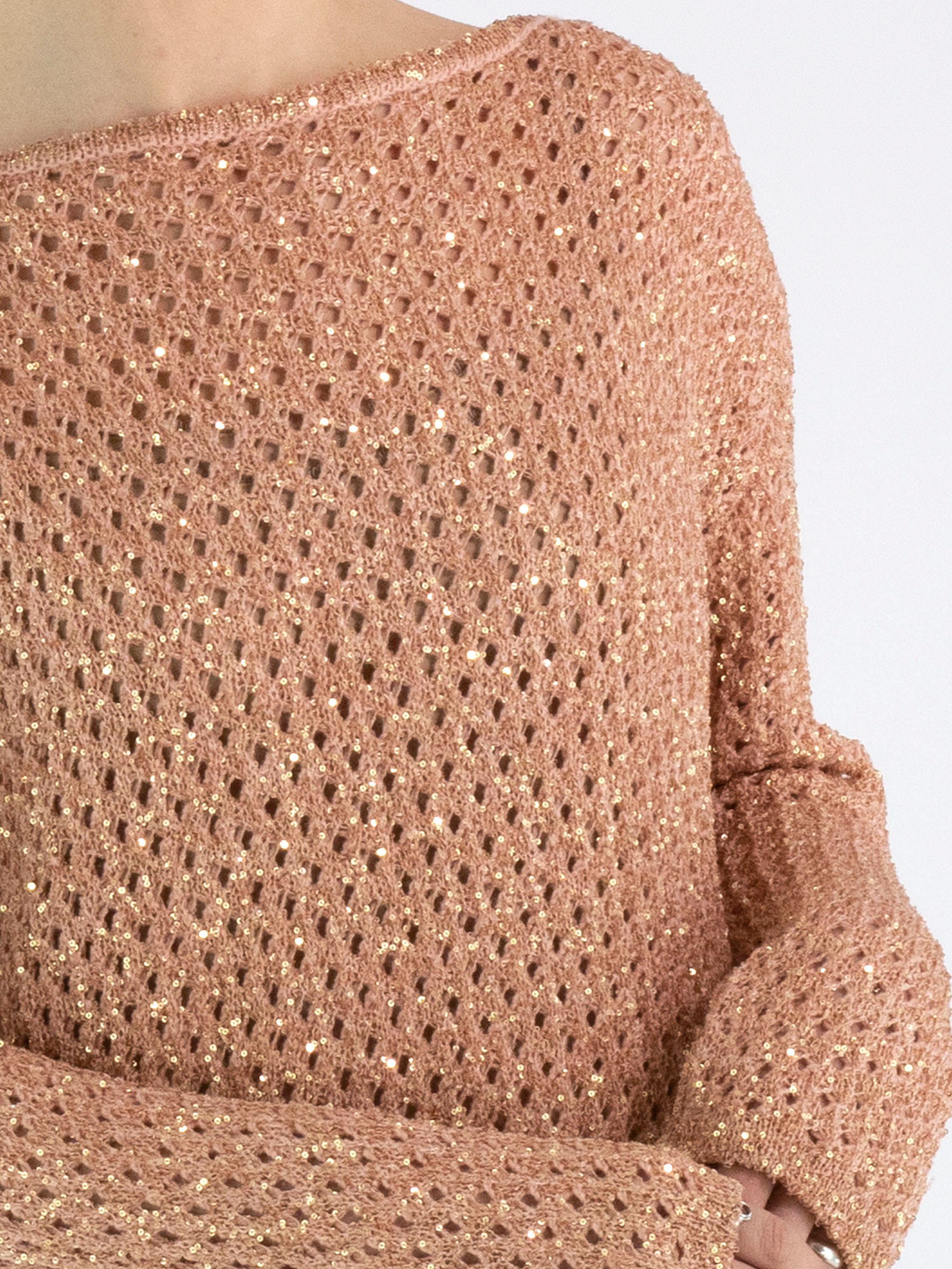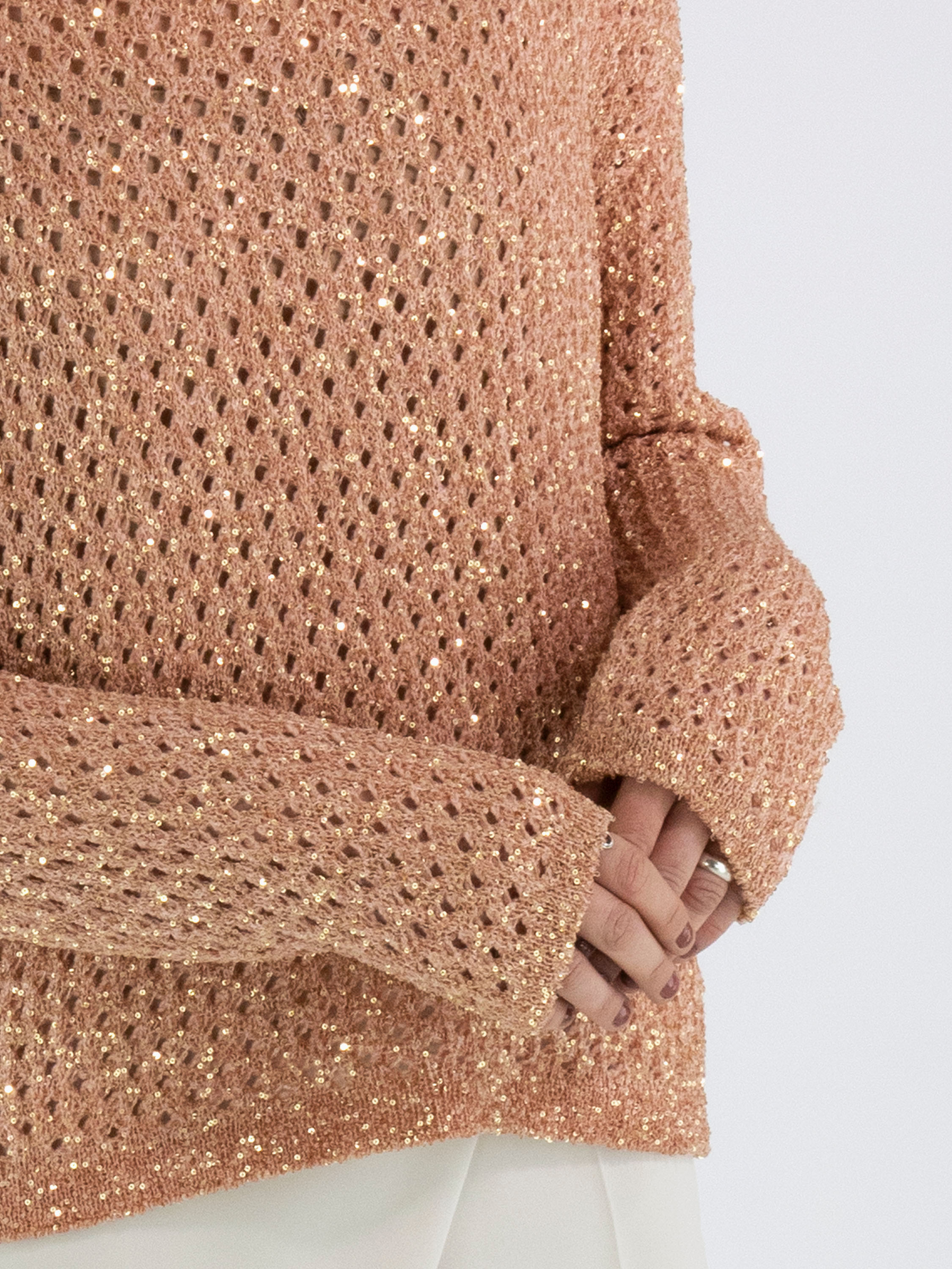 Een open gebreide pullover van Marc Cain in de kleur zalmroze. In de stof zijn goudkleurige pailletten geweven. De pullover heeft een ronde hals en mag op de hand worden gewassen.