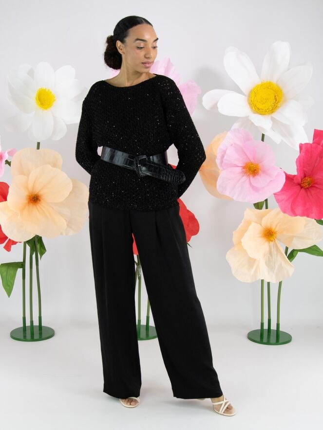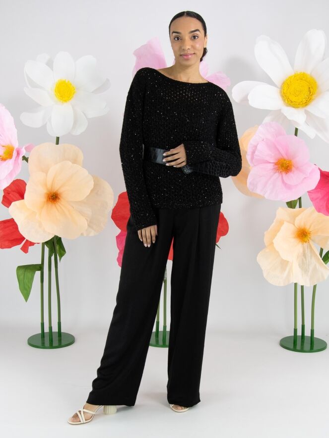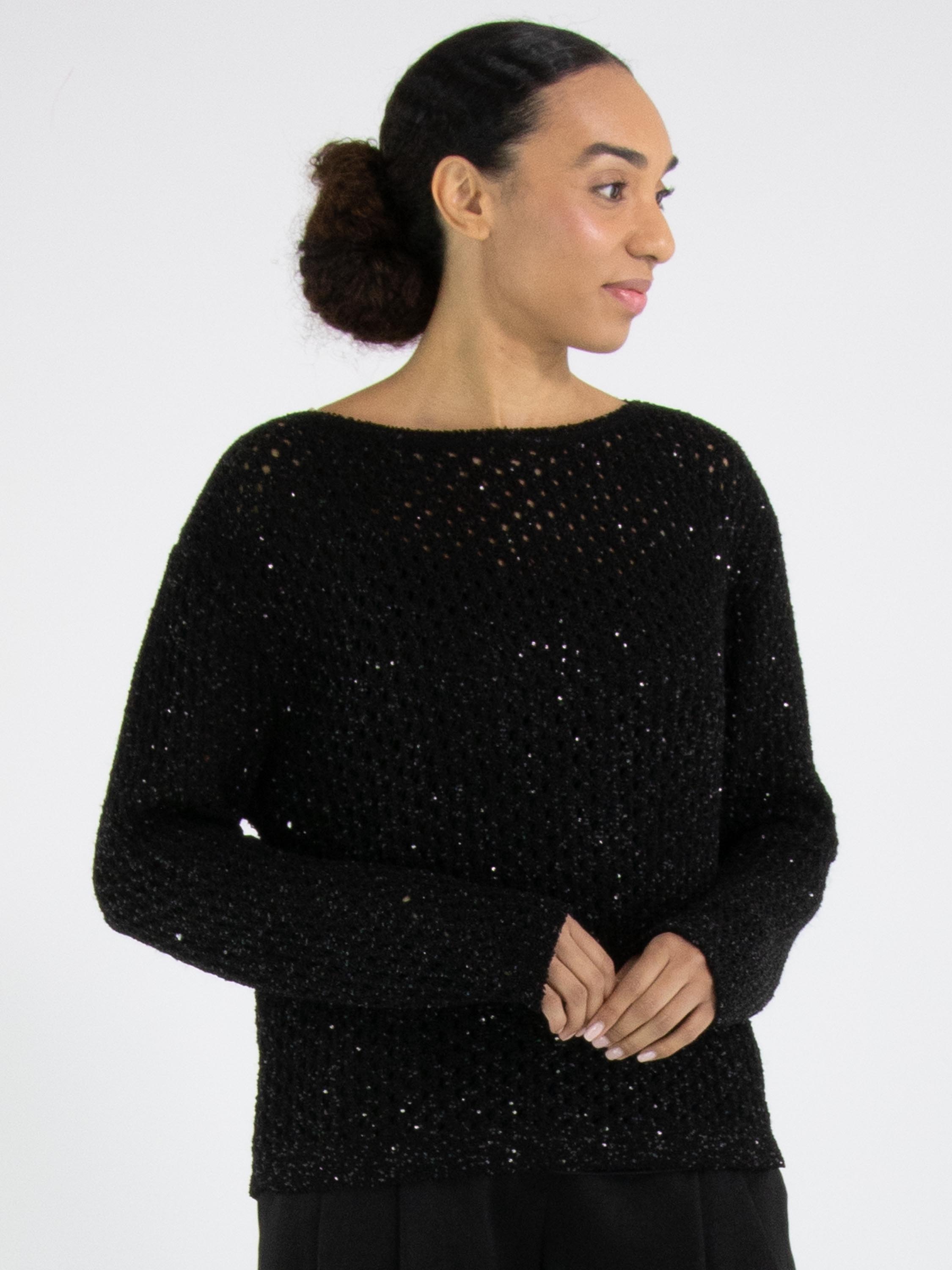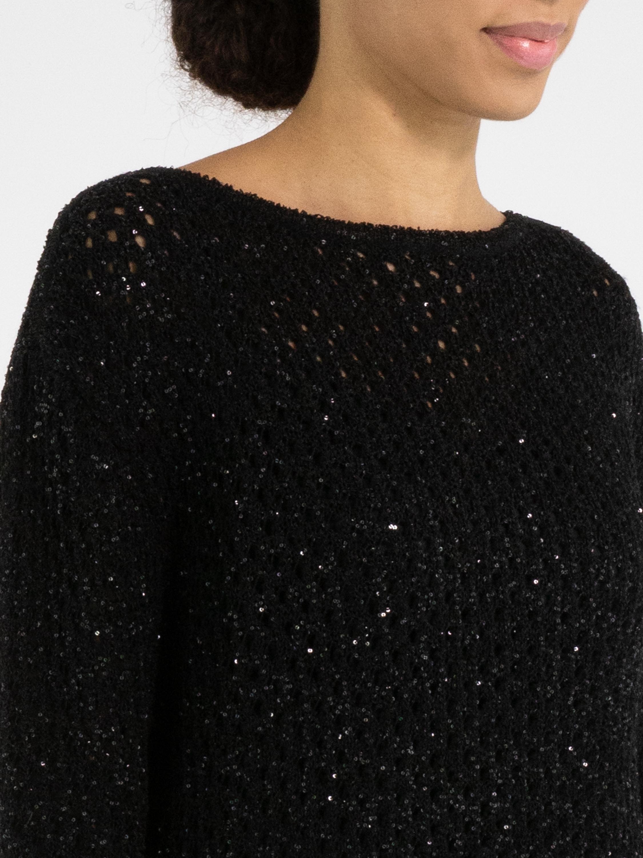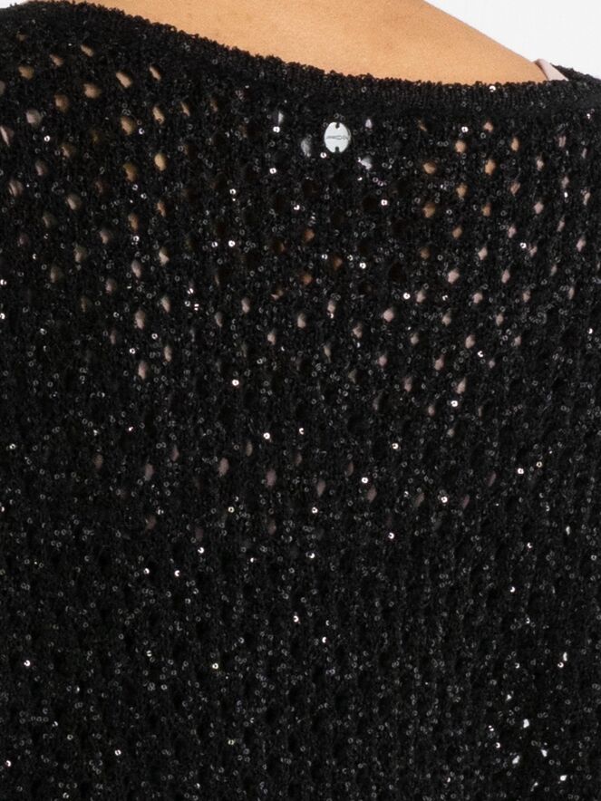 Een open gebreide pullover van Marc Cain in de kleur zwart. In de stof zijn zwartkleurige pailletten geweven. De pullover heeft een ronde hals en mag op de hand worden gewassen.