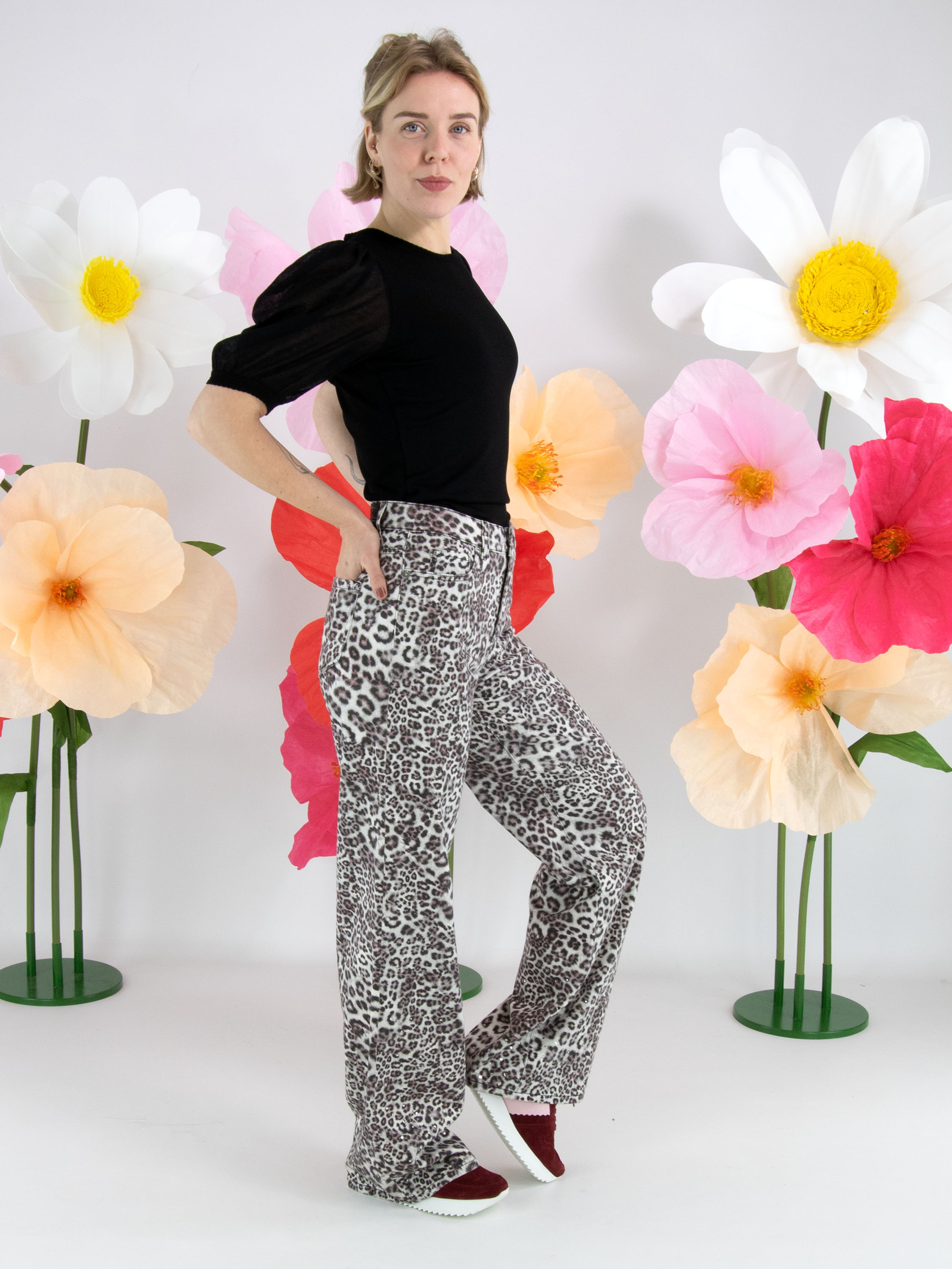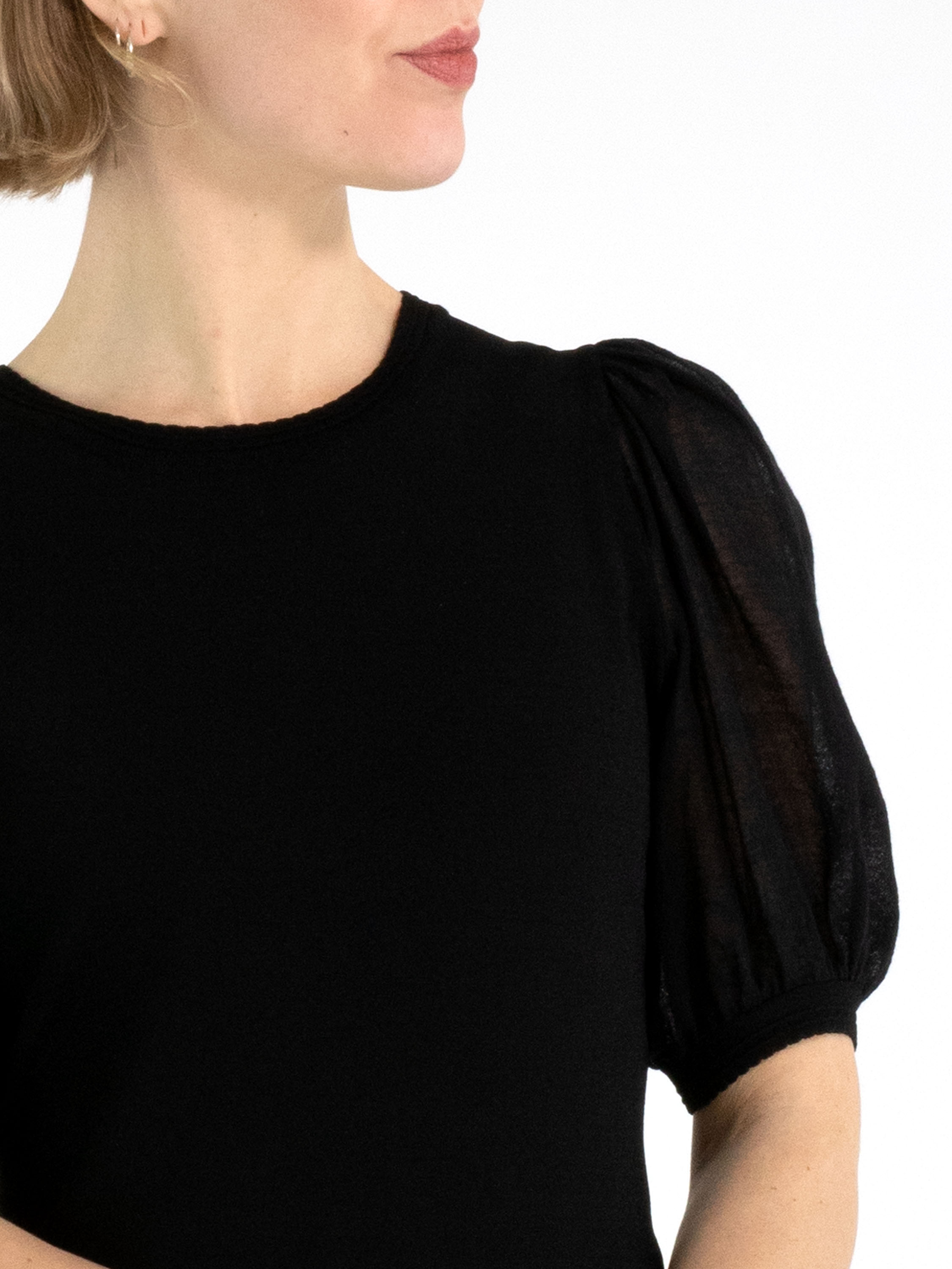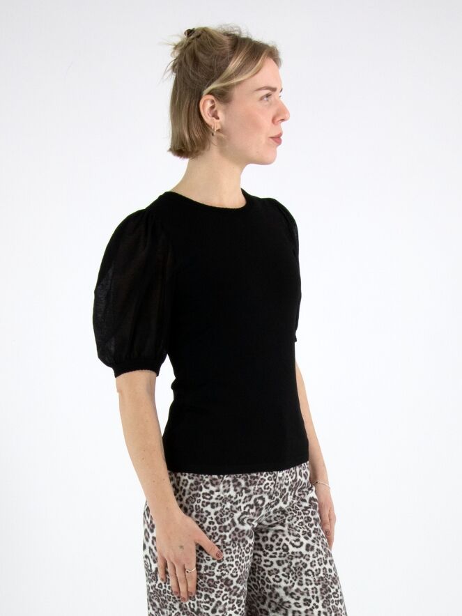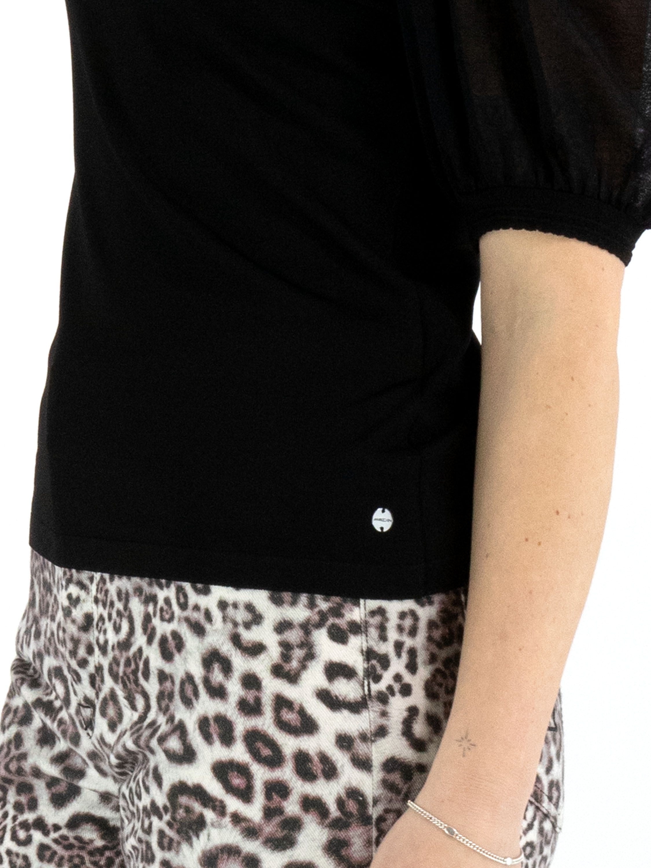 Een shirt van Marc Cain in de kleur zwart. Het shirt heeft licht transparante pofmouwen waarbij de stof bij de mouwinzet en bij de bies aan het uiteinde fijn geplooid is. Langs de ronde hals is een geschulpte bies. Dit shirt mag op 30 graden worden gewassen.