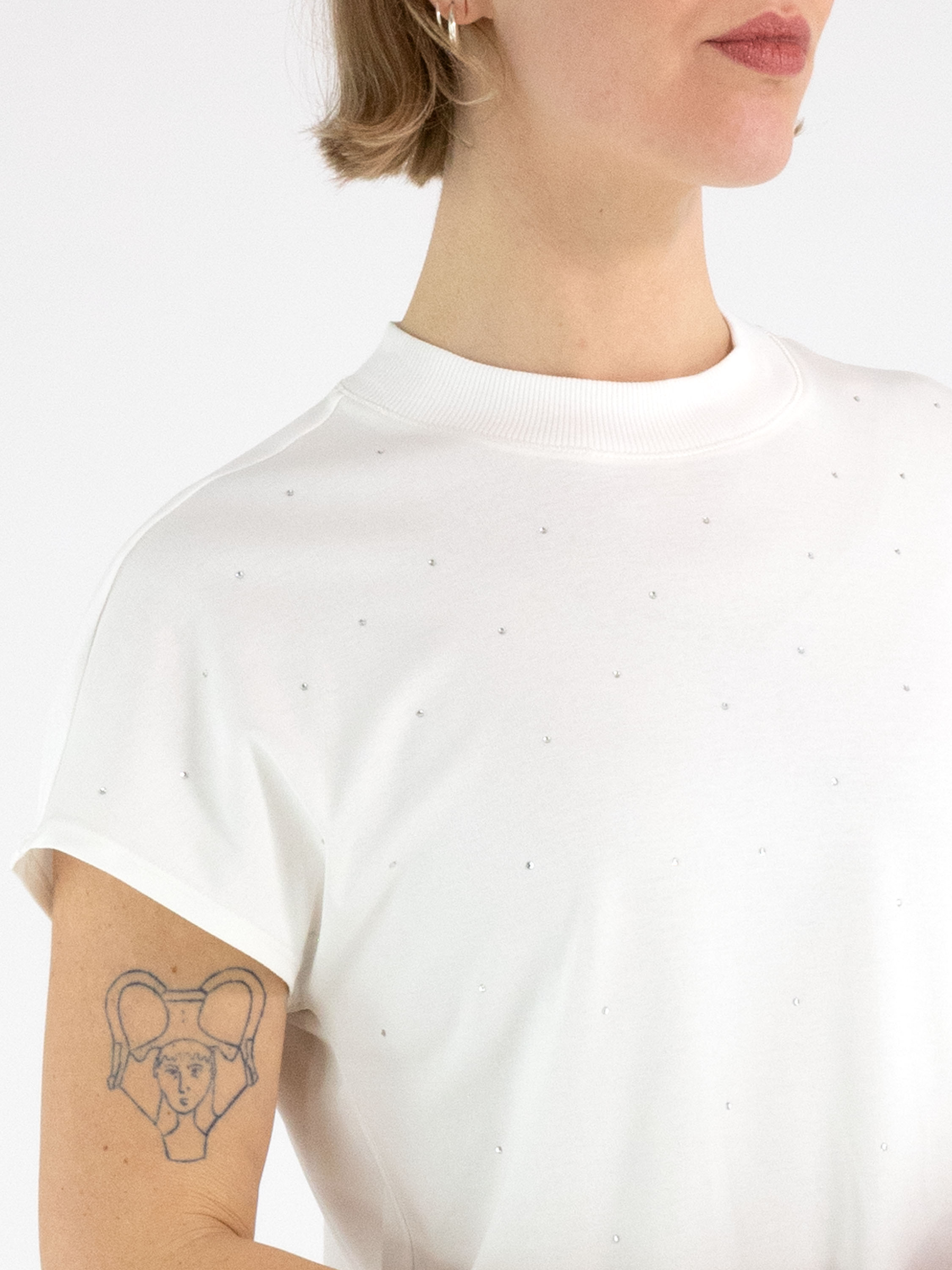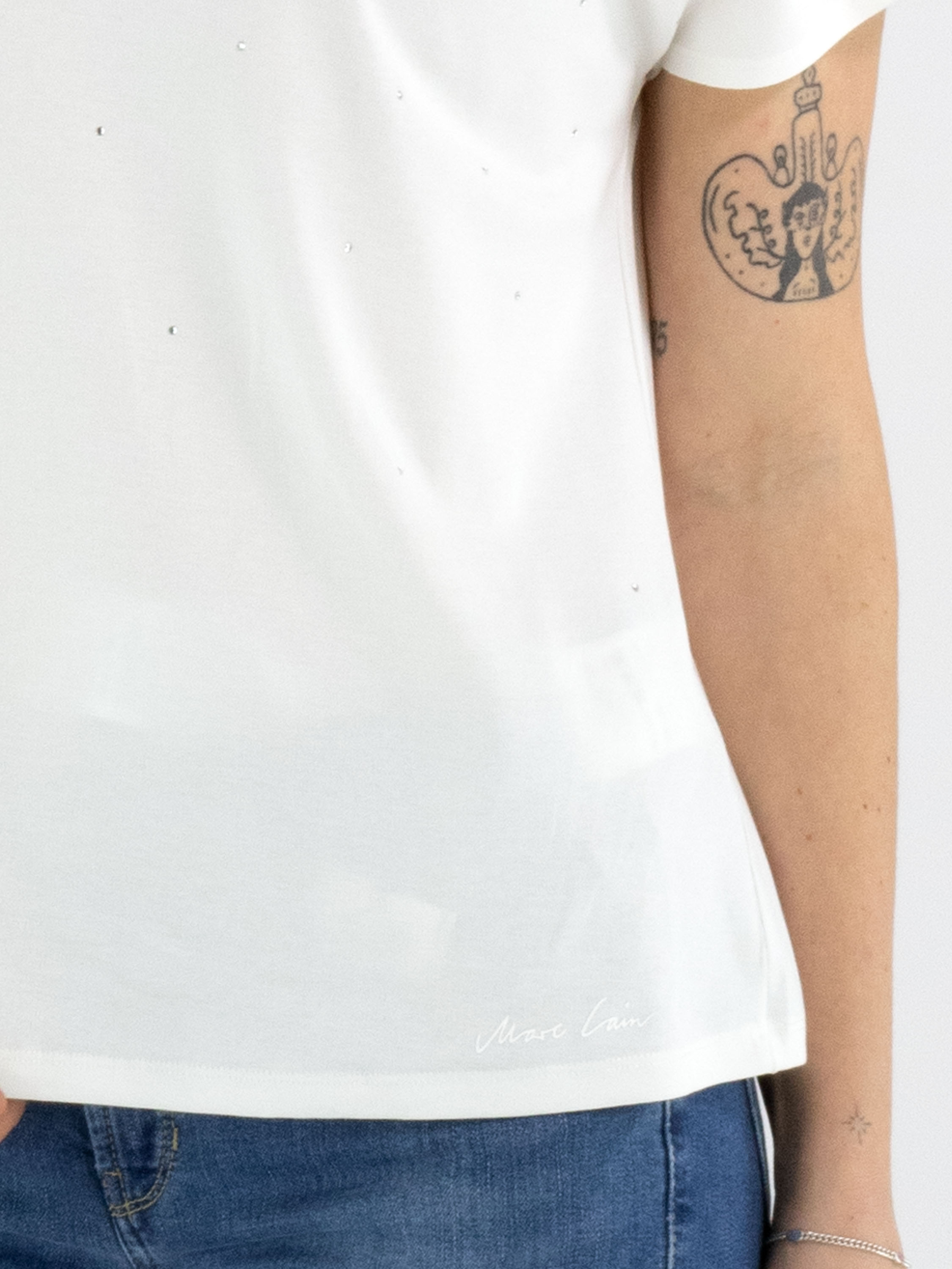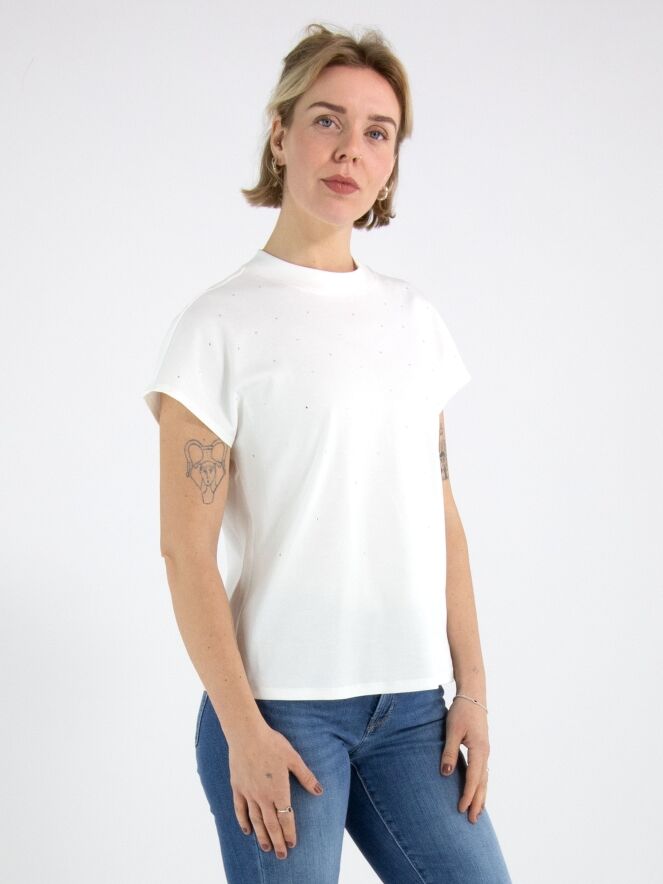 Een shirt van Marc Cain in de kleur roomwit. Aan de voorzijde zijn decoratieve strassteentjes verspreid over de stof. Langs de rand van de hoge ronde hals is een fijn geribbelde tricot bies. Het shirt heeft een kopmouwtje en mag op 30 graden worden gewassen.