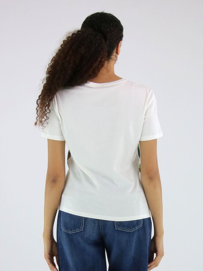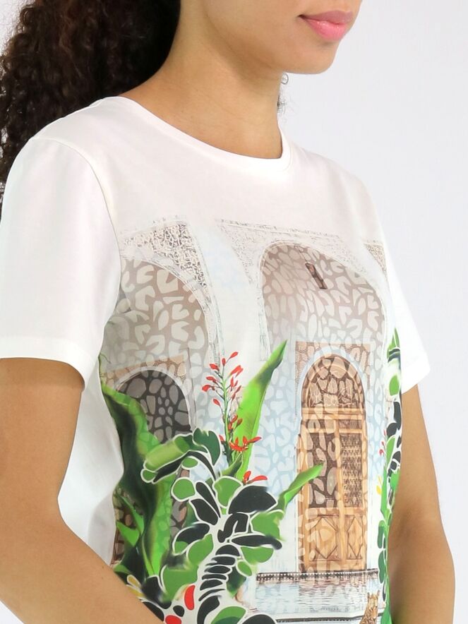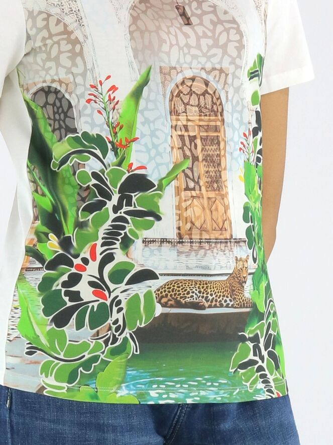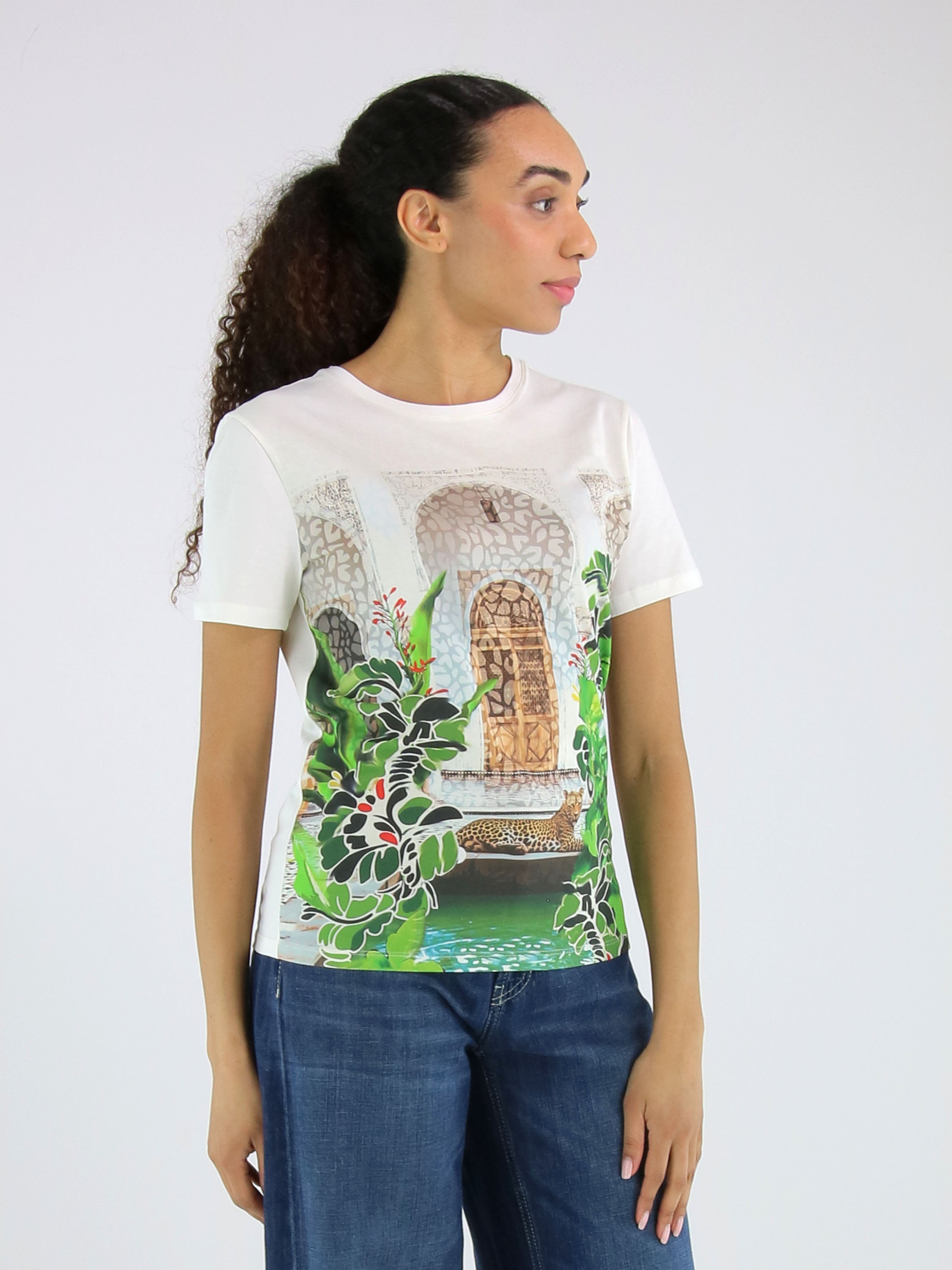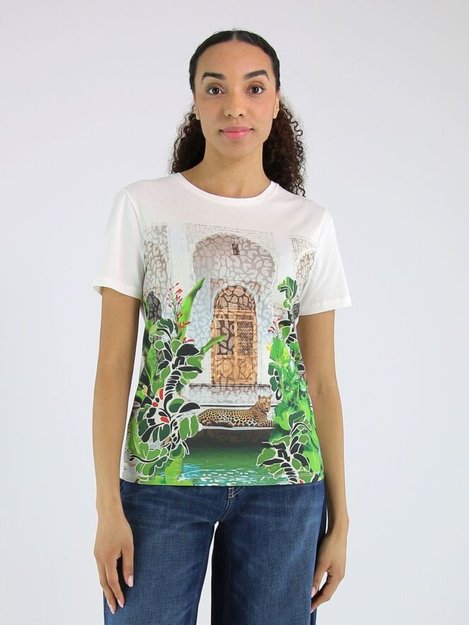 Shirt van Marc Cain in een multicolor print van een luipaard liggend in een Arabische tuin op een roomwitte achtergrond. De rijke illustratie geeft het ontwerp een uitgesproken en artistieke uitstraling. Het shirt heeft een ronde hals en korte mouwen. Dit shirt kan op 30 graden worden gewassen.