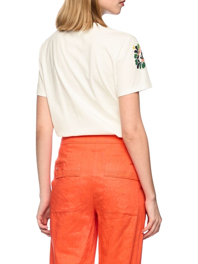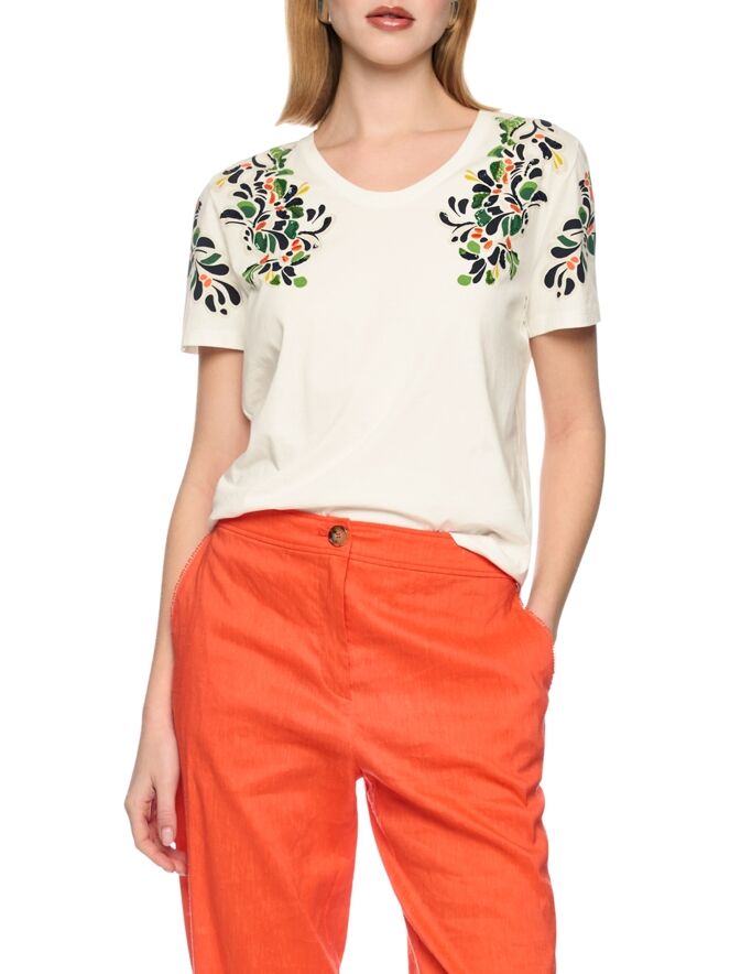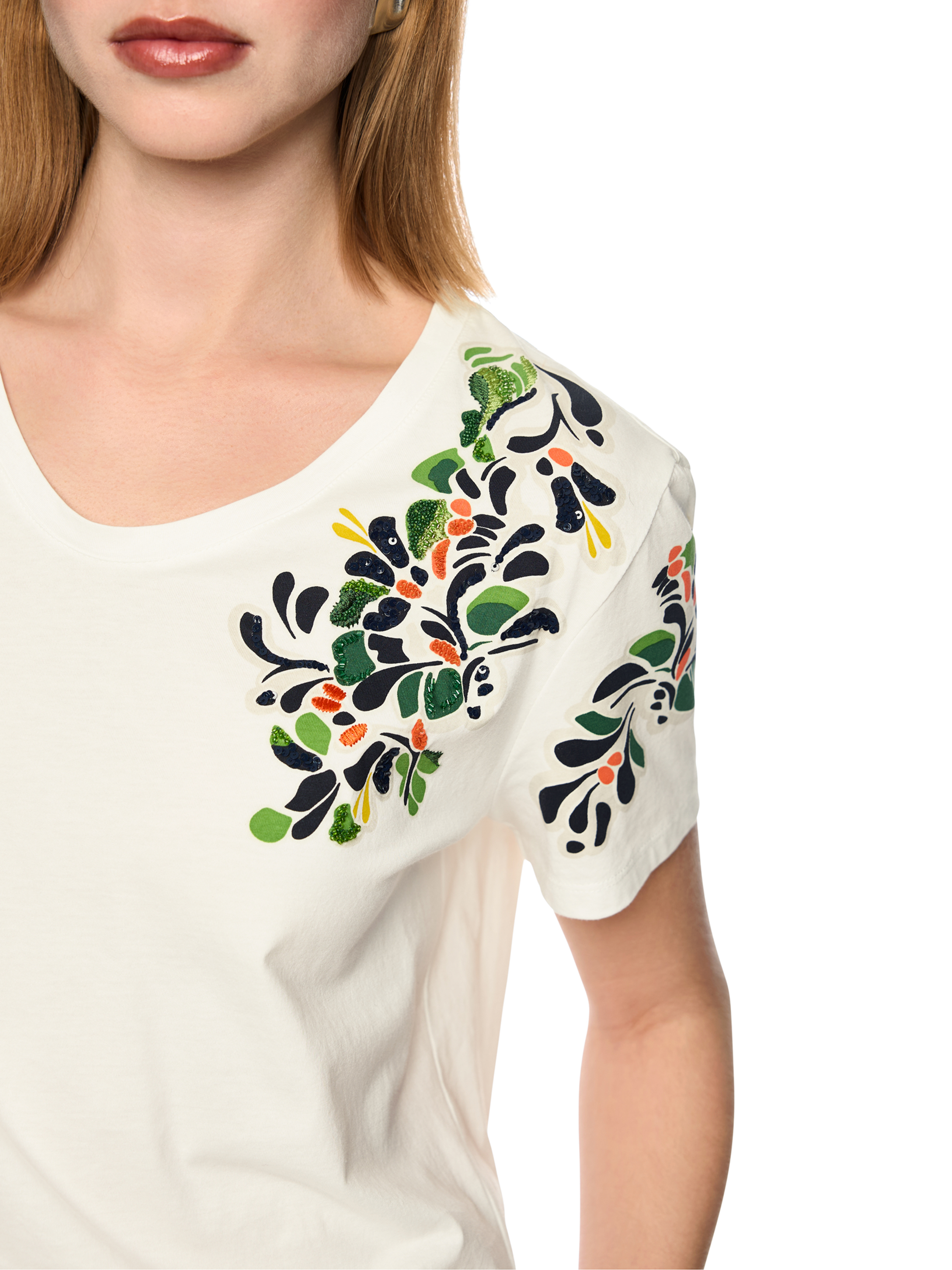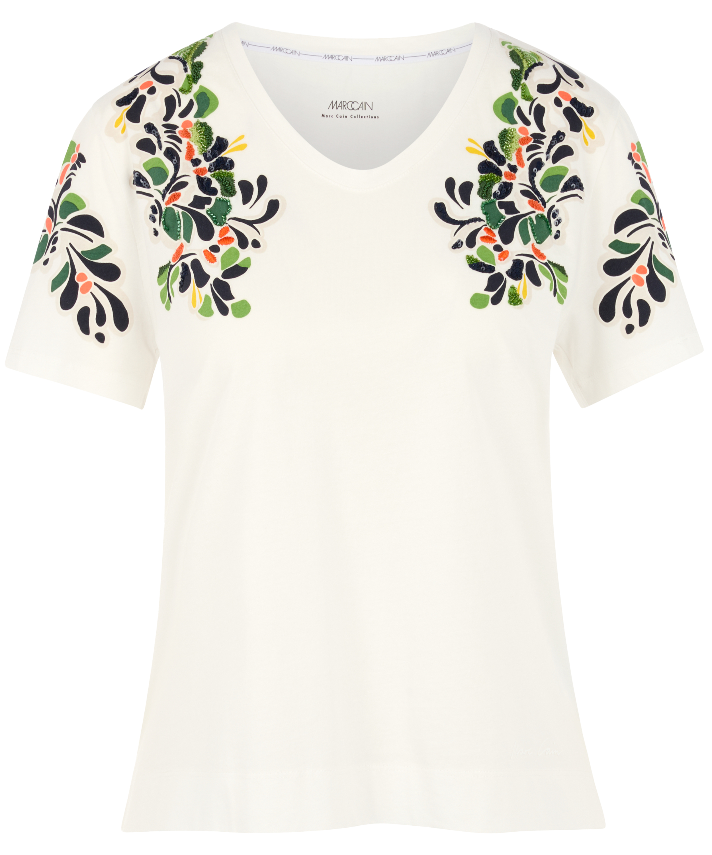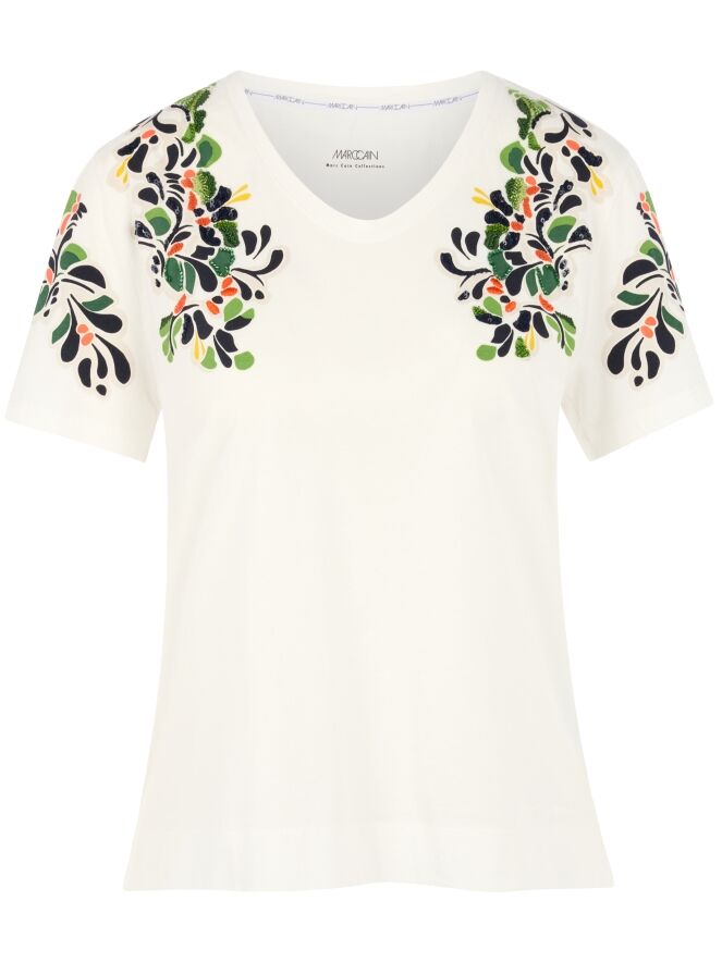 Shirt van Marc Cain in een roomwitte tint. Vanuit de schouders loopt aan de voorzijde tot aan de buste en over de korte mouwen een jacquardprint in meerdere tinten groen, koraalrood, beige en zwart. In de print zijn subtiel strassteentjes en lovertjes verwerkt in diverse tinten, wat zorgt voor een verfijnde en luxe uitstraling. Dit shirt kan op 30 graden worden gewassen.