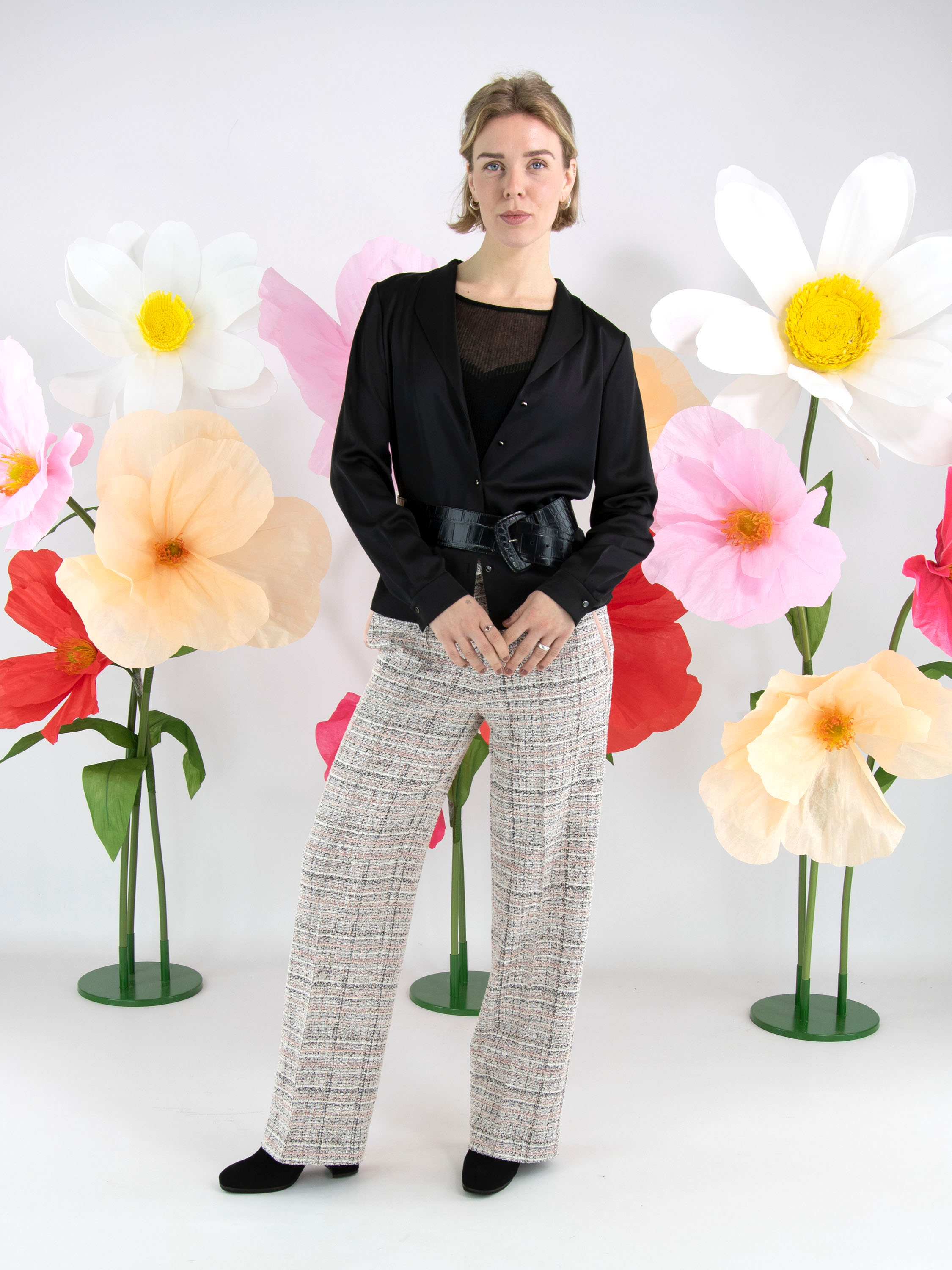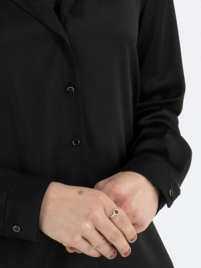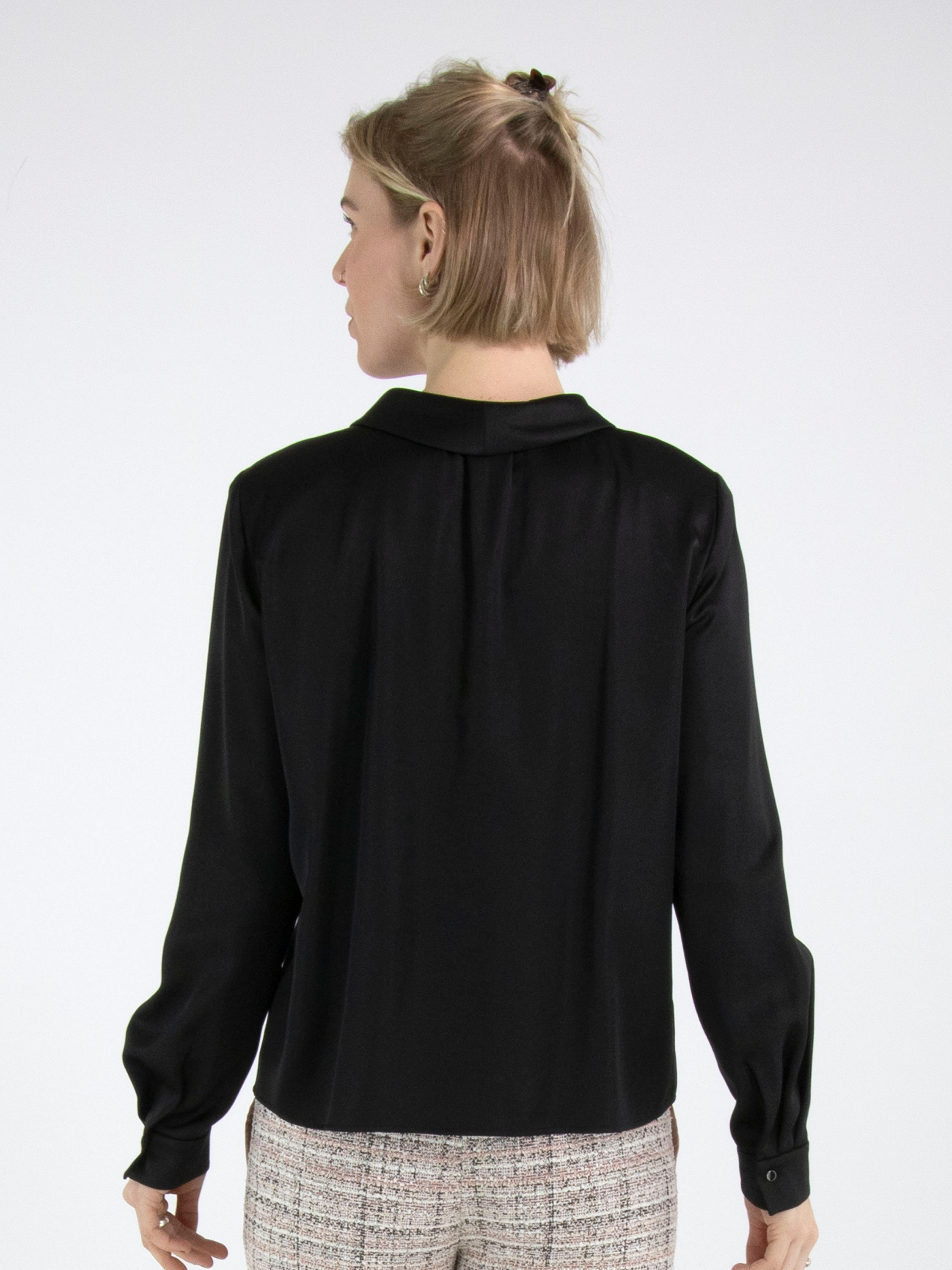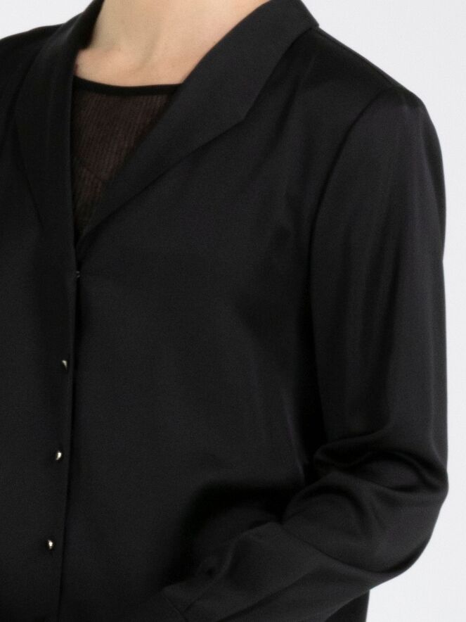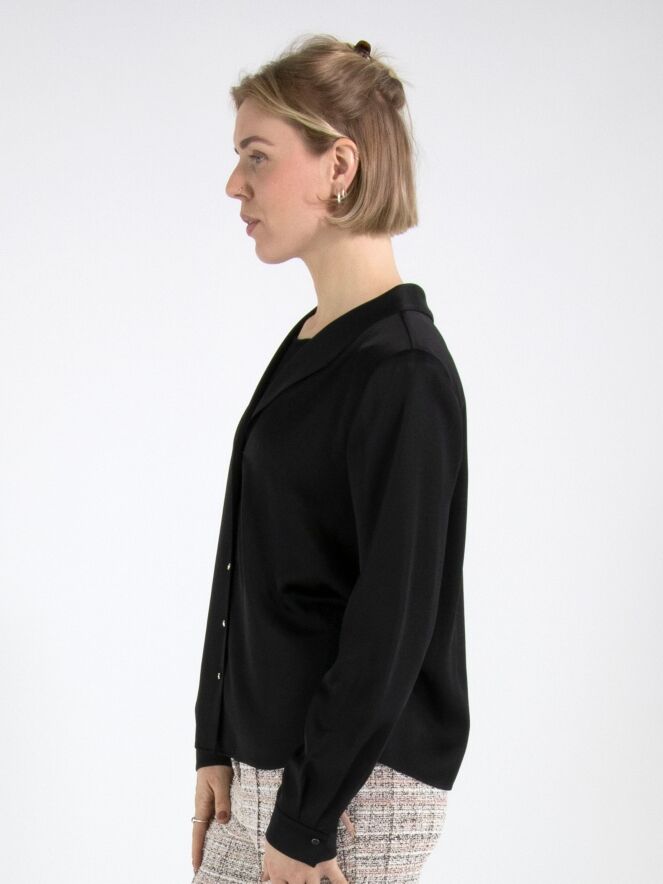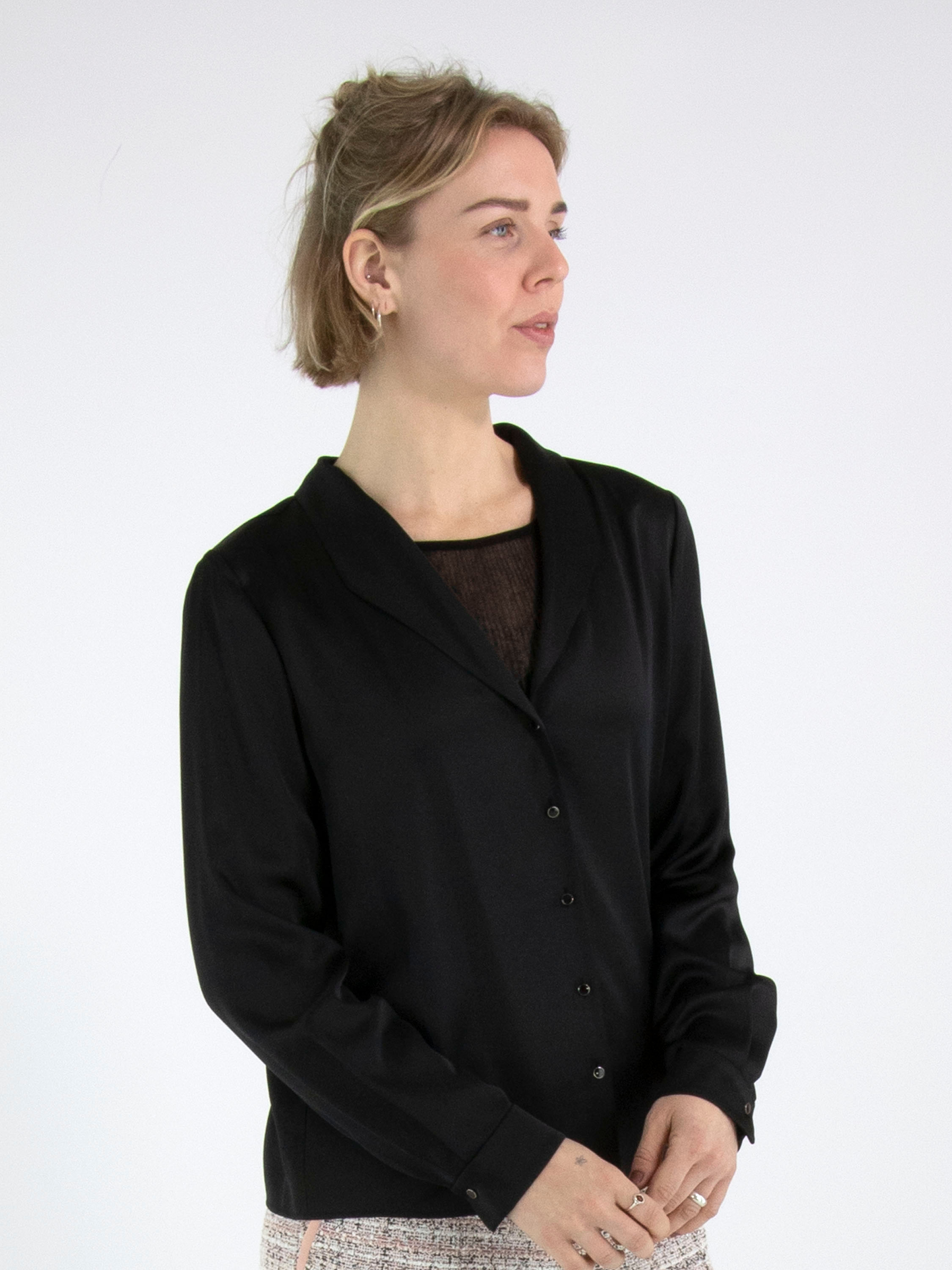 Een blouse van Marc Cain in een mat satijnen stof in de kleur zwart. De blouse heeft een knoopsluiting. Bij de manchetten heeft de stof meerdere plooien. Deze blouse mag op 30 graden worden gewassen.