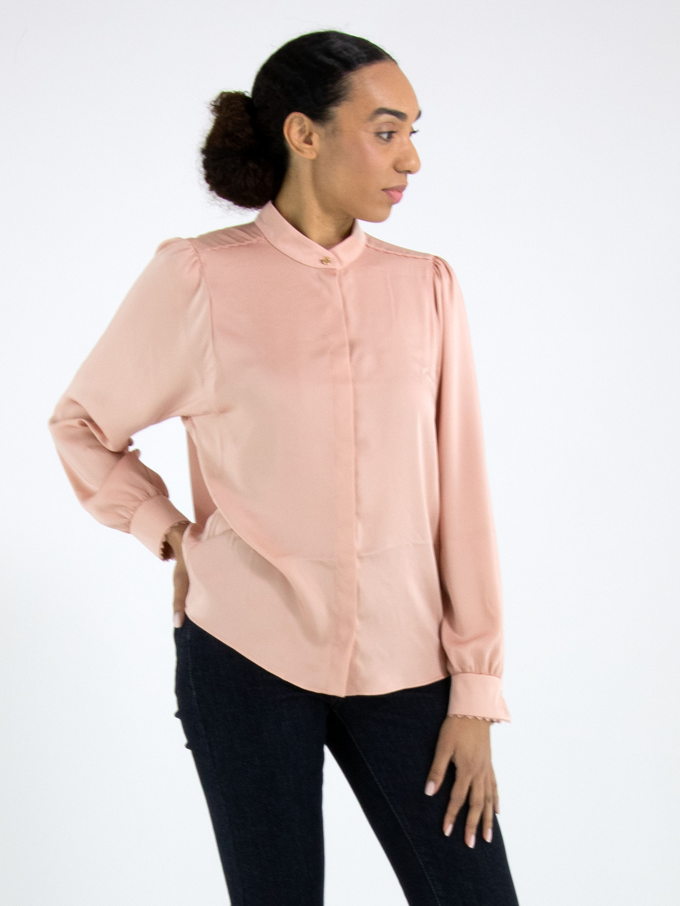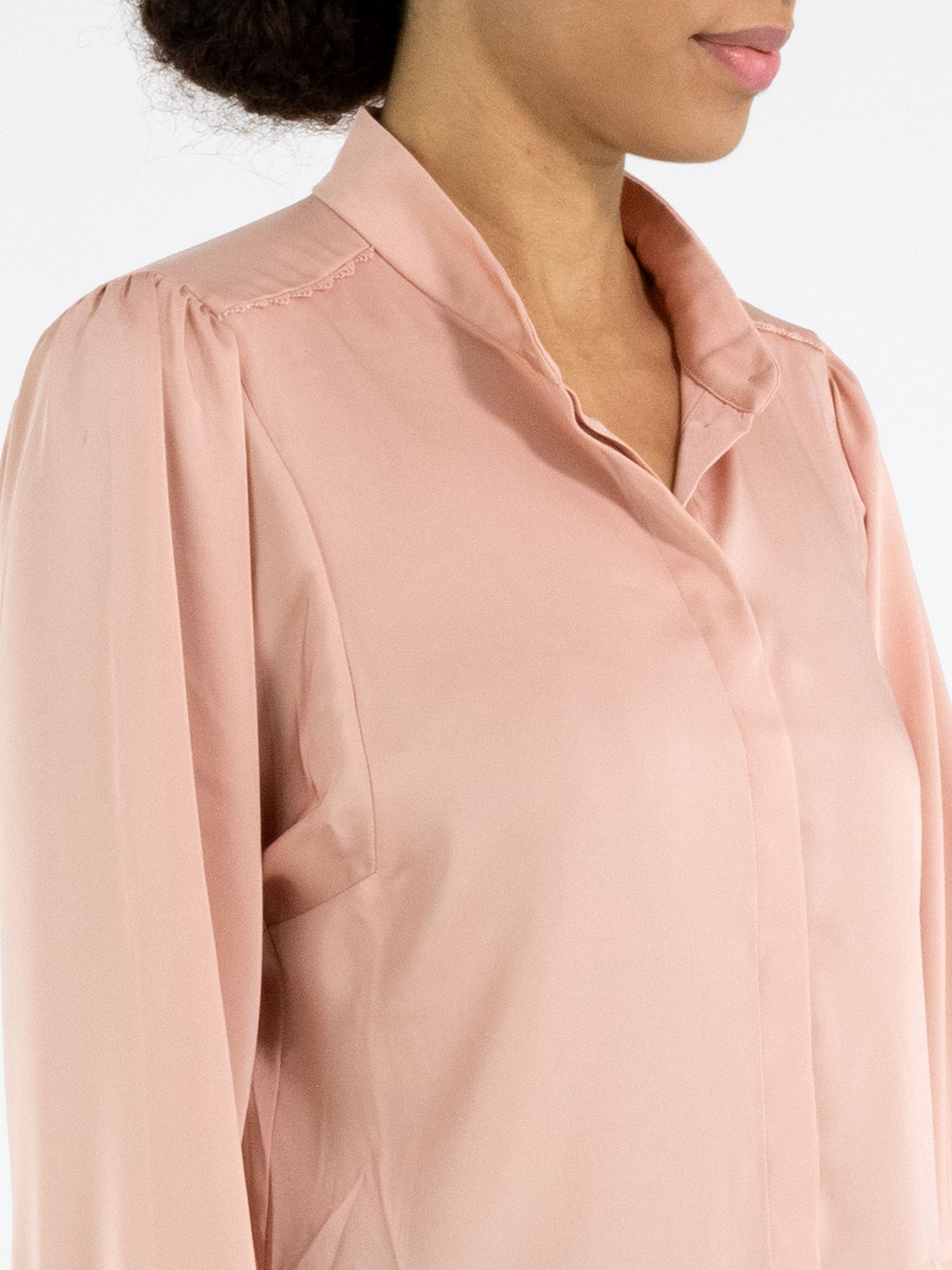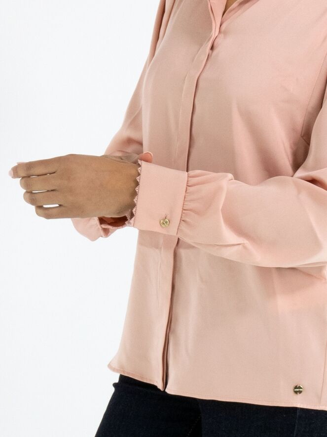 Een blouse van Marc Cain in de kleur roze. De blouse heeft een blinde sluiting. Langs de stiknaad op de schouders en langs de rand van de manchetten van de lange mouwen is een decoratieve golvende draadbies. De stof van de blouse is bij de manchetten fijn geplooid. Deze blouse mag op 30 graden worden gewassen.