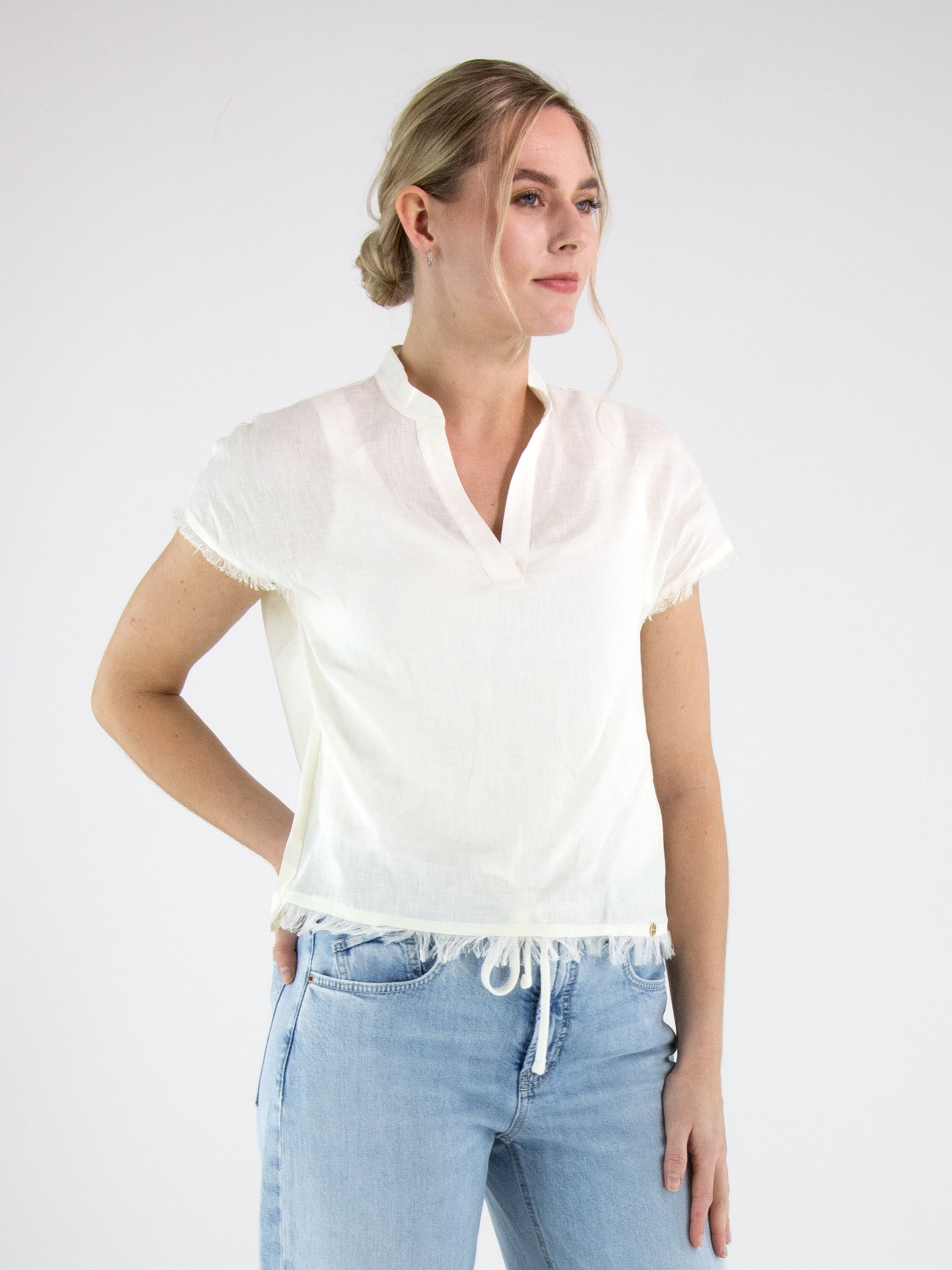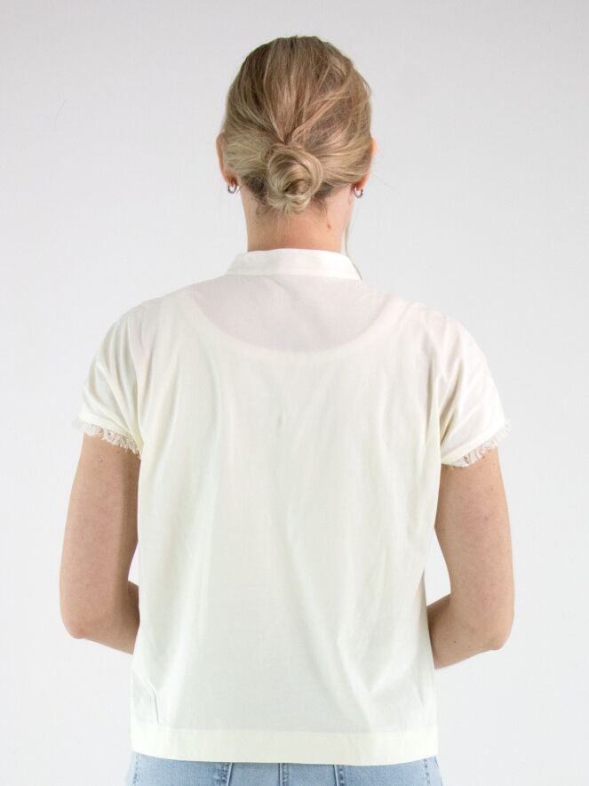Shirt van Marc Cain in een elegante roomwitte tint. Het shirt heeft een V-hals en is langs de randen van de mouwinzet en de onderzijde fijn gerafeld afgewerkt, wat zorgt voor een subtiel nonchalant en eigentijds detail. Dit shirt kan op 30 graden worden gewassen.