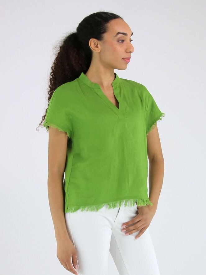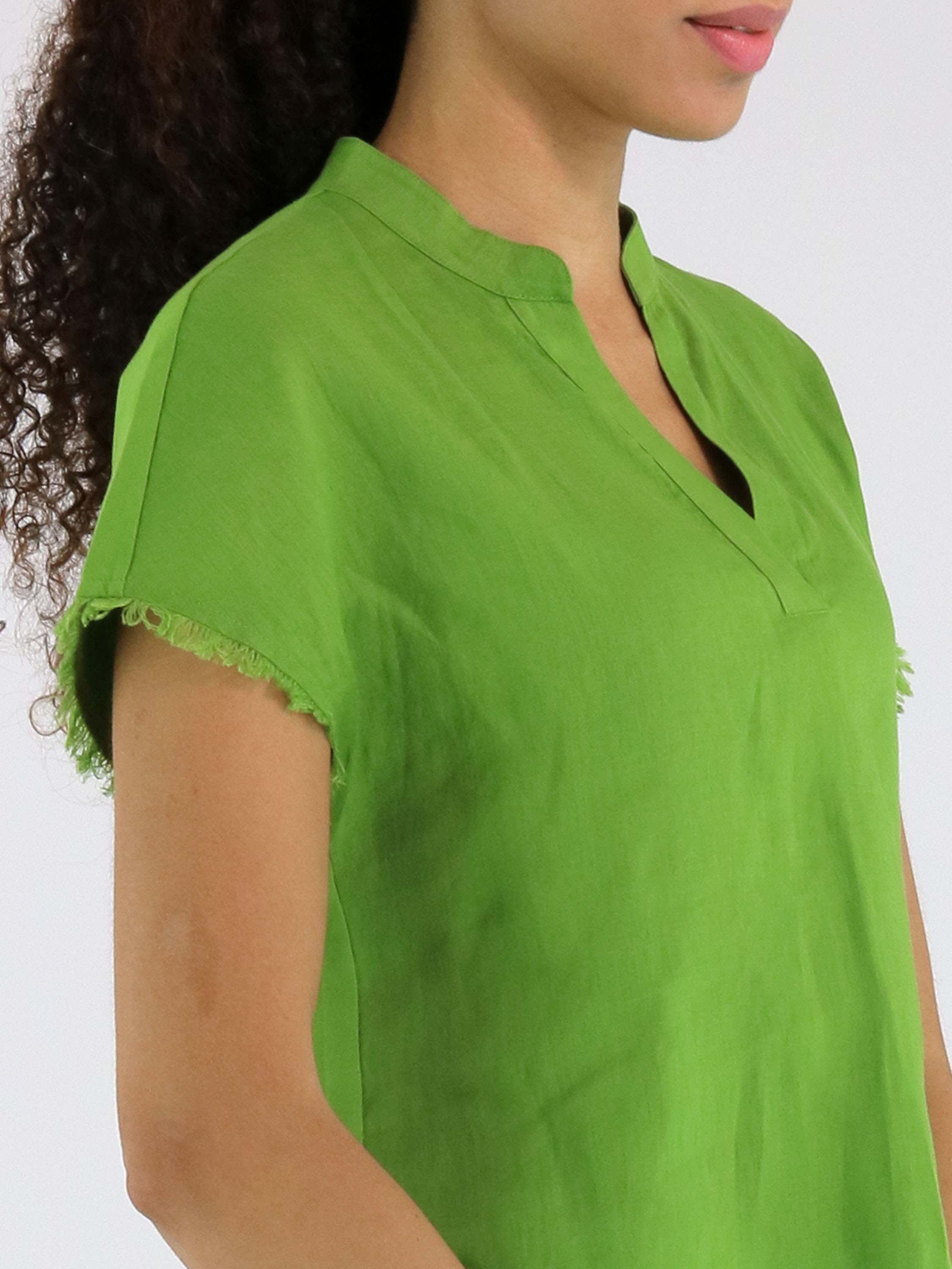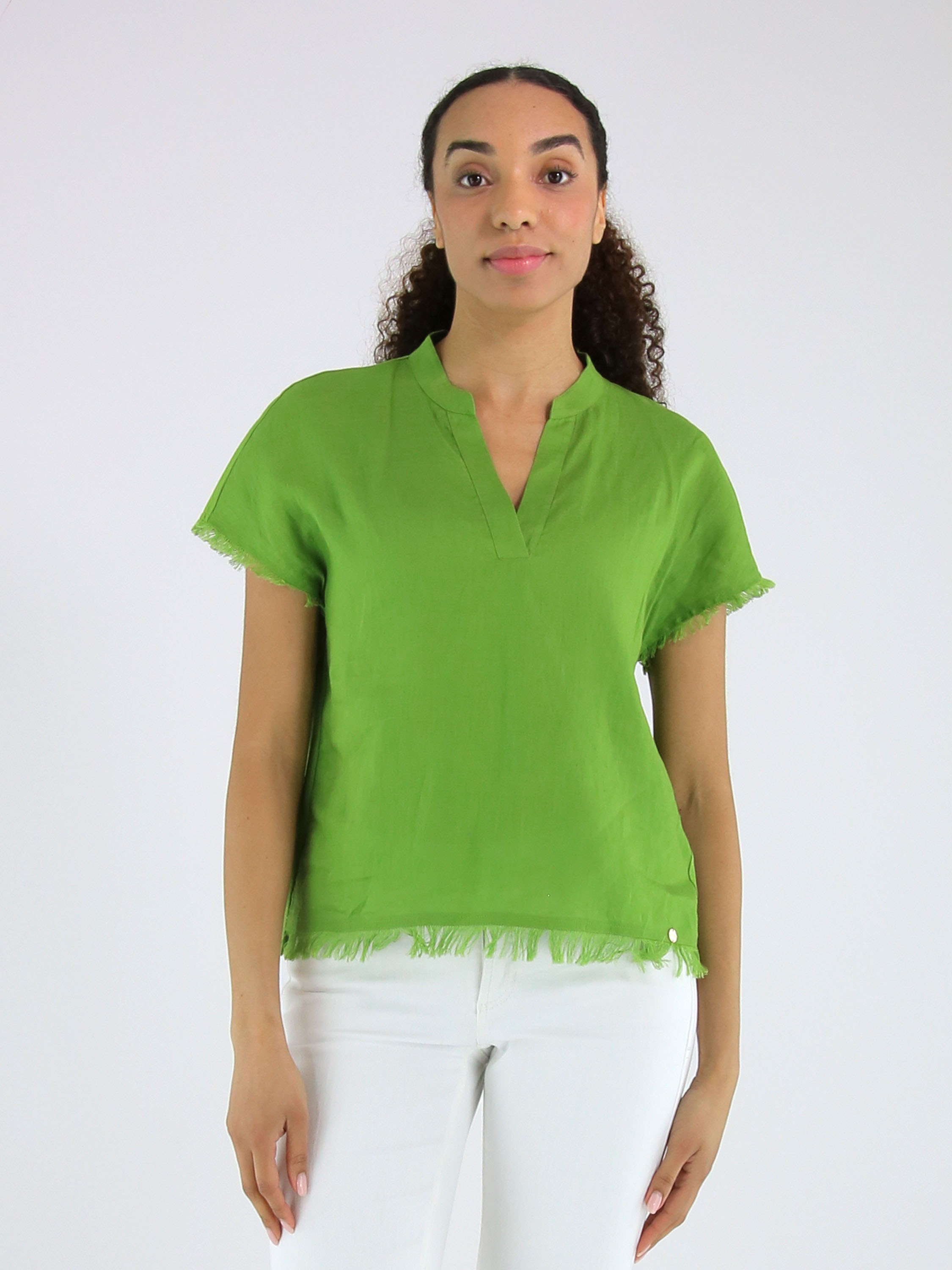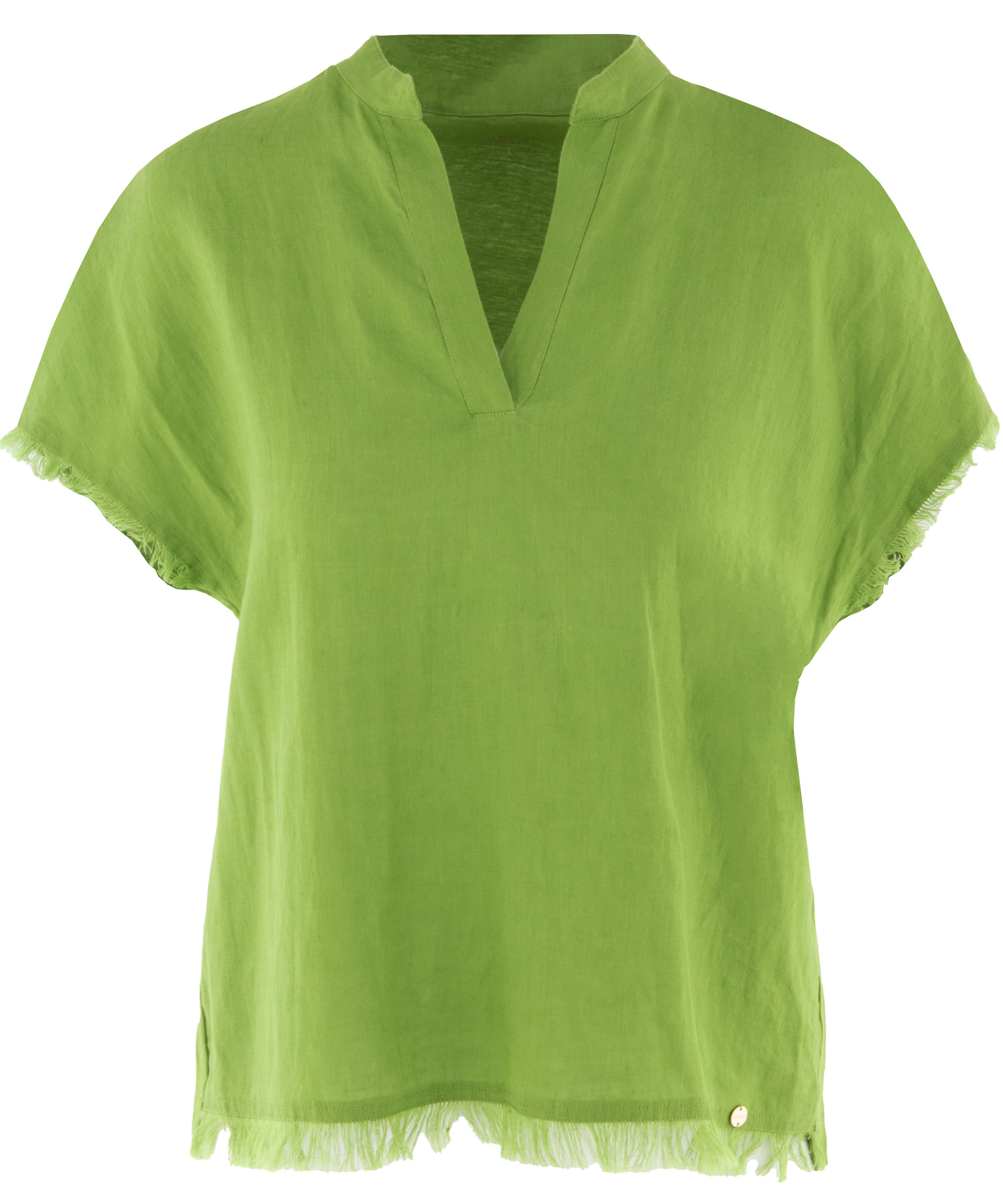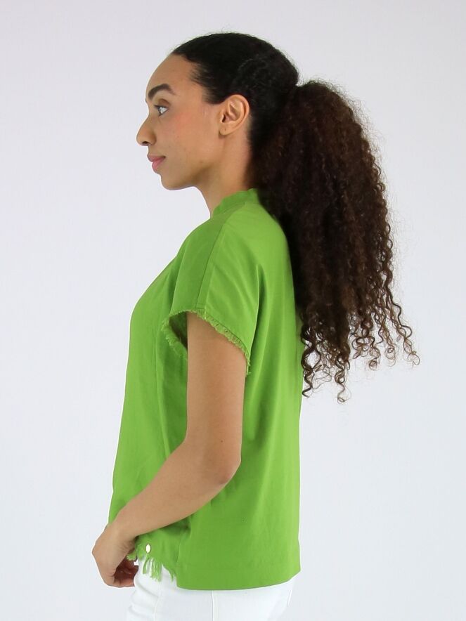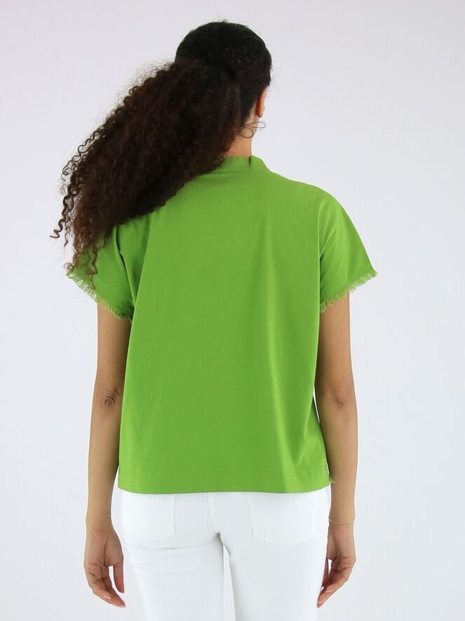 Shirt van Marc Cain in een heldere groene tint. Het shirt heeft een V-hals en is langs de randen van de mouwinzet en de onderzijde fijn gerafeld afgewerkt, wat zorgt voor een subtiel nonchalant en eigentijds detail. Dit shirt kan op 30 graden worden gewassen.