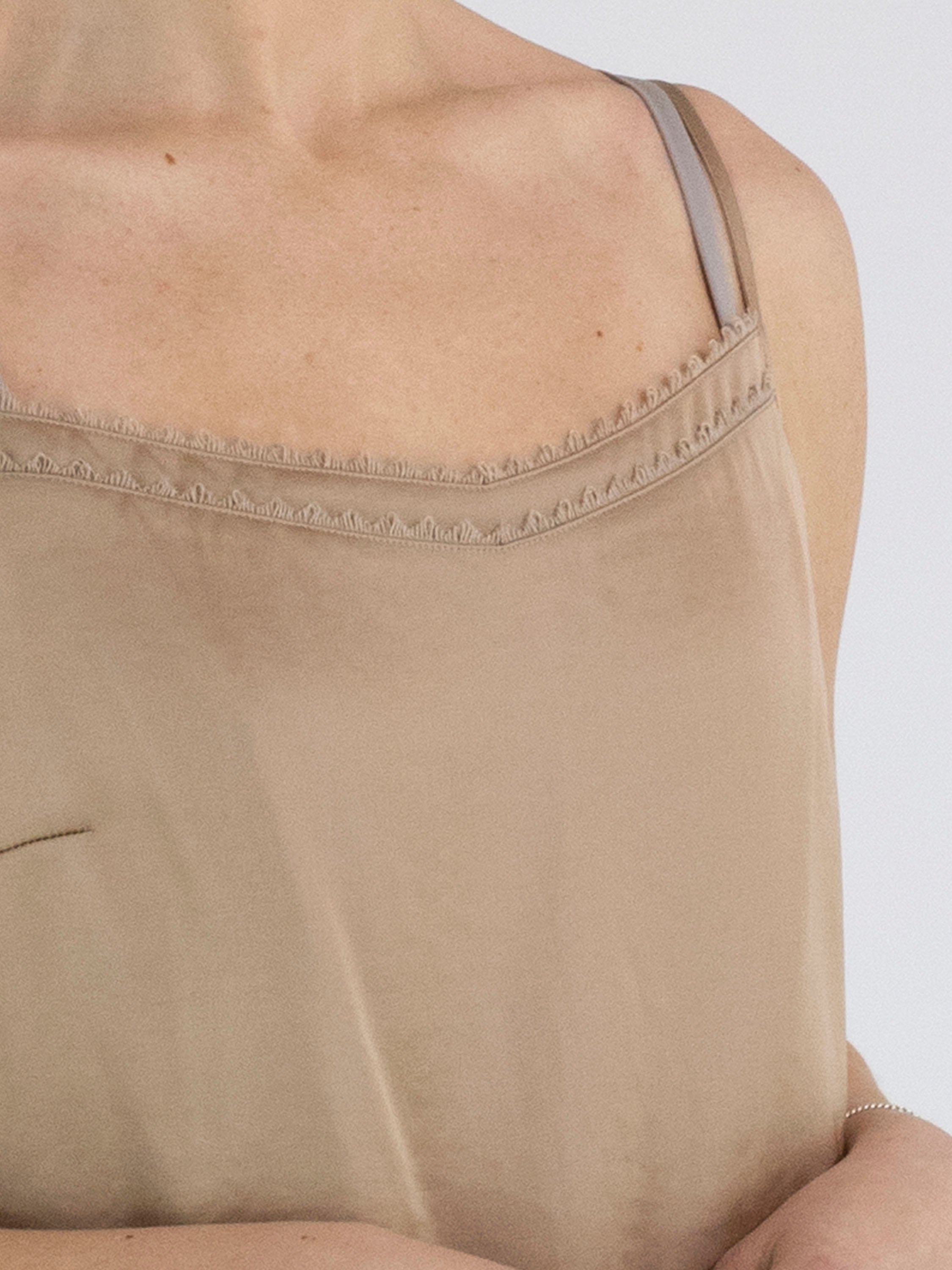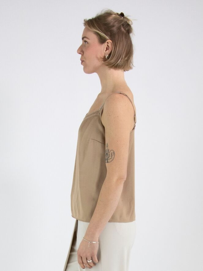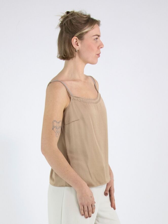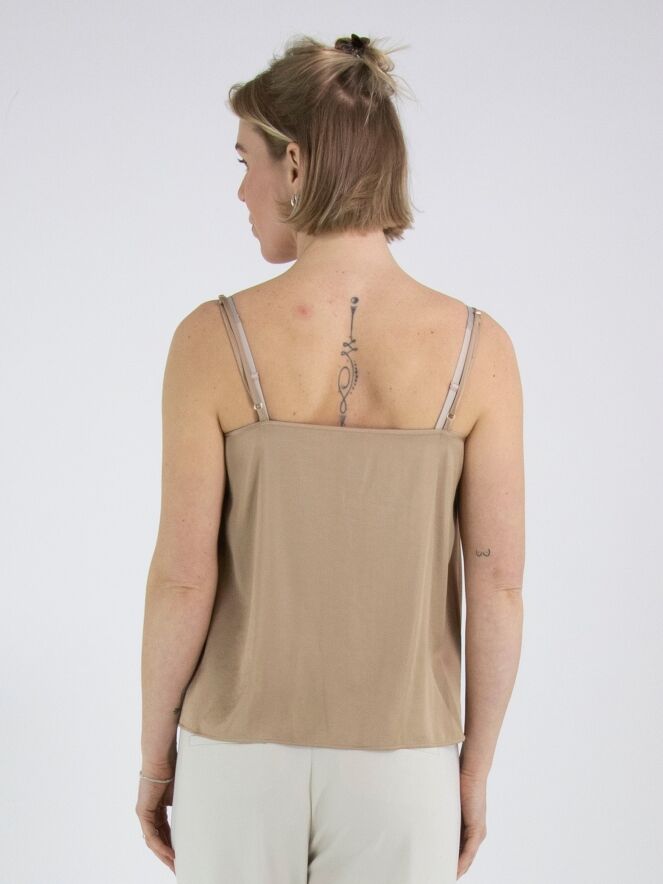 Een top van Marc Cain in een mat satijnen stof in de kleur taupe. De top heeft verstelbare spaghettibandjes en heeft langs de rand aan de voorzijde een dubbele bies. Deze top mag op 30 graden worden gewassen.