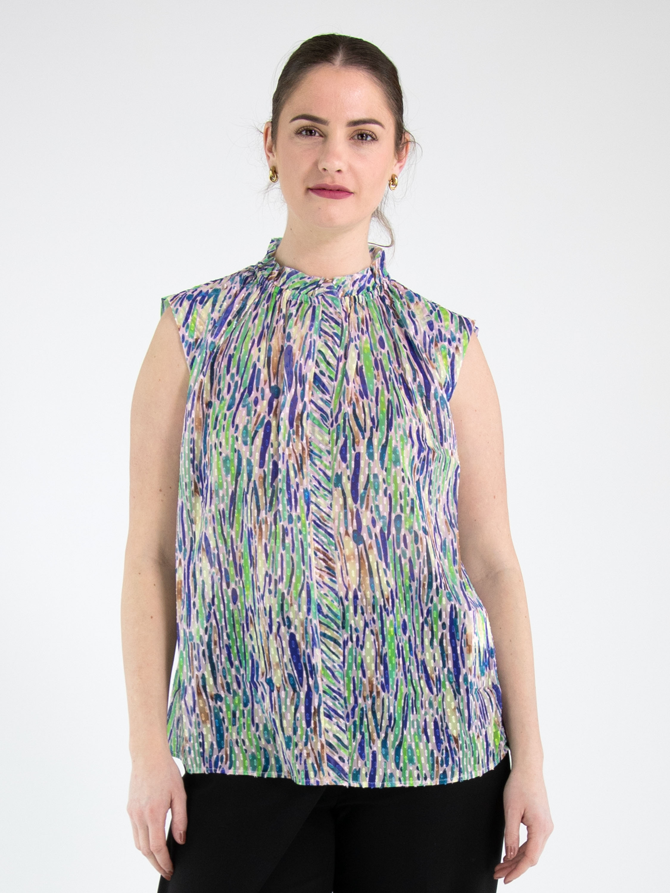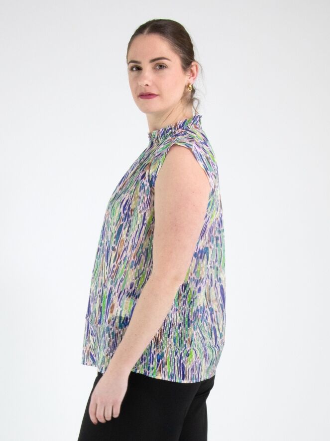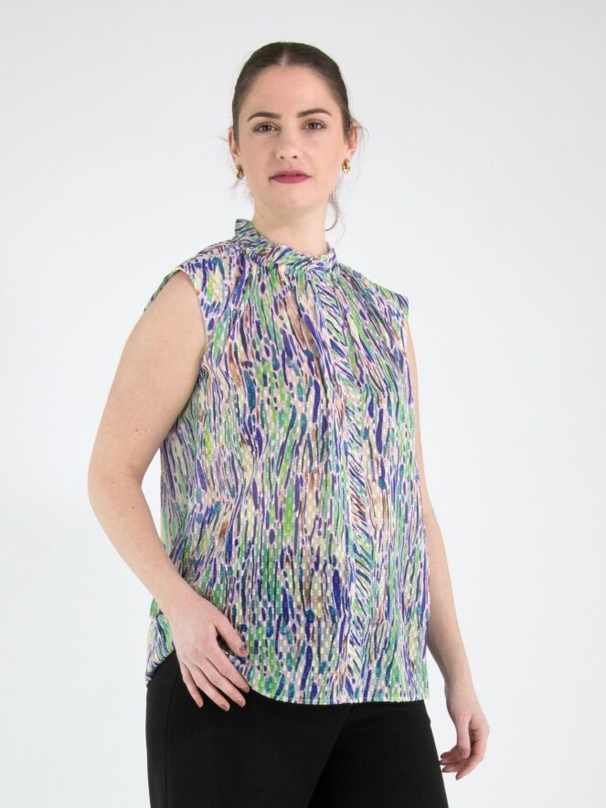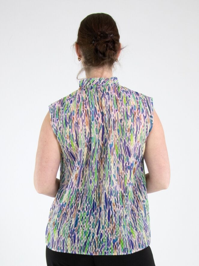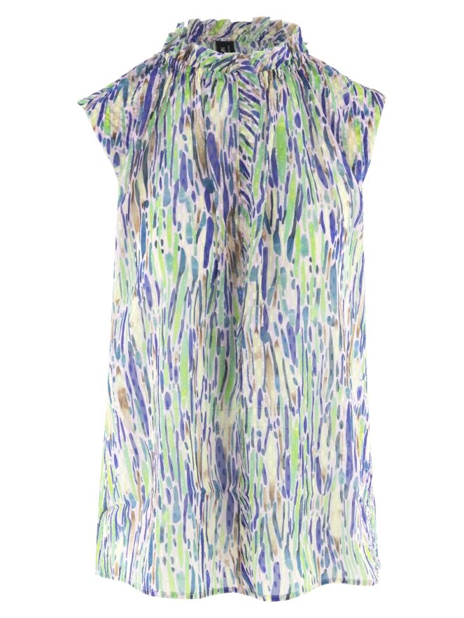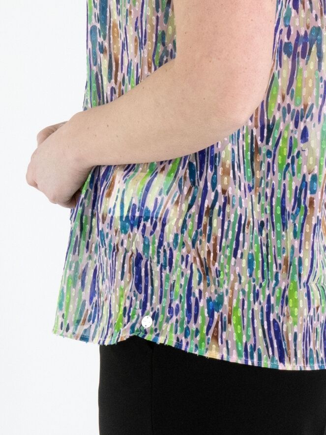 Een licht transparante top van Marc Cain met een confettiprint in meerdere tinten groen, blauw en bruin op een pastelroze achtergrond. Langs de elastische ronde hals is een dubbele voile bies verwerkt. De stof is langs de rand van de halslijn fijn geplooid. Deze top kan op 30 graden worden gewassen.