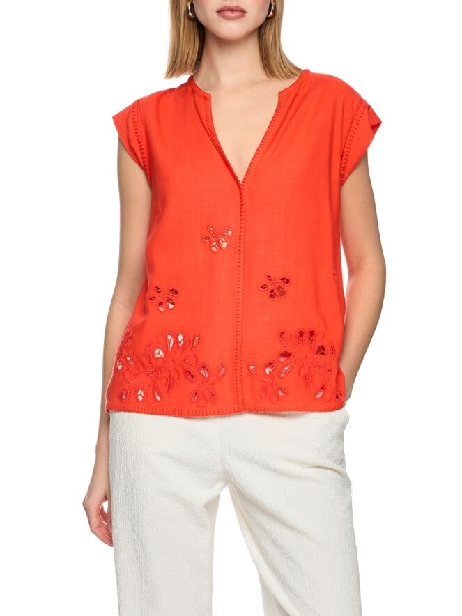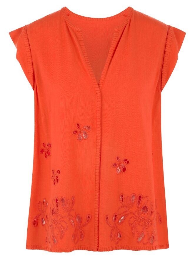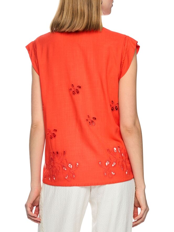 Top van Marc Cain in een koraalrode tint. Vanuit de punt van de V-hals loopt een decoratieve omgekeerde stiknaad door langs de onderrand, wat het ontwerp een subtiel grafisch accent geeft. Zowel aan de voor- als achterzijde zijn bloemvormige ajours verwerkt, die de top een luchtige en zomerse uitstraling geven. Deze top kan met de hand worden gewassen.