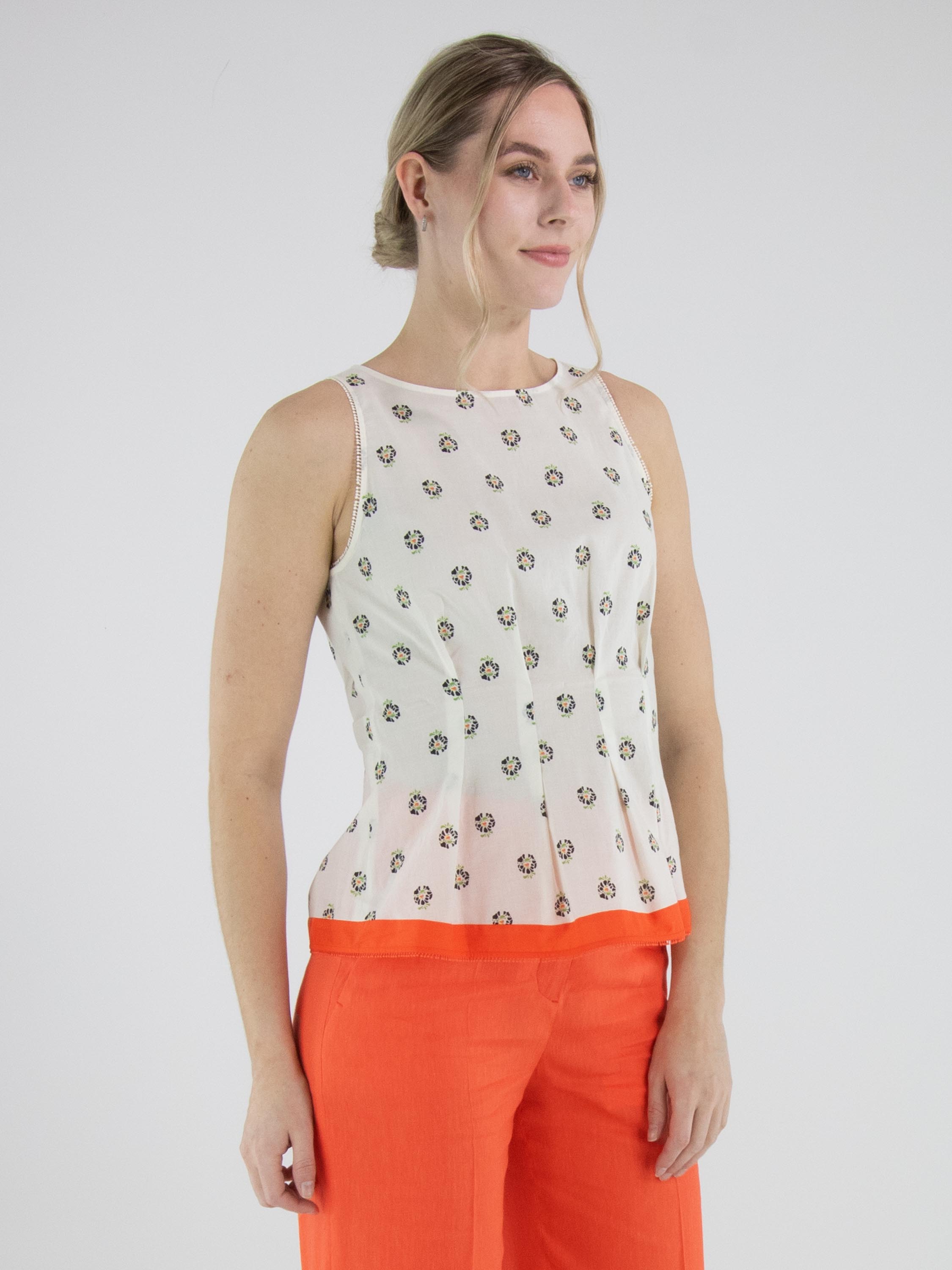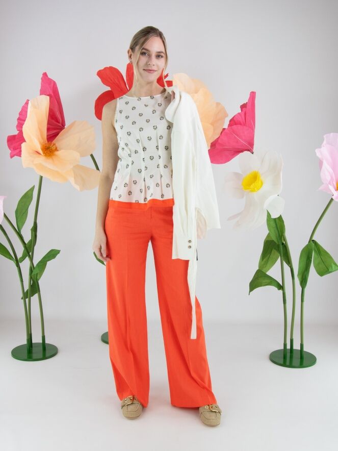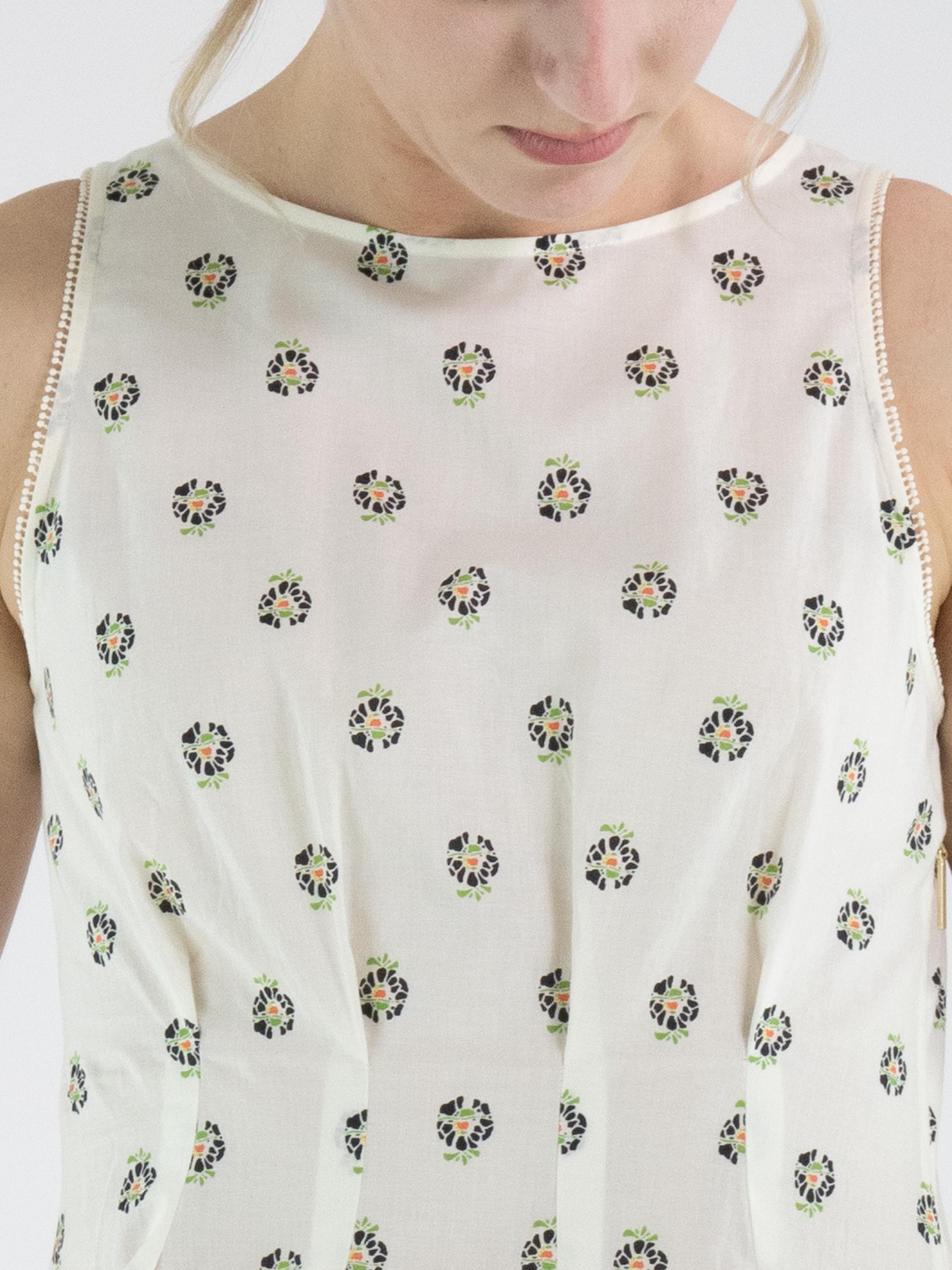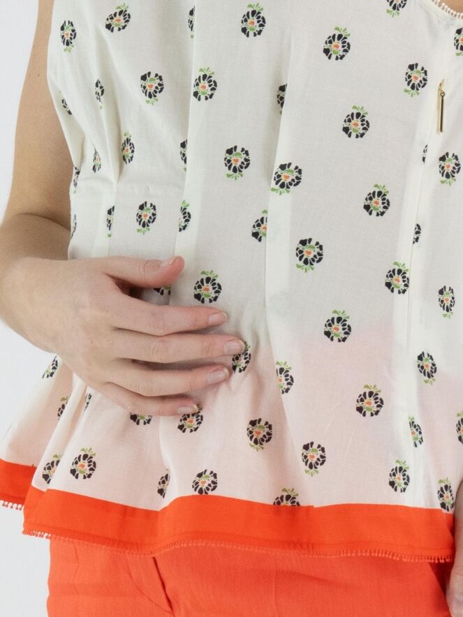 Top van Marc Cain in een bloemetjesmotief in de kleuren groen, zwart en koraalrood op een roomwitte achtergrond. Langs de rand van de mouwinzet en de onderzijde is een fijne mini-pompombies verwerkt, wat zorgt voor een speels en verfijnd detail. De zoom is afgewerkt met een brede band in koraalrood, die het ontwerp een krachtig accent geeft. Aan de linkerzijkant loopt een blinde rits vanaf de mouwinzet tot aan de taille. Ter hoogte van de taille zijn meerdere plissés aangebracht, wat een mooi taille-effect creëert. Deze top kan op 30 graden worden gewassen.