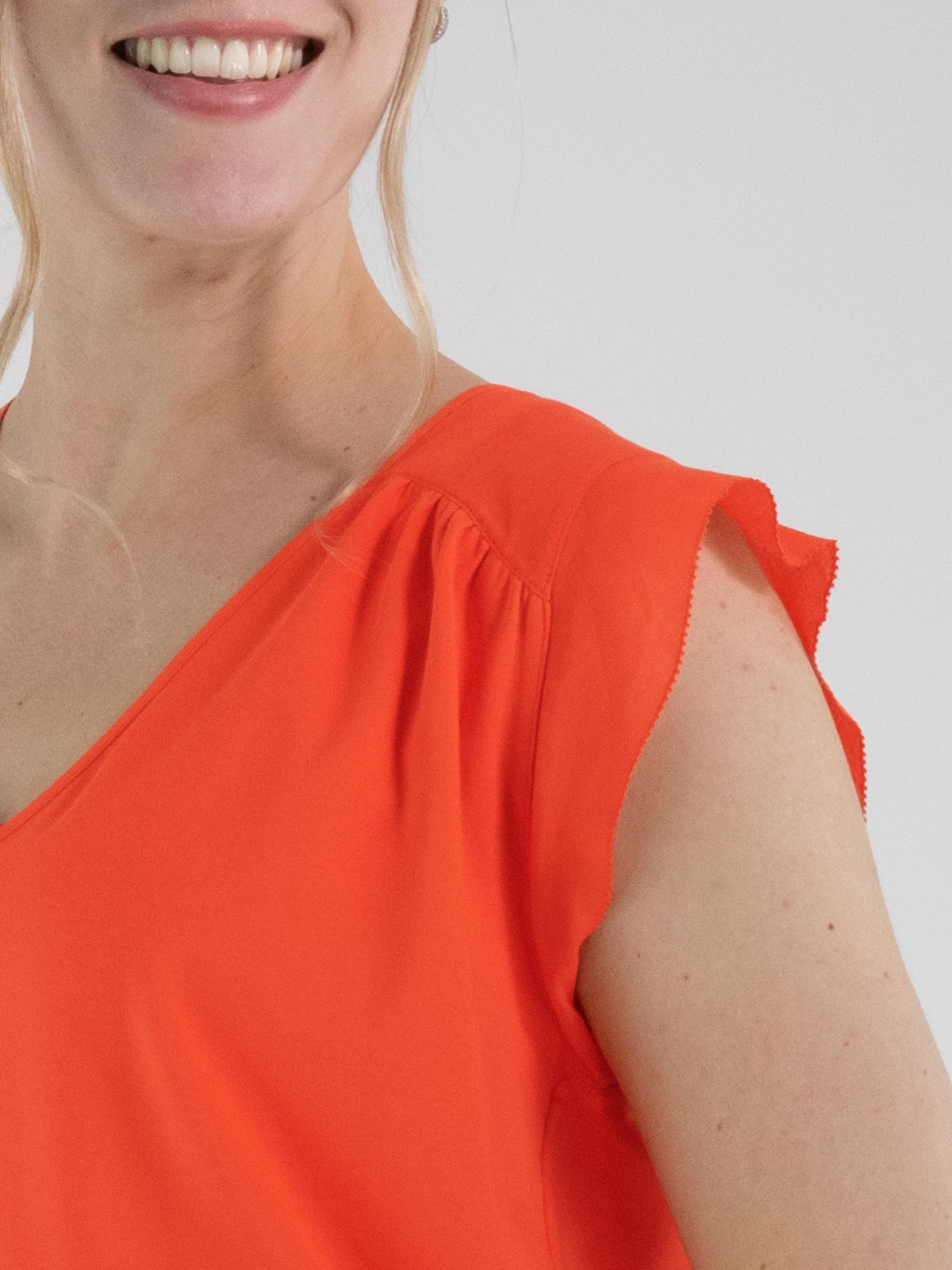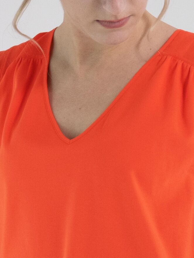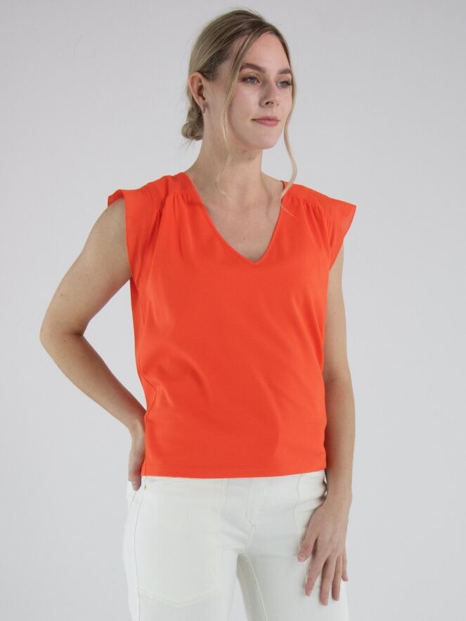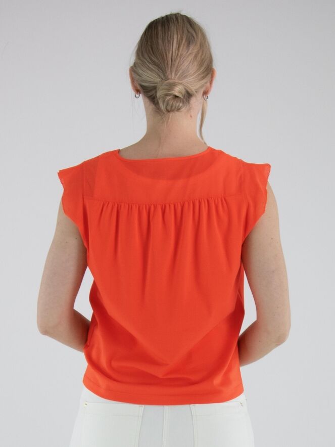 Top van Marc Cain in een krachtige koraalrode tint. De top heeft een V-hals en langs de randen van de mouwinzet is een bies met een subtiel gekartelde rand verwerkt, wat zorgt voor een verfijnd en vrouwelijk detail. Langs de schouders is de stof bij de stiknaden fijn geplooid, wat een elegante en zachte valling creëert. Deze top kan op 30 graden worden gewassen.