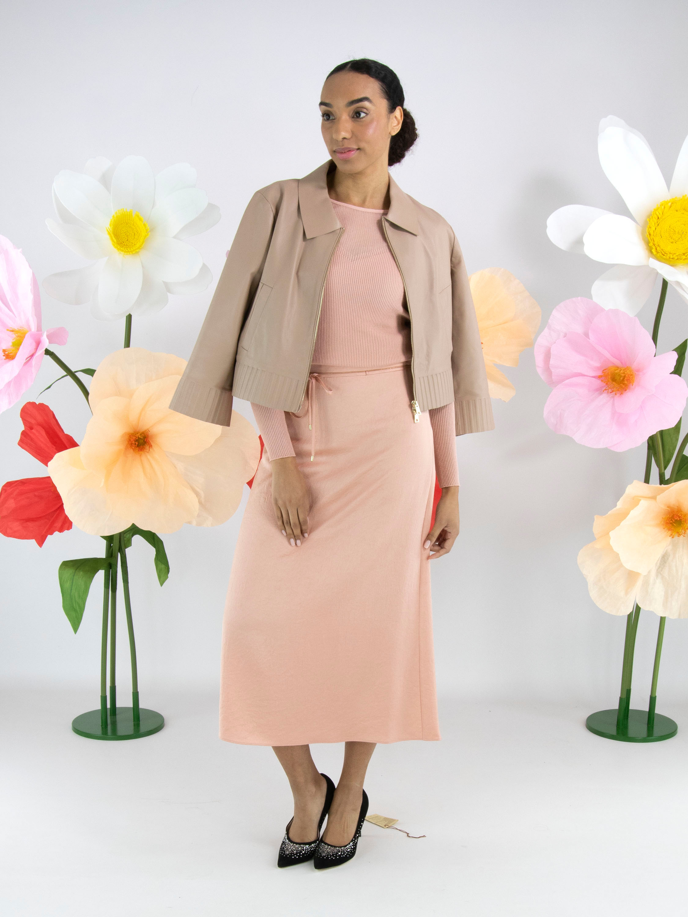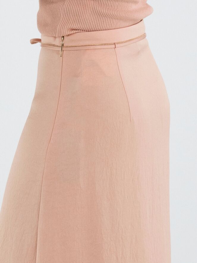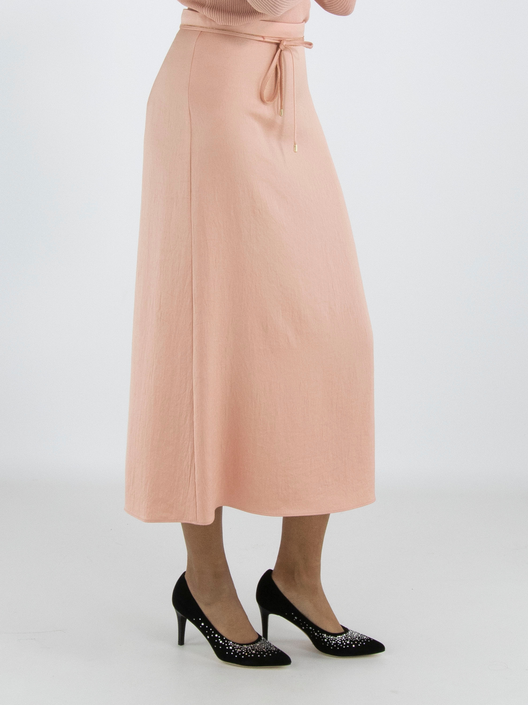 Een lange rok van Marc Cain in een mat satijnen stof in de kleur zalmroze. In de taille is een lintceintuur in dezelfde stof, met langs de rand een kartelrandje van een rits. Deze rok mag op 30 graden worden gewassen.