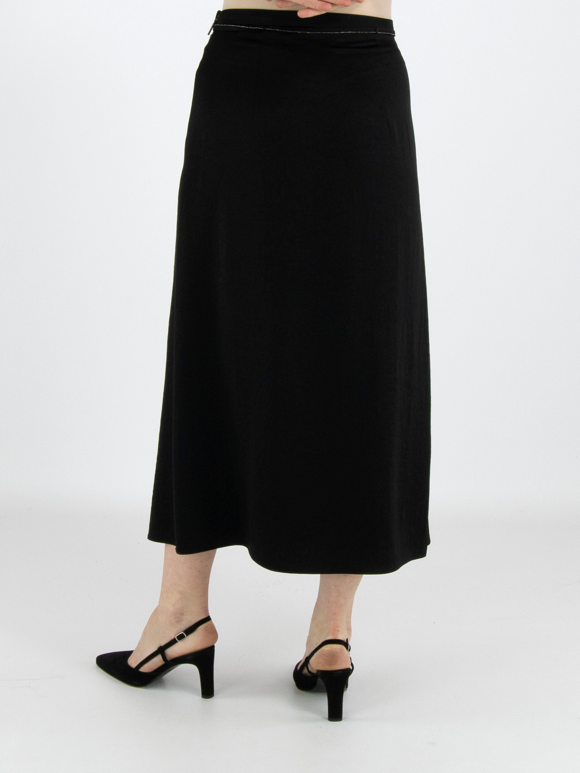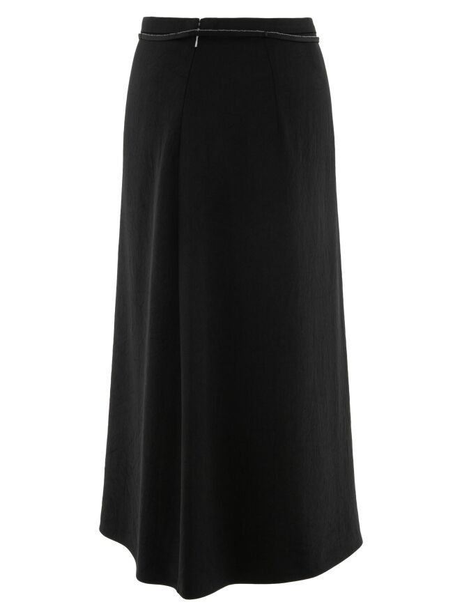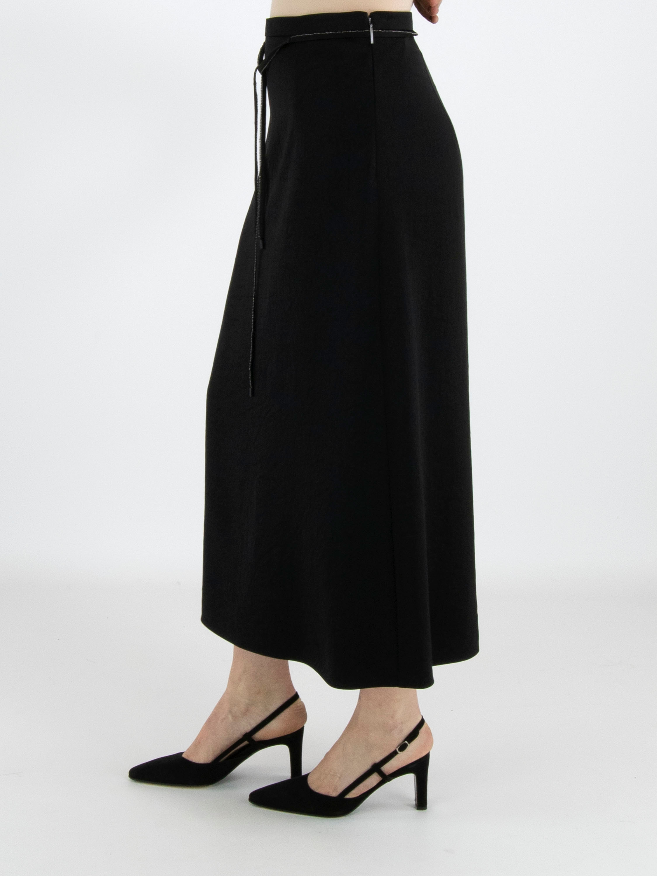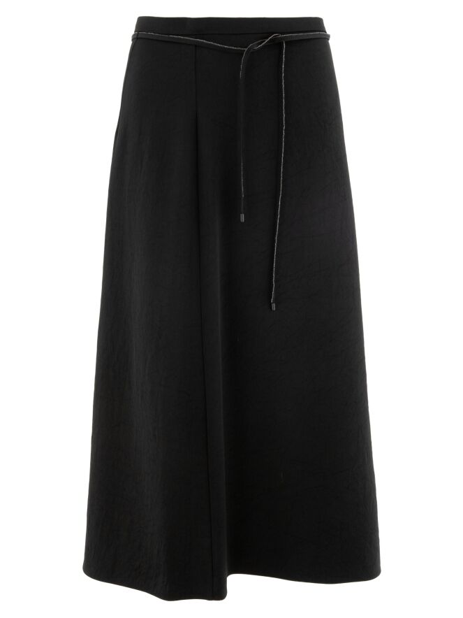 Een lange rok van Marc Cain in een mat satijnen stof in de kleur zwart. In de taille is een lintceintuur in dezelfde stof met langs de rand een kartelrandje van een rits. Deze rok mag op 30 graden worden gewassen.