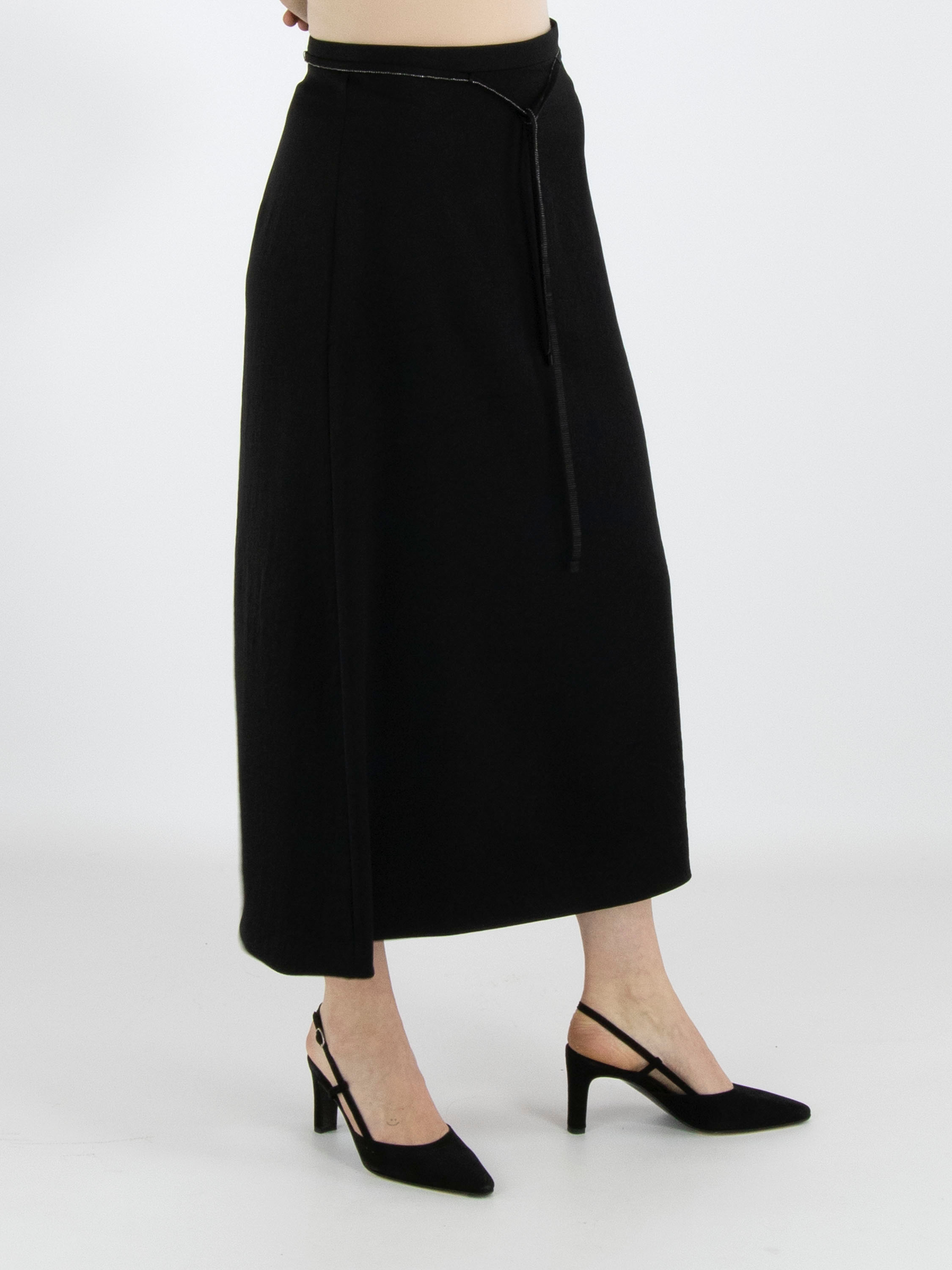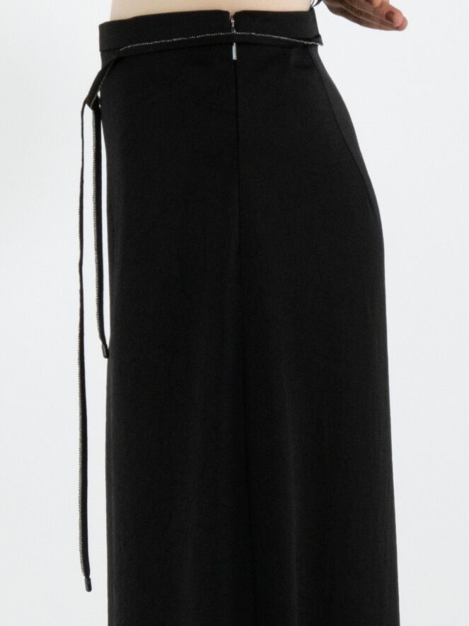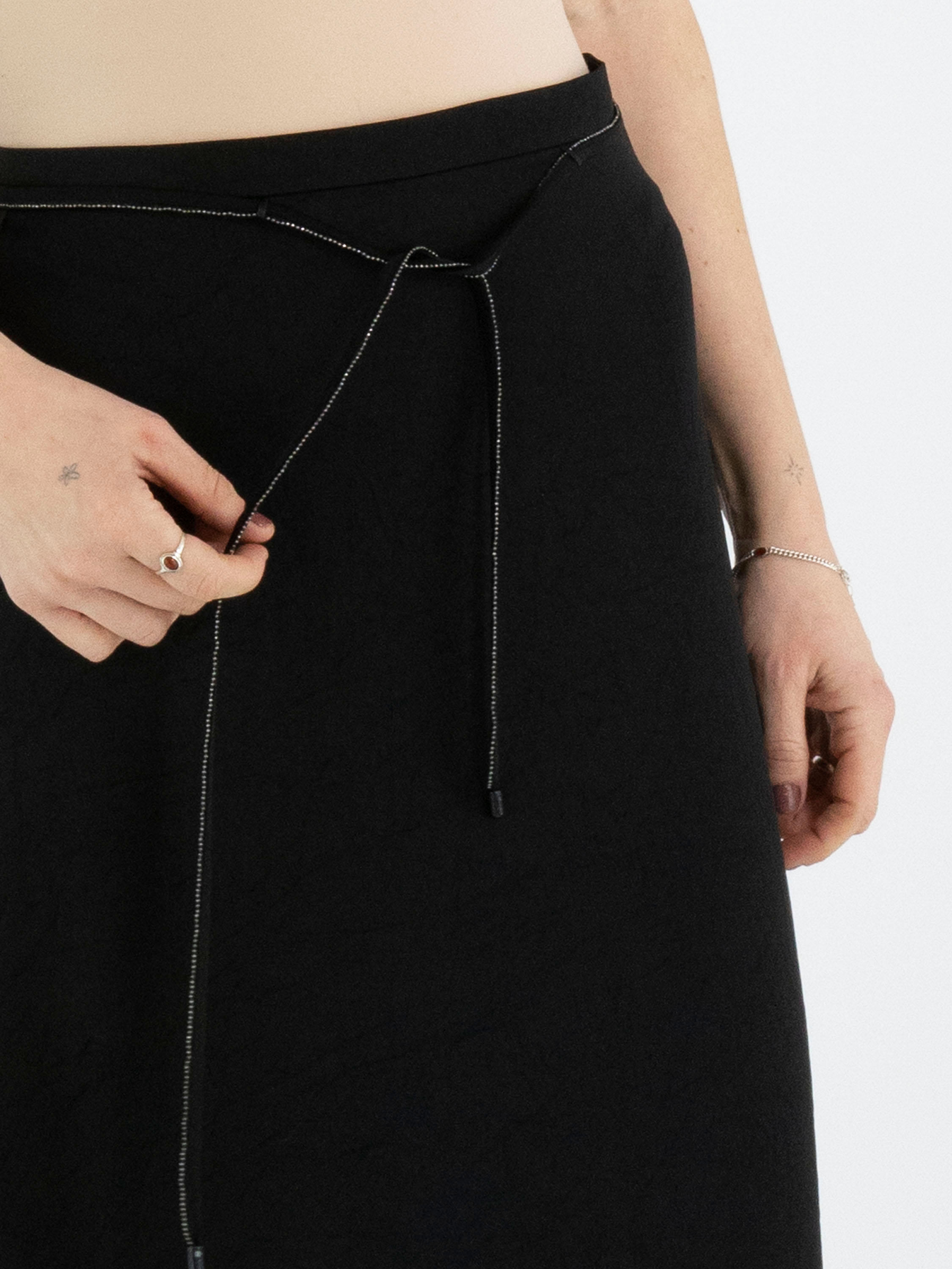 Een lange rok van Marc Cain in een mat satijnen stof in de kleur zwart. In de taille is een lintceintuur in dezelfde stof met langs de rand een kartelrandje van een rits. Deze rok mag op 30 graden worden gewassen.