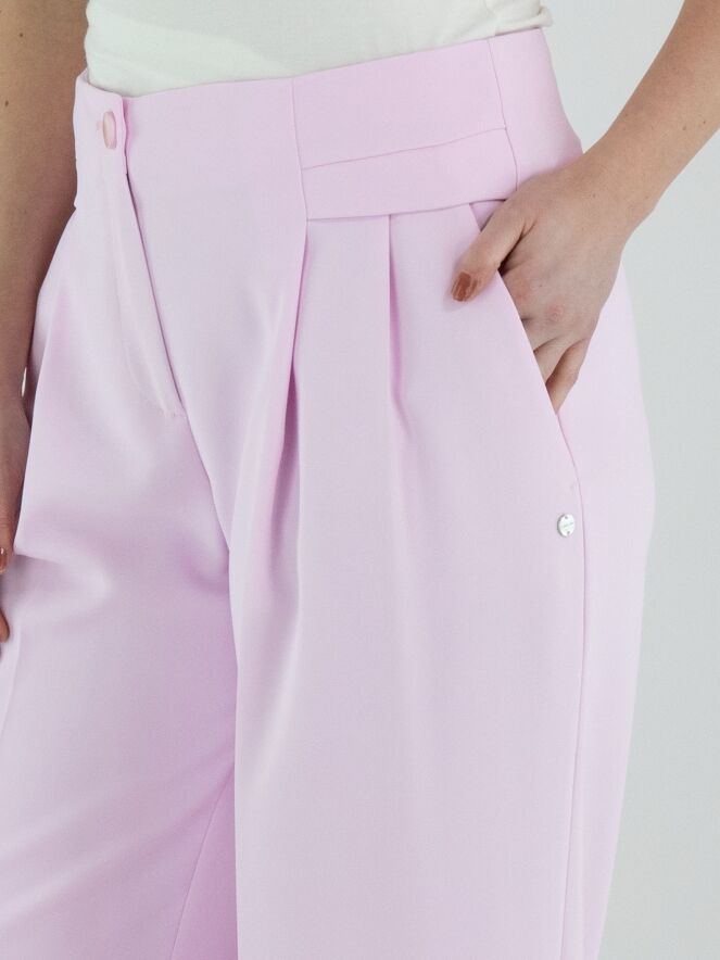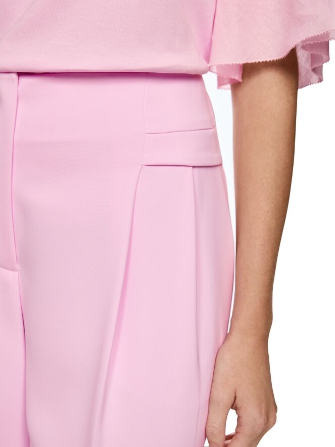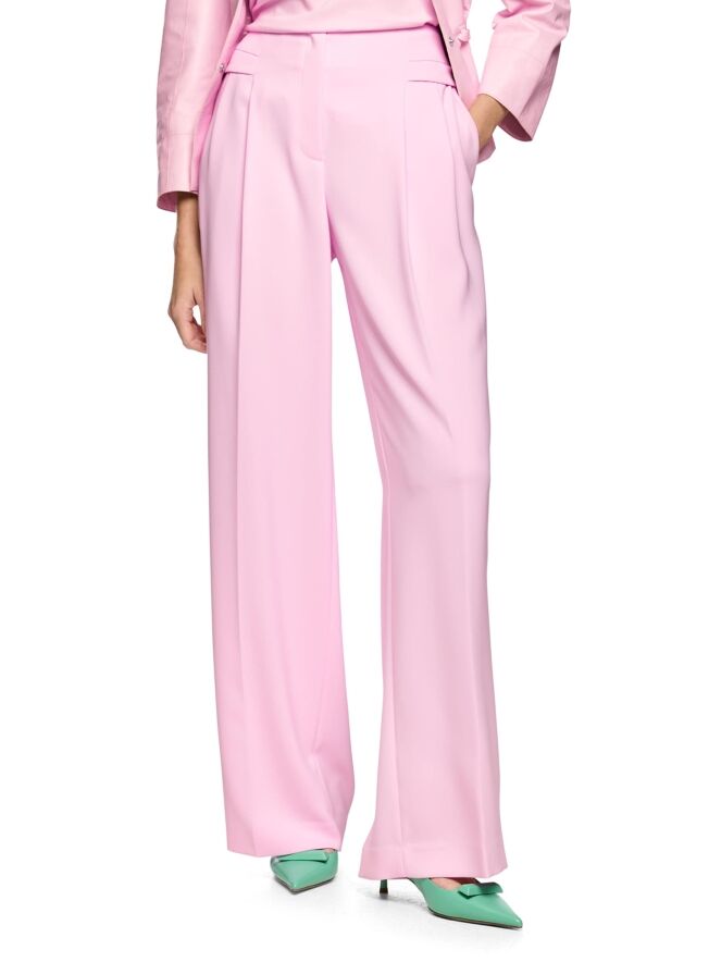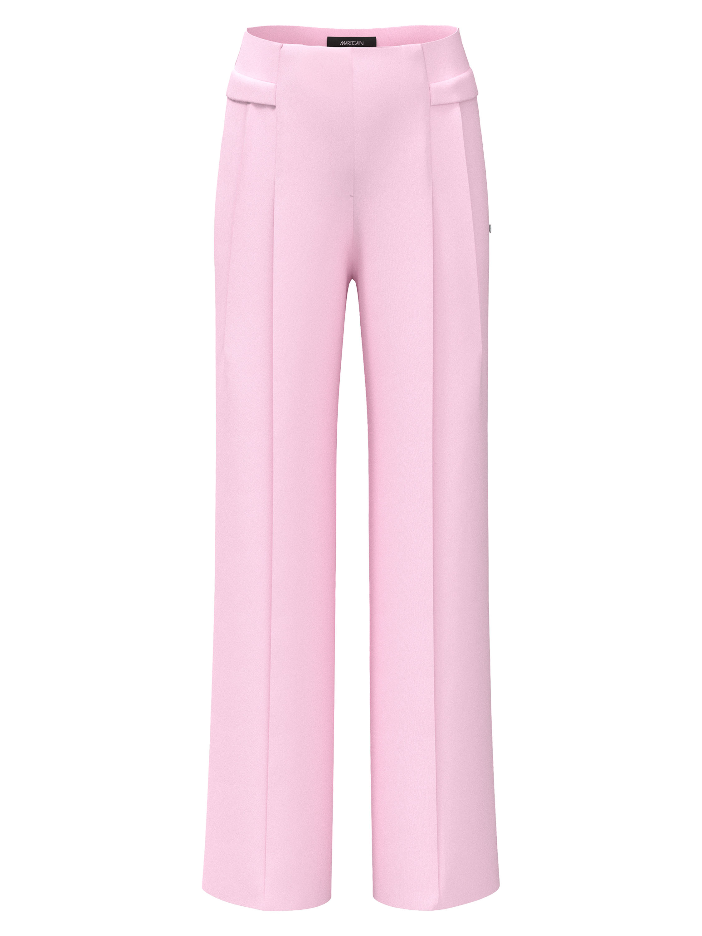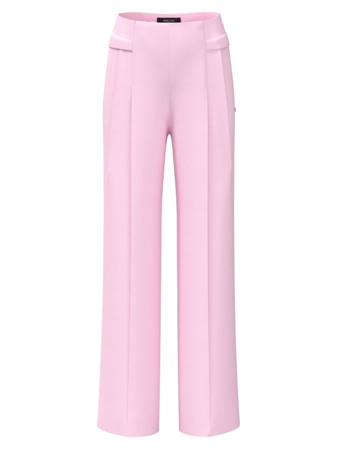 Een broek van Marc Cain in een heldere roze kleur. Aan beide zijden van de taille is een dubbele tailleband verwerkt, waaronder twee bandplooien zijn aangebracht. In het midden van de pijpen loopt een ingestreken plooi. De broek heeft steekzakken en kan op 30 graden worden gewassen.