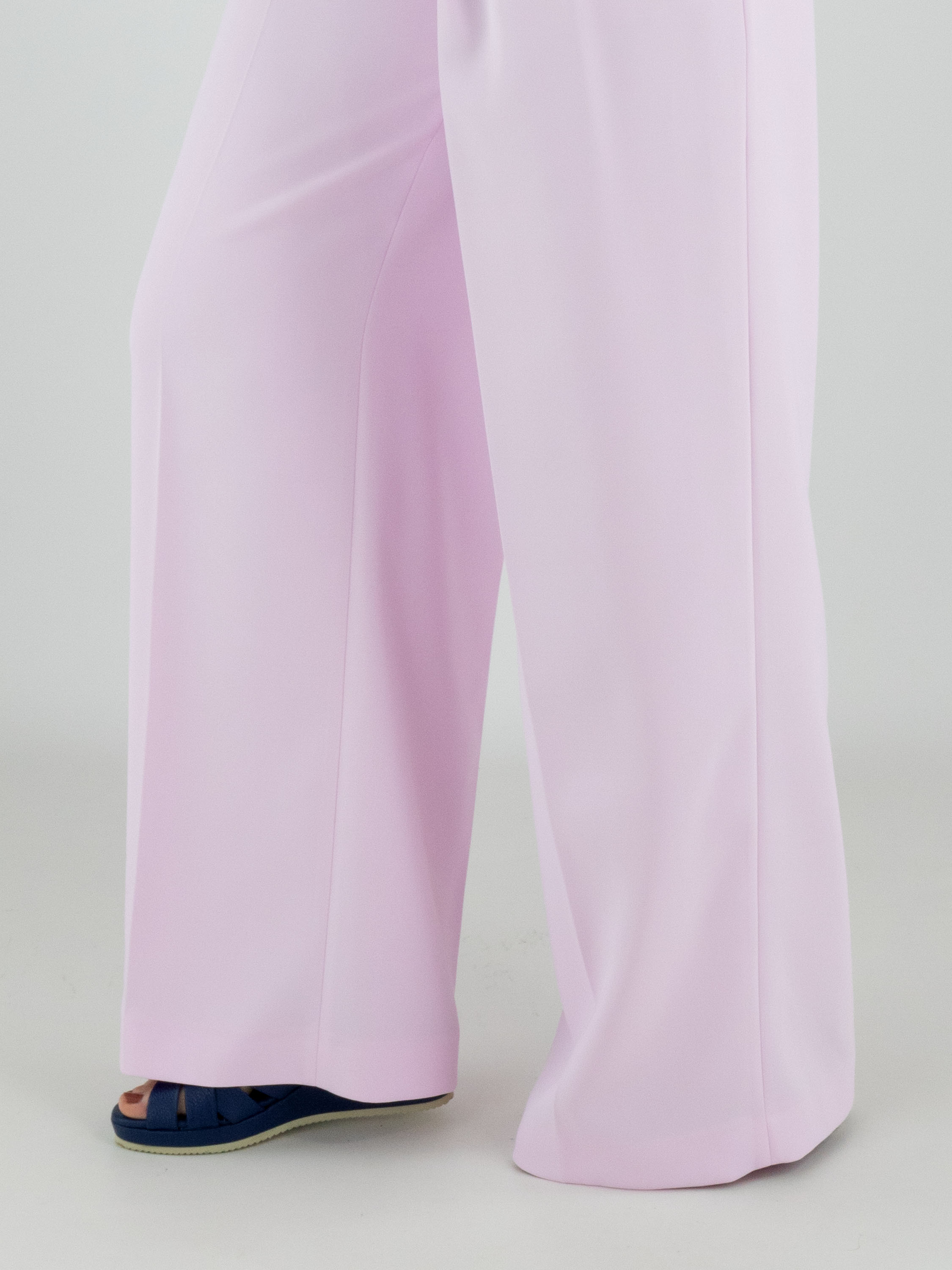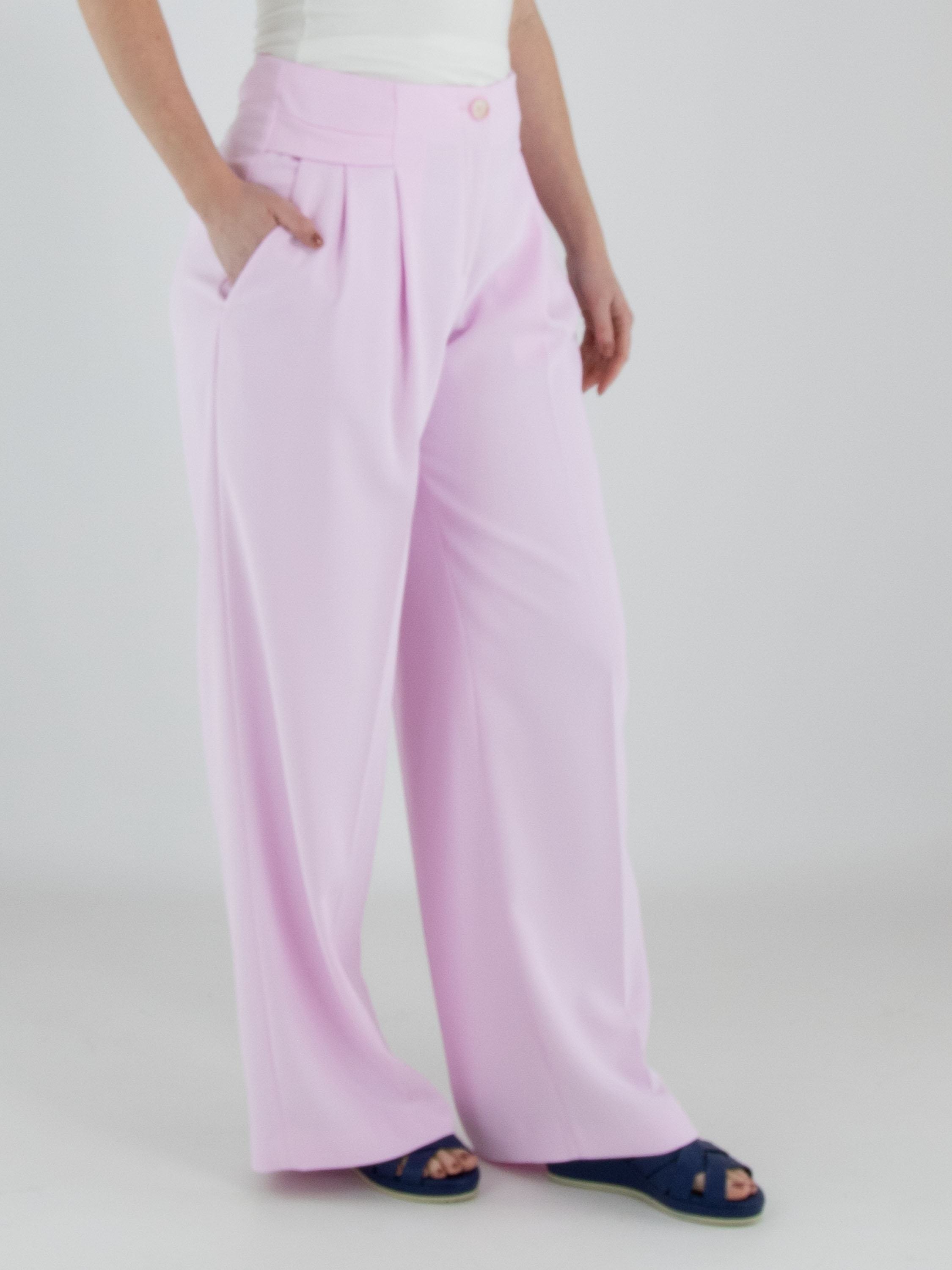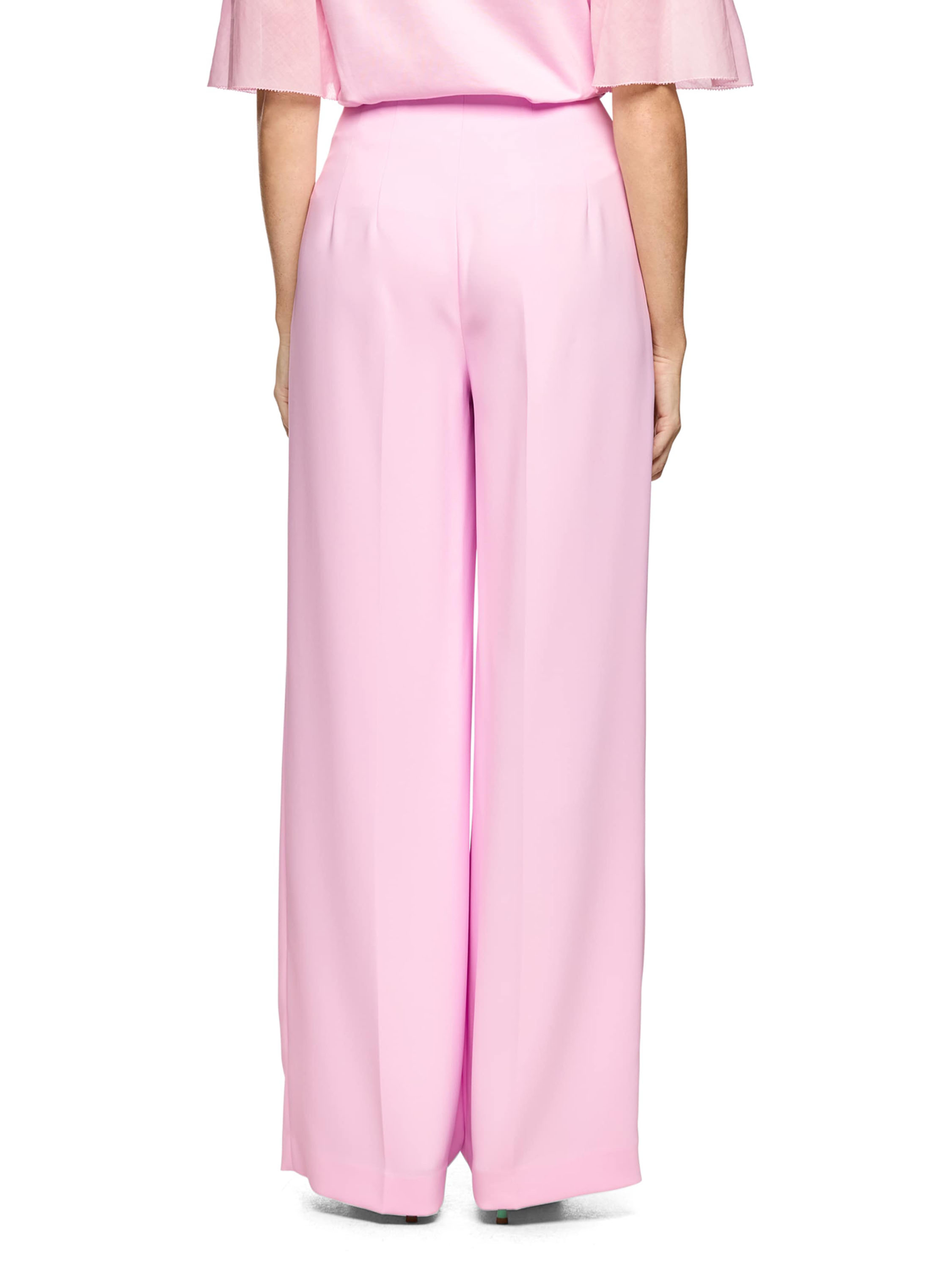 Een broek van Marc Cain in een heldere roze kleur. Aan beide zijden van de taille is een dubbele tailleband verwerkt, waaronder twee bandplooien zijn aangebracht. In het midden van de pijpen loopt een ingestreken plooi. De broek heeft steekzakken en kan op 30 graden worden gewassen.