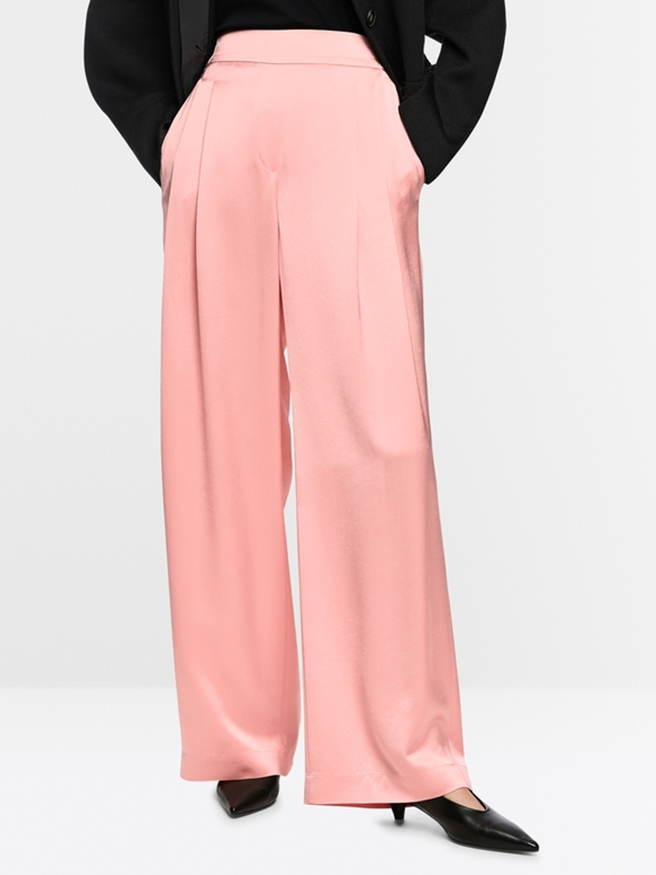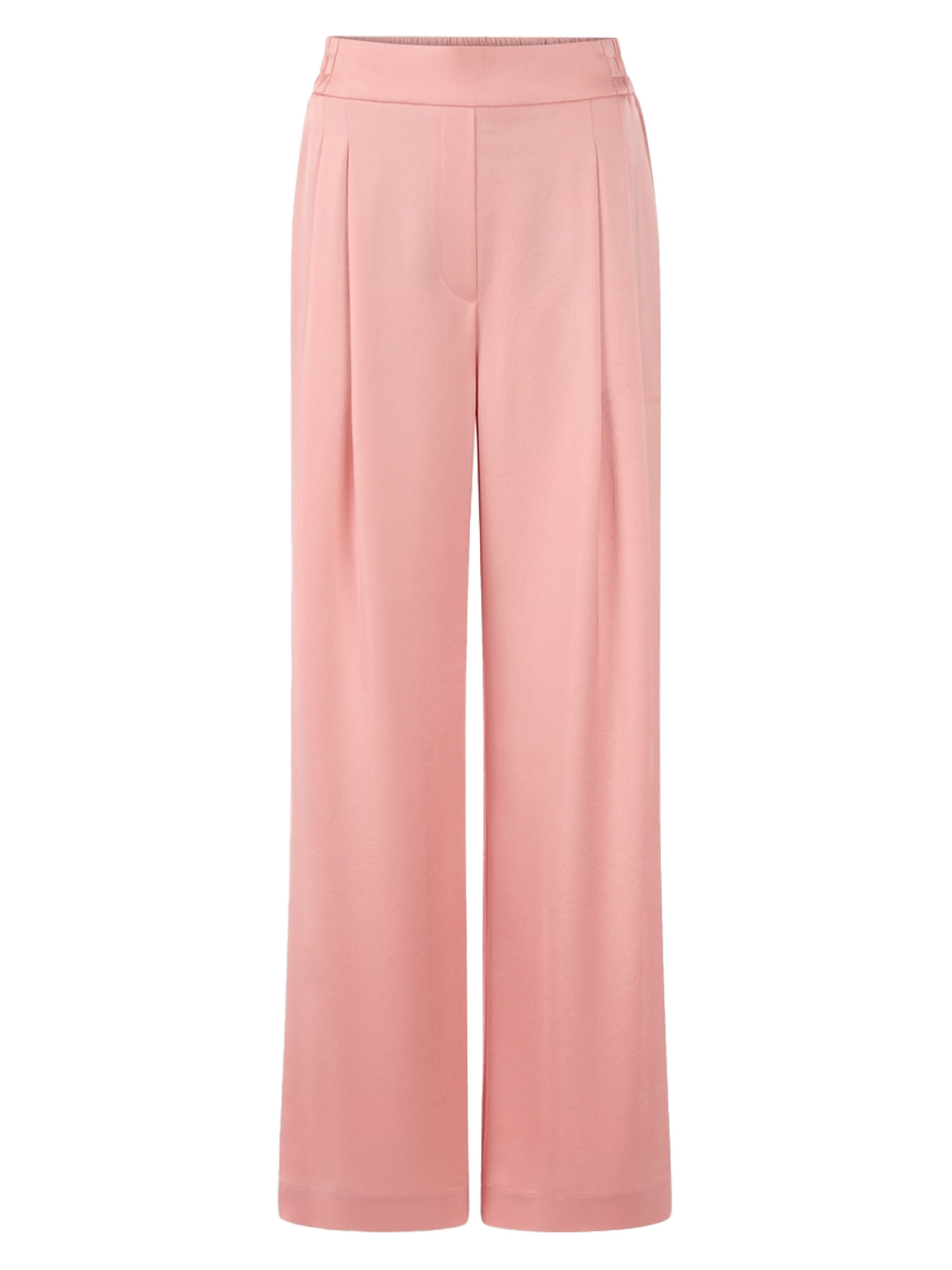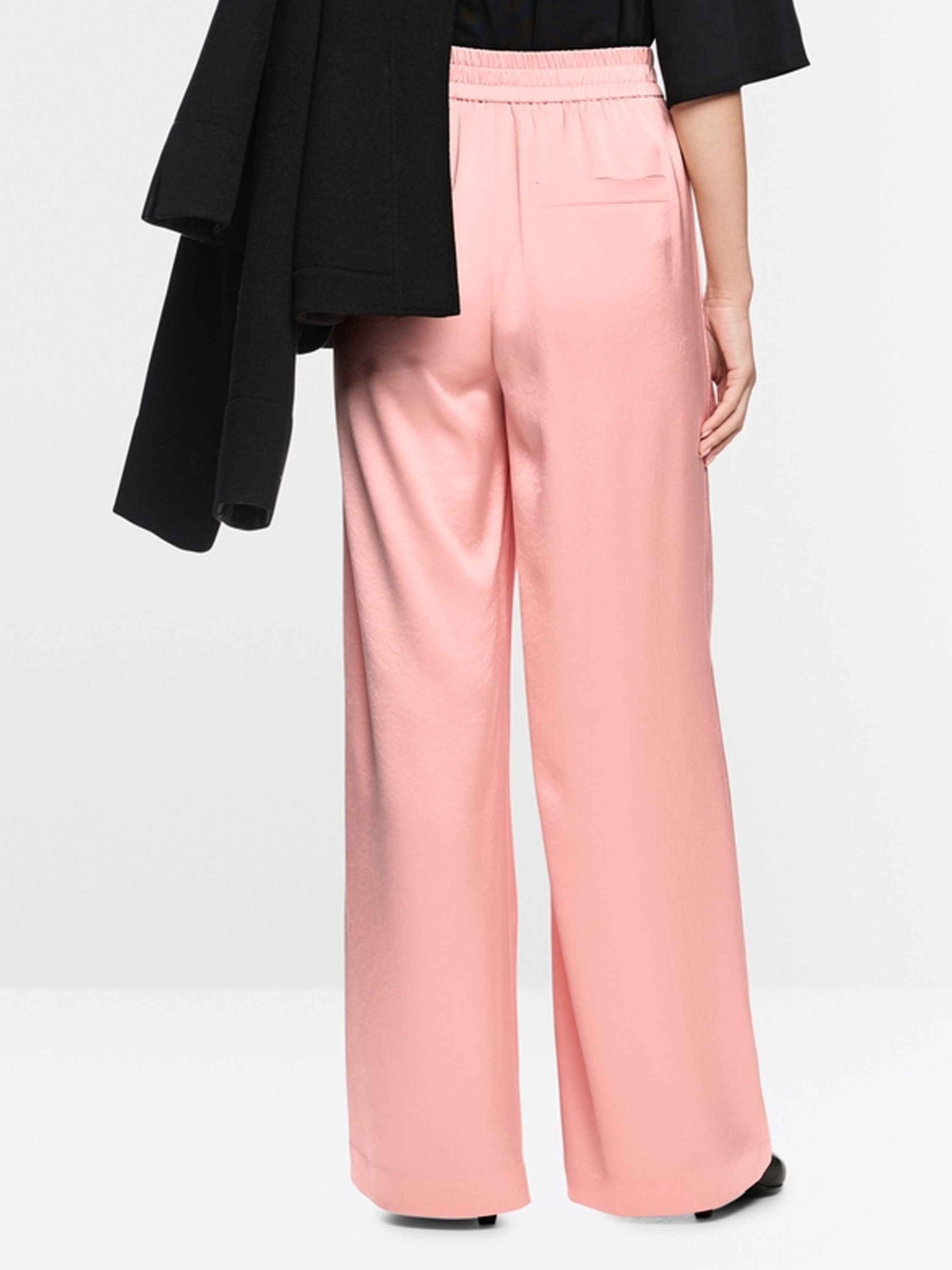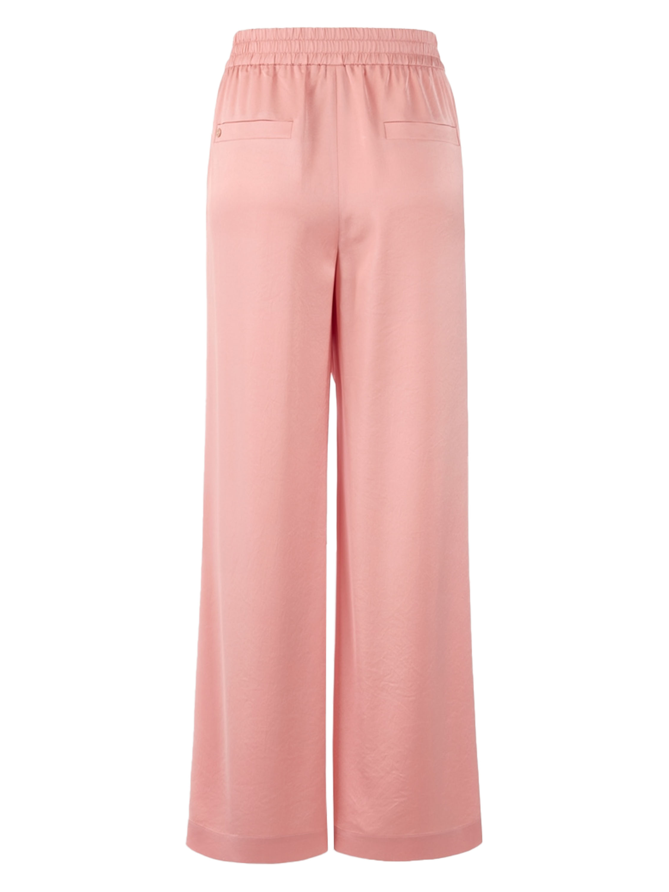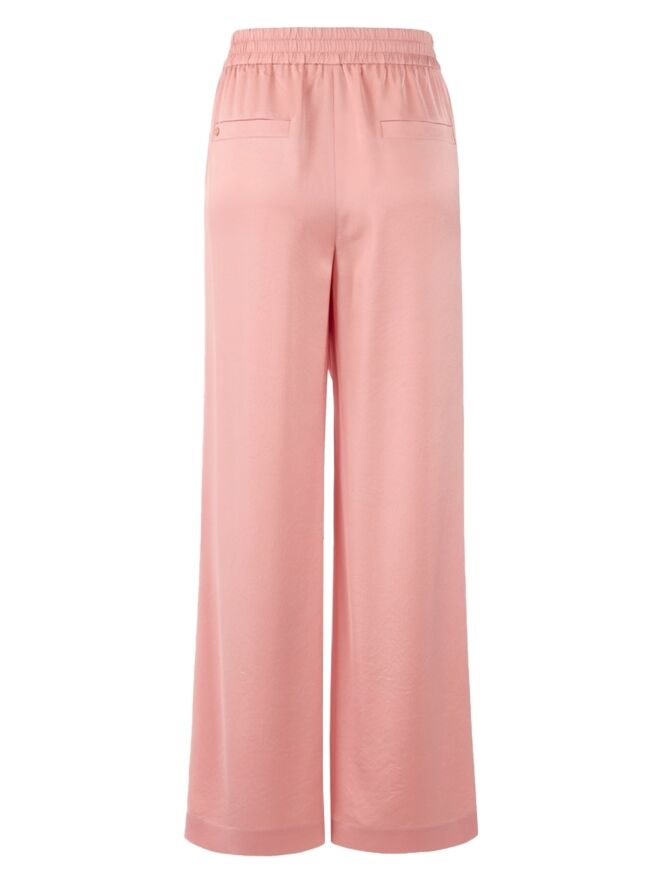 Een broek van Marc Cain in de kleur pastelroze. De stof is mat glanzend en uitgevoerd in een ton-sur-ton reptielprint. Vanaf de zijkanten naar de achterzijde is in de taille de stof fijn geplooid en elastisch. Aan de voorzijde zijn naar de buitenzijden toe enkele bandplooien. De broek heeft steekzakken en mag op 30 graden worden gewassen.