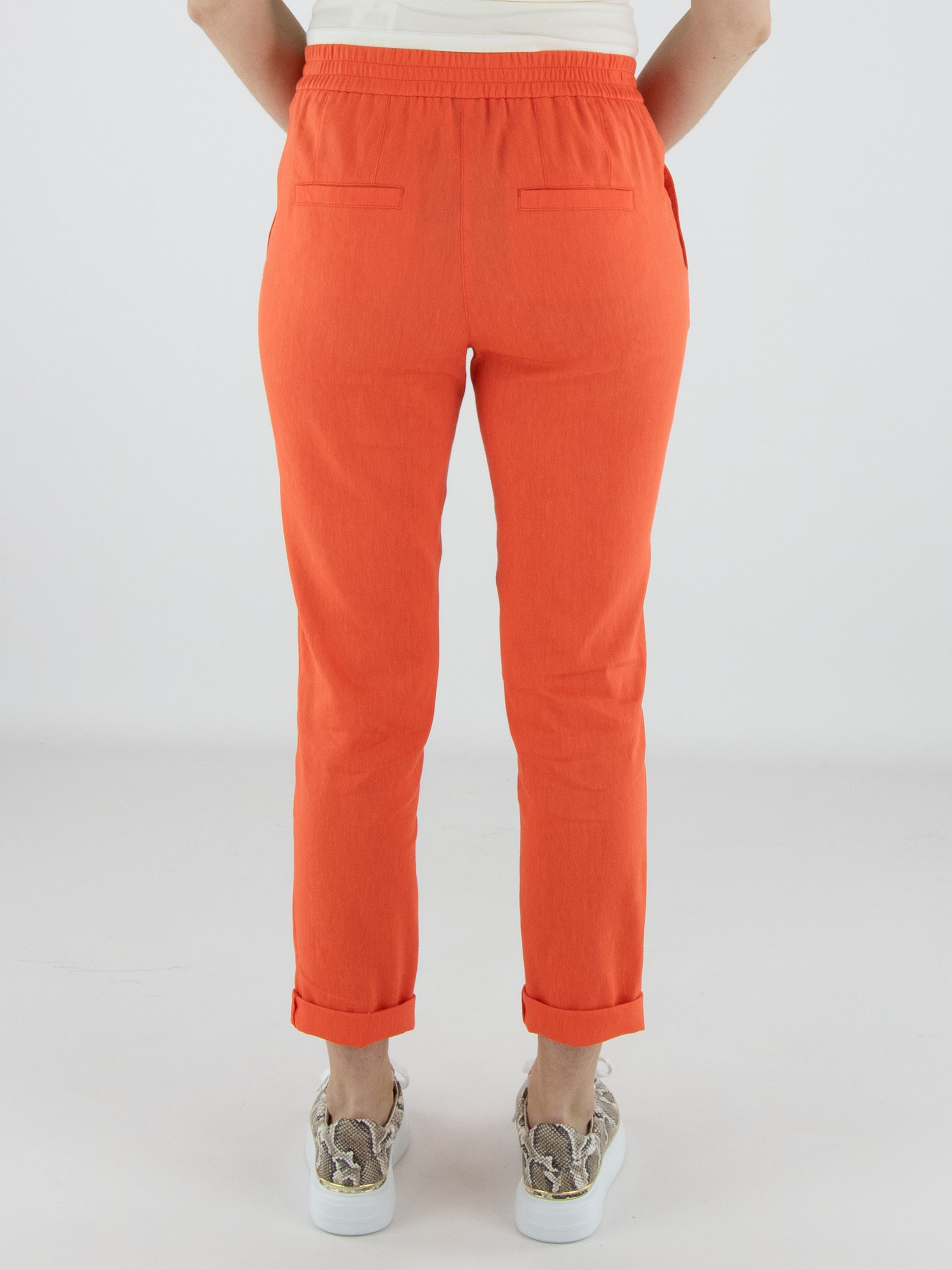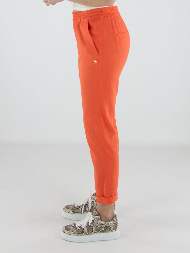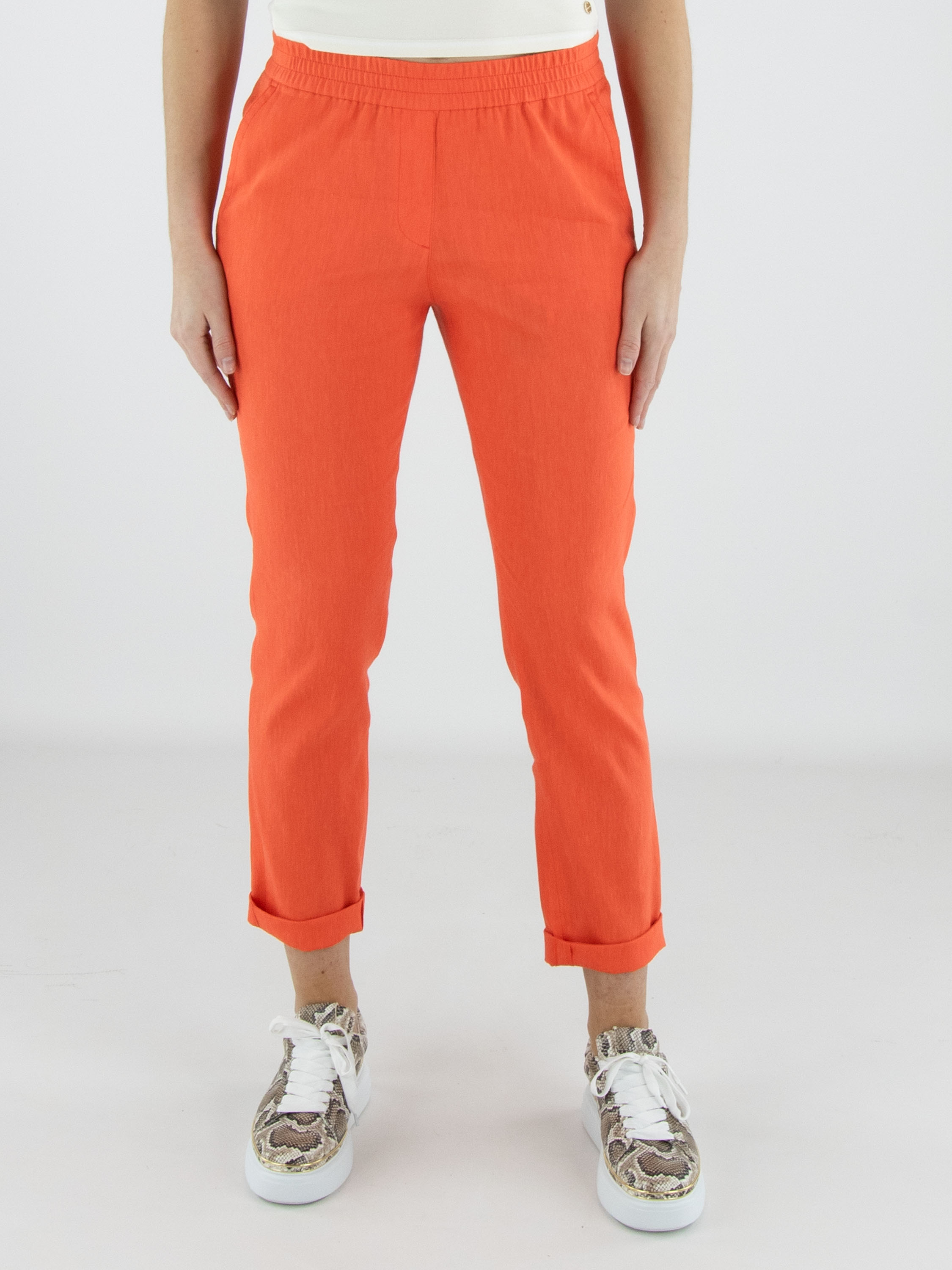 Broek van Marc Cain in een frisse koraalrode tint. In de taille is een brede, fijn geribbelde elastische band verwerkt, wat zorgt voor een comfortabele en moderne pasvorm. De broek heeft steekzakken en een korte omslag aan de onderzijde van de pijpen voor een eigentijdse afwerking. Deze broek kan op 30 graden worden gewassen.