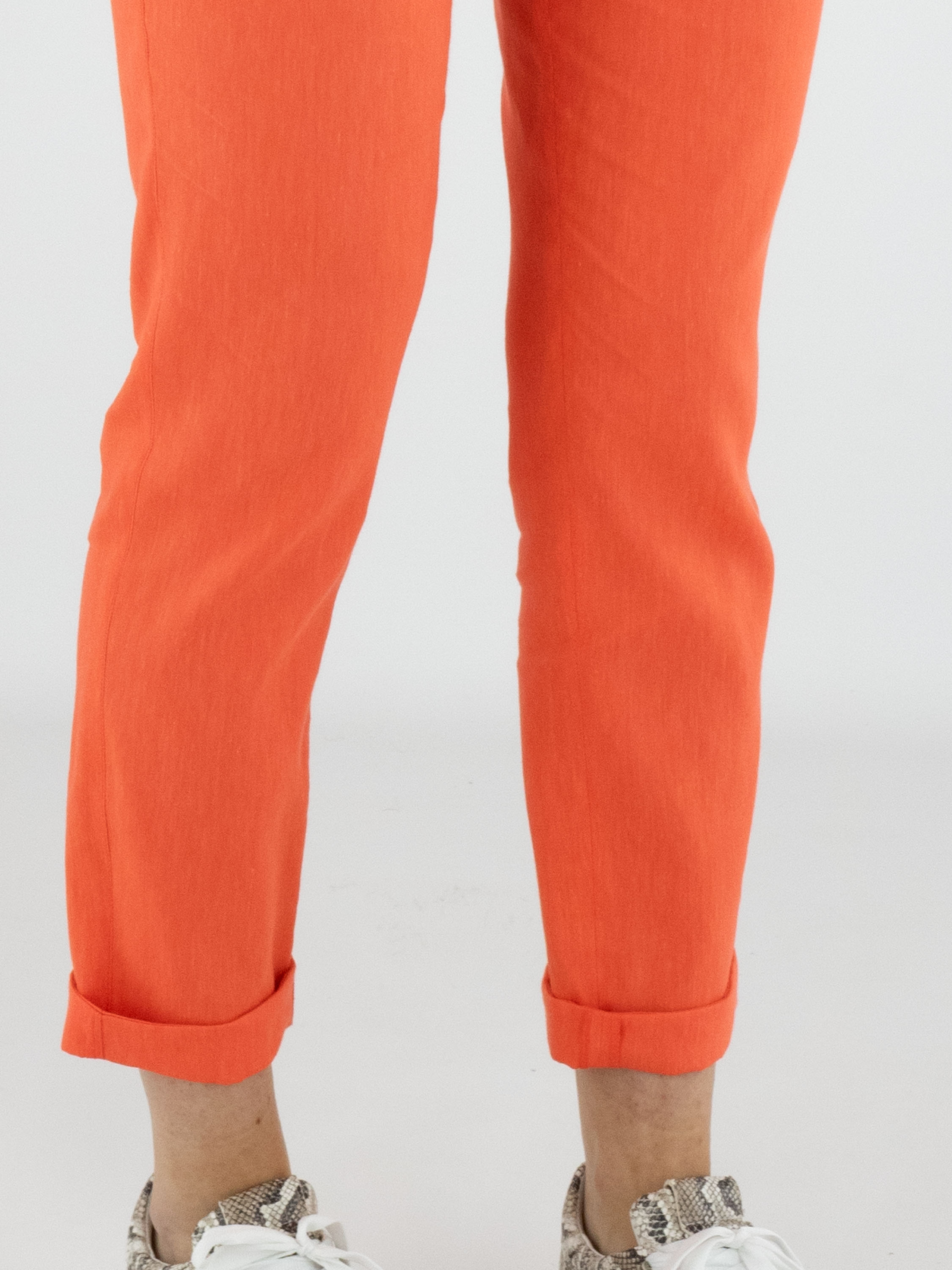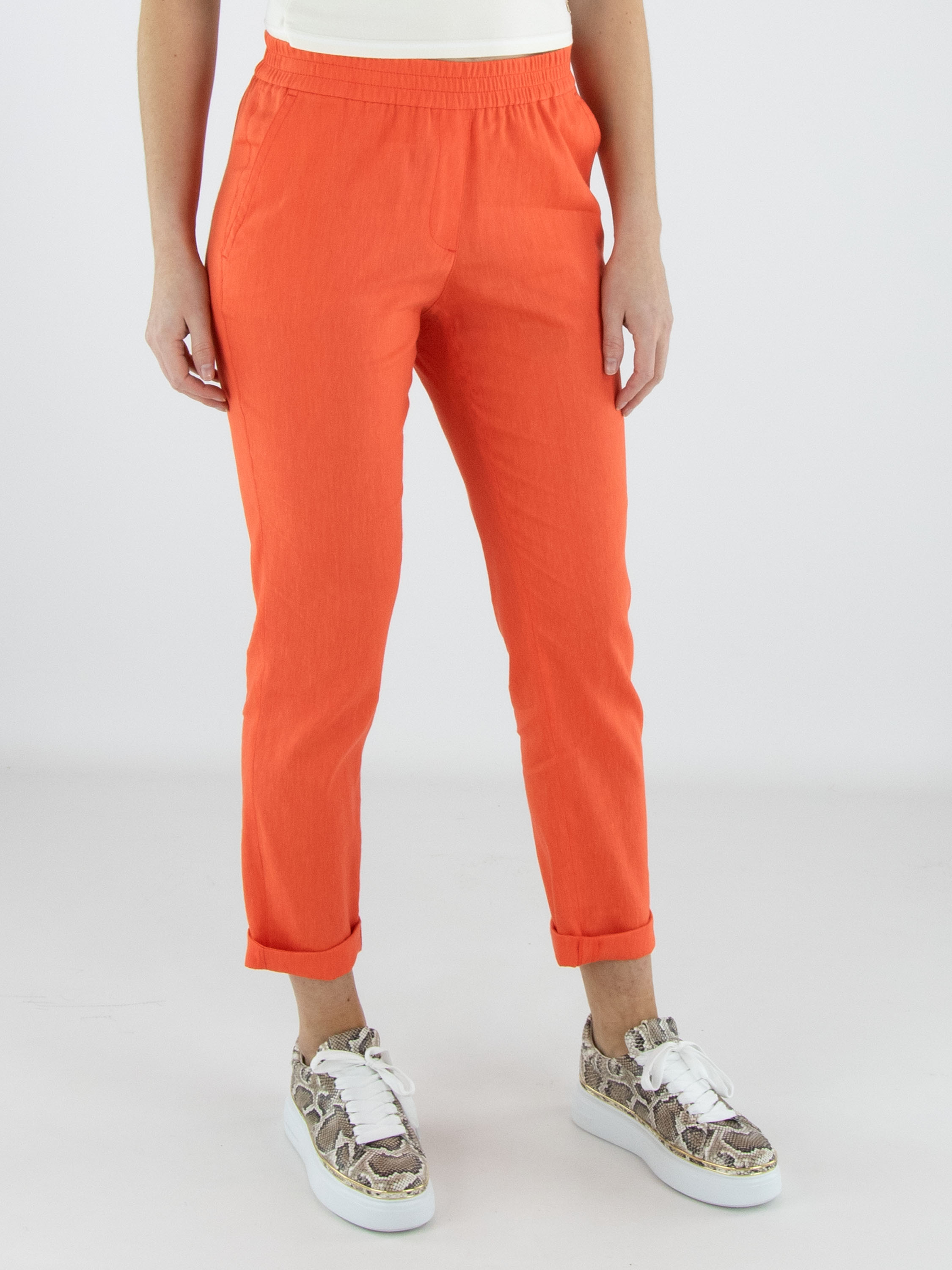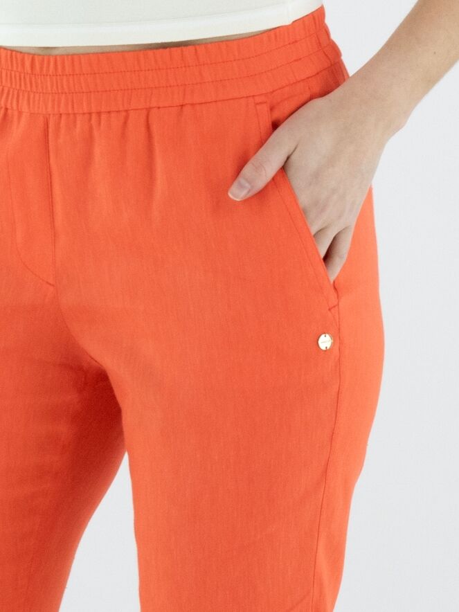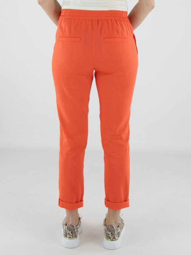 Broek van Marc Cain in een frisse koraalrode tint. In de taille is een brede, fijn geribbelde elastische band verwerkt, wat zorgt voor een comfortabele en moderne pasvorm. De broek heeft steekzakken en een korte omslag aan de onderzijde van de pijpen voor een eigentijdse afwerking. Deze broek kan op 30 graden worden gewassen.
