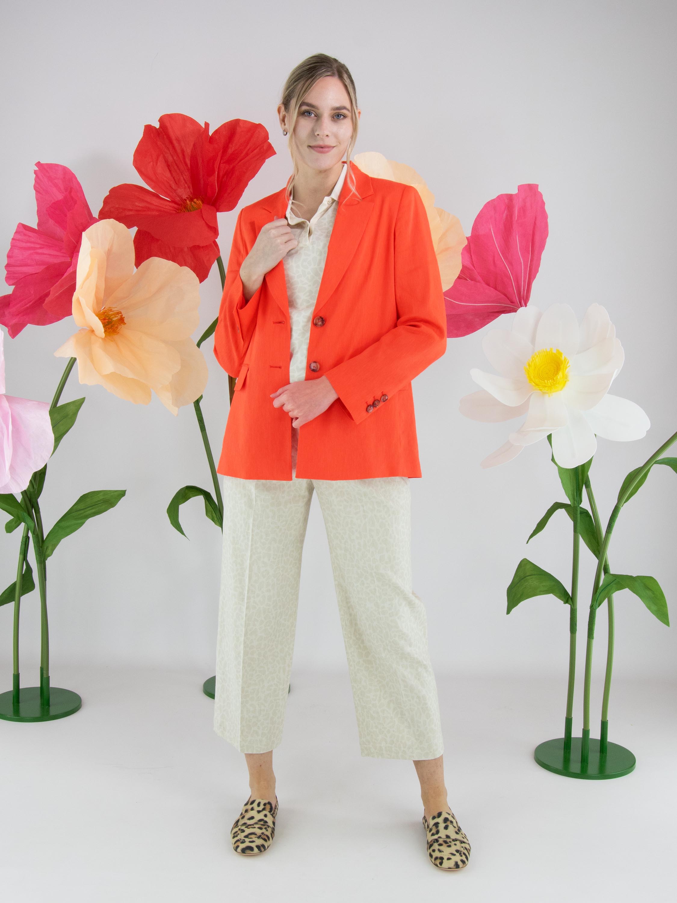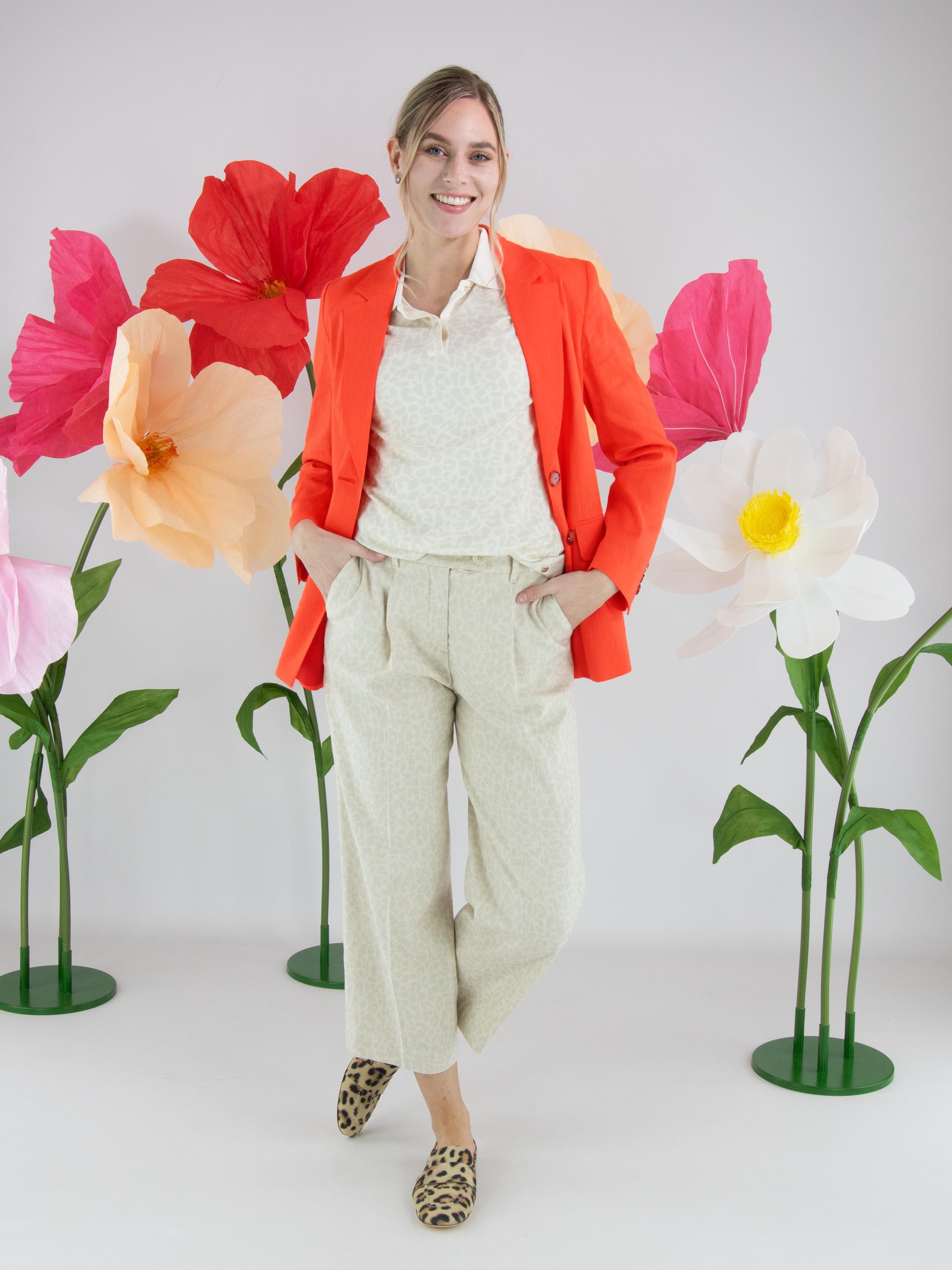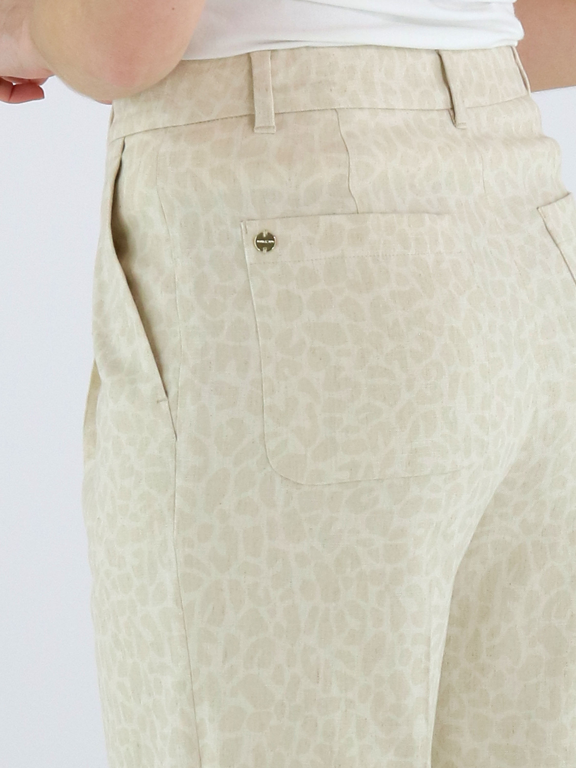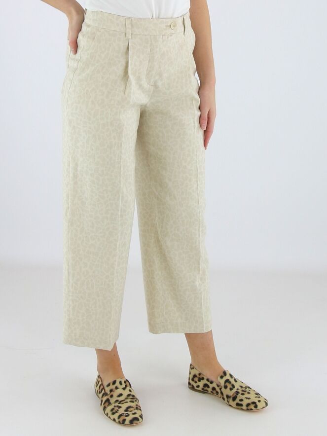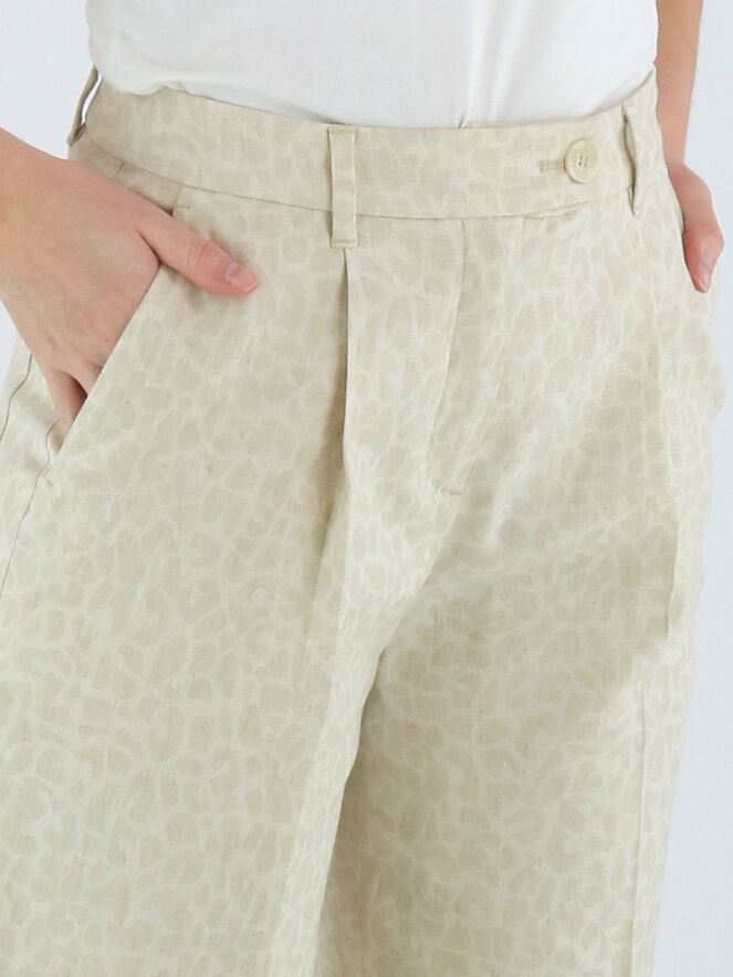 Broek van Marc Cain in een panterprint in de kleuren beige en roomwit. Direct onder de tailleband zijn enkele bandplooien aangebracht, wat zorgt voor een elegante en ontspannen valling. De broek is voorzien van steekzakken en heeft in het midden van de pijpen een ingestreken plooi voor een verfijnde uitstraling. Deze broek kan op 30 graden worden gewassen.