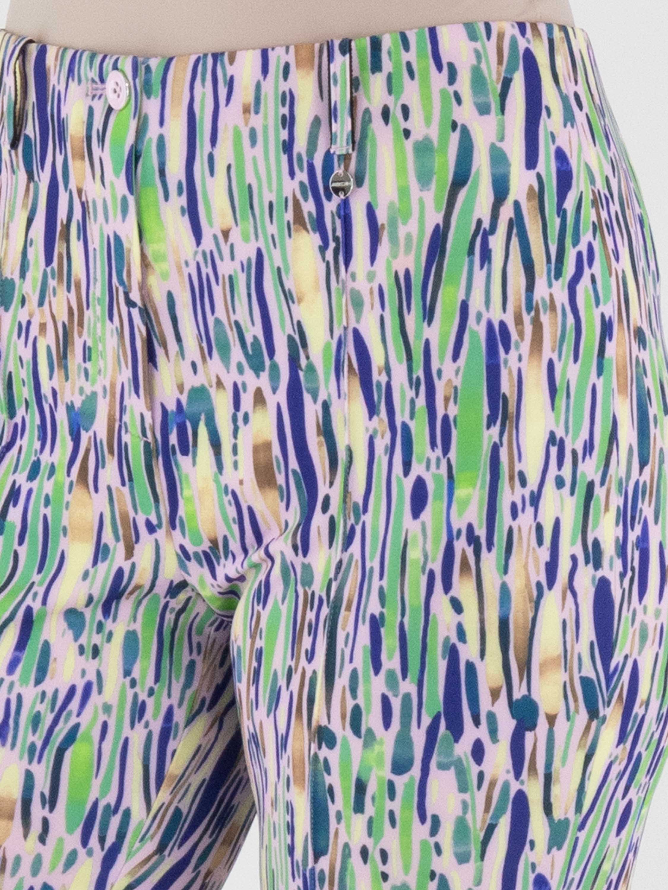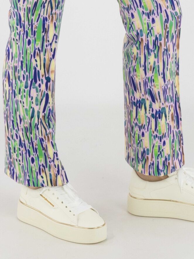 Een broek van Marc Cain met een confettiprint in meerdere tinten groen, blauw en bruin op een pastelroze achtergrond. In de taille zit een elastische band. In het midden van de pijpen loopt een omgekeerde stiknaad. Deze broek kan op 30 graden worden gewassen.