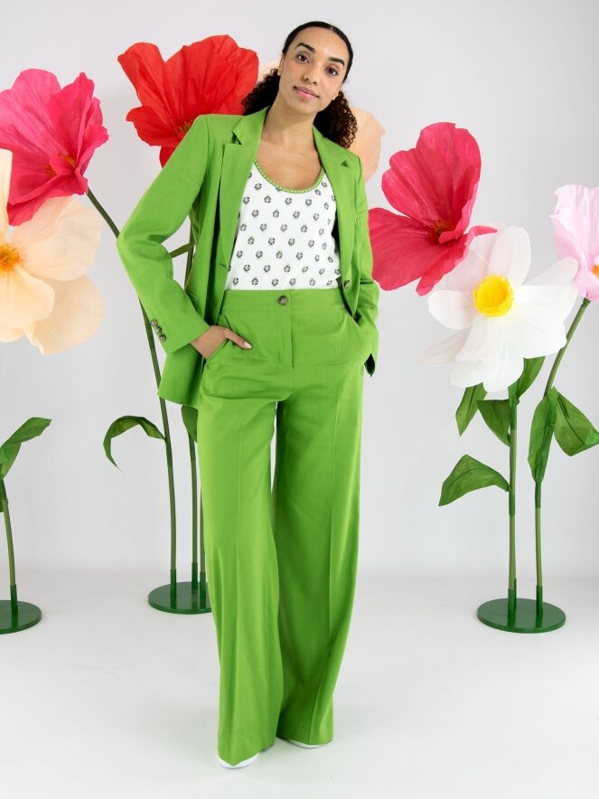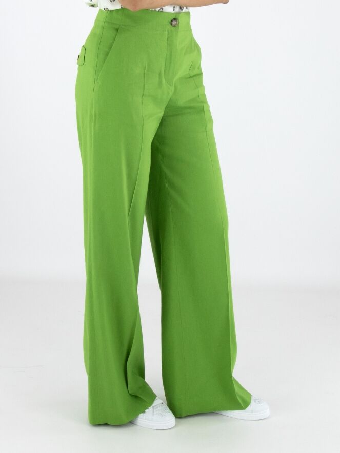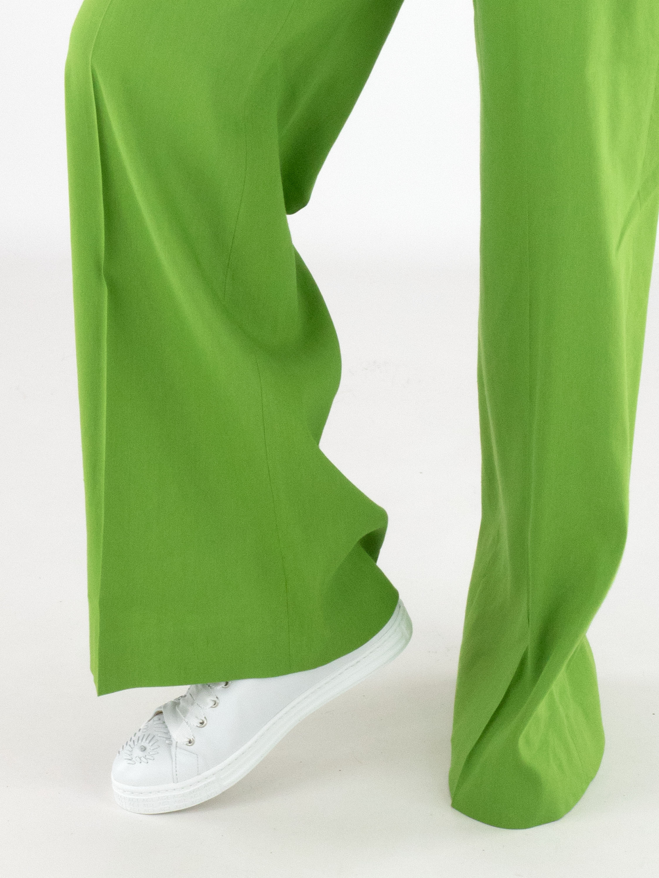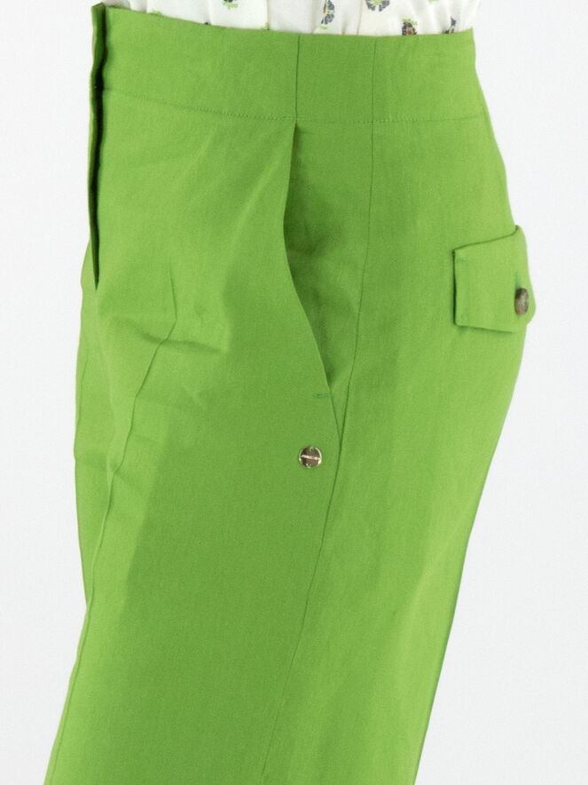 Broek van Marc Cain in een heldere groene tint. De broek is voorzien van steekzakken en heeft in het midden van de pijpen een ingestreken plooi, wat zorgt voor een elegante en verzorgde uitstraling. Deze broek kan op 30 graden worden gewassen.