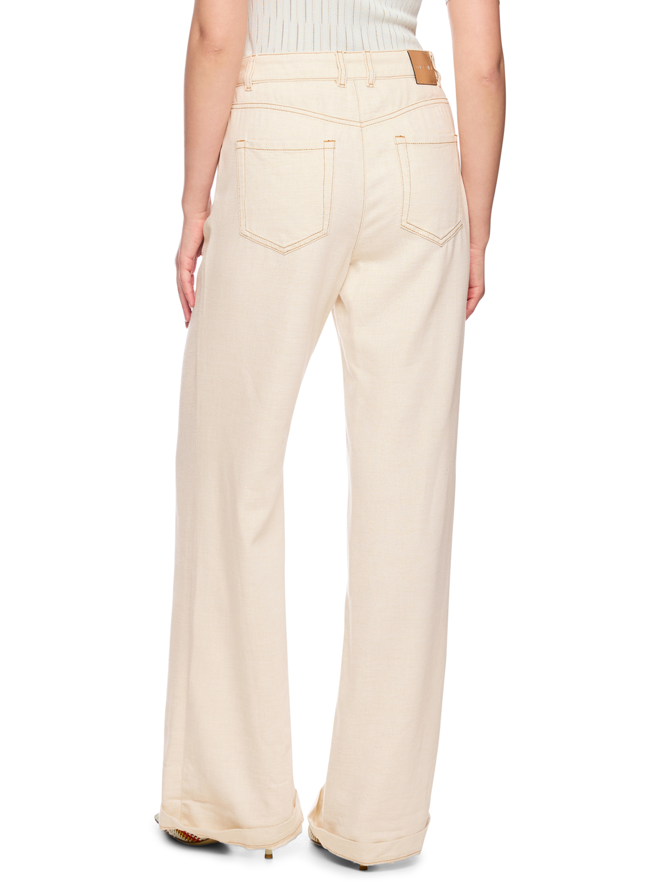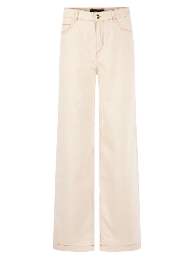 Wijde broek van Marc Cain in een beige tint met cognackleurige stiknaden. De broek vormt een perfecte combinatie met de bijpassende blazer van Marc Cain in dezelfde kleur en stof. Het model is uitgevoerd in een 5-pocket stijl. De zachte, hoogwaardige stof geeft de broek een luxe en nonchalante uitstraling. Deze broek kan op 30 graden worden gewassen.
