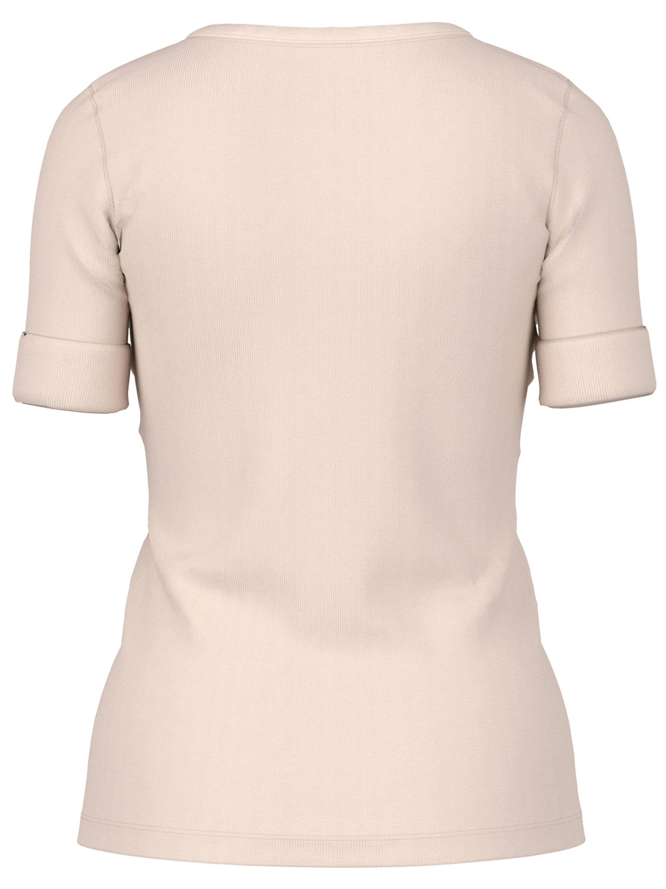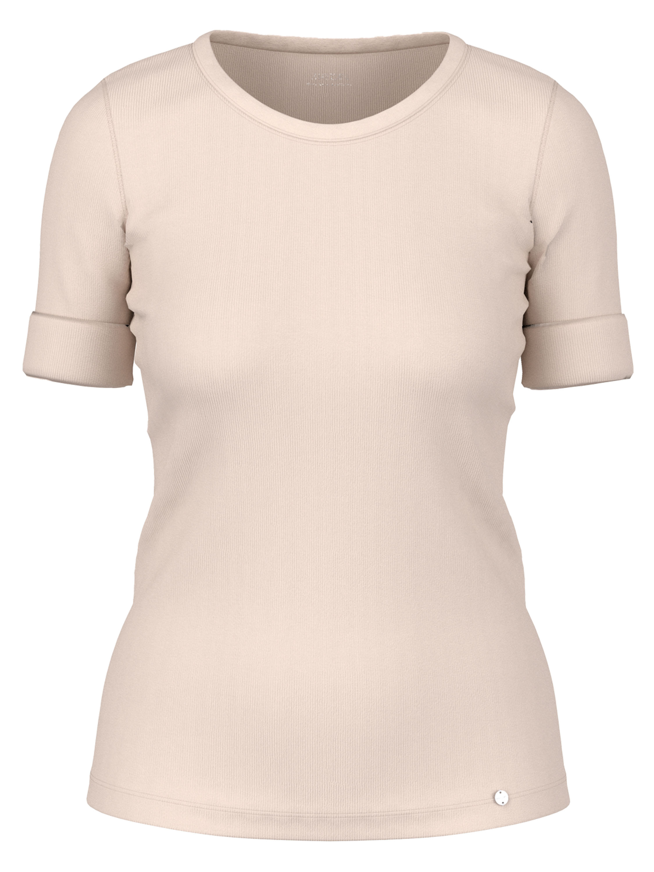 Shirt van Marc Cain in een fijn geribbelde stof in de kleur beige. Het shirt heeft een ronde hals en korte mouwen met een elegante omslag, wat zorgt voor een stijlvolle, casual uitstraling. Deze exclusieve designer top kan op 30 graden worden gewassen.