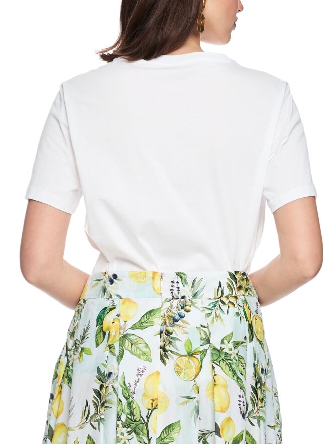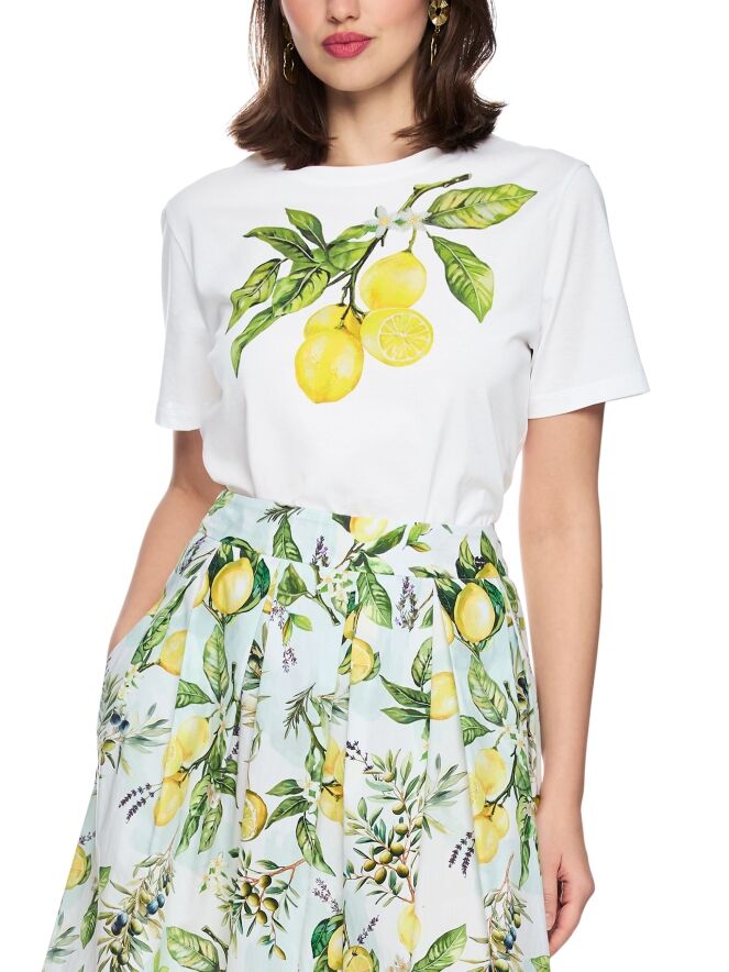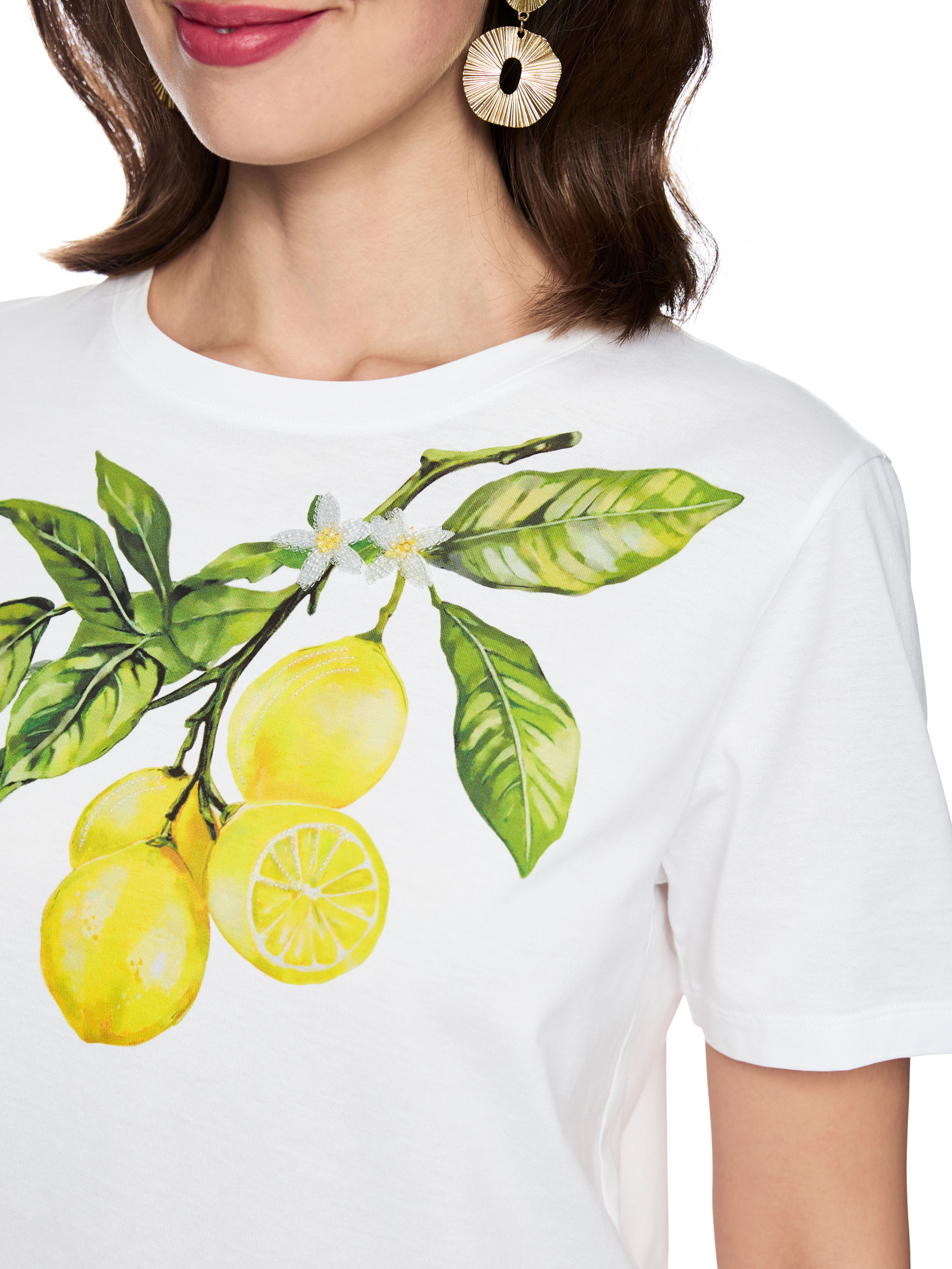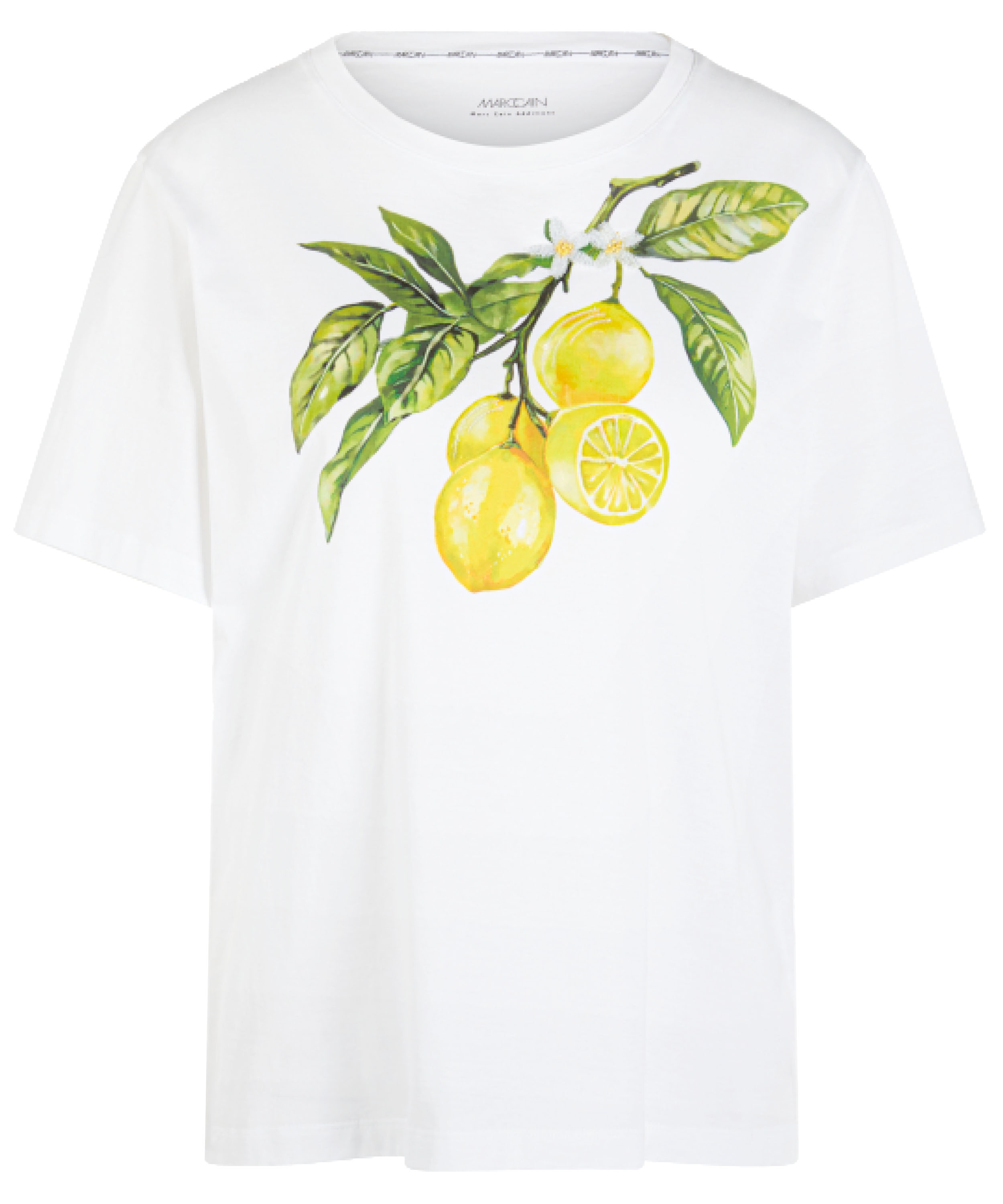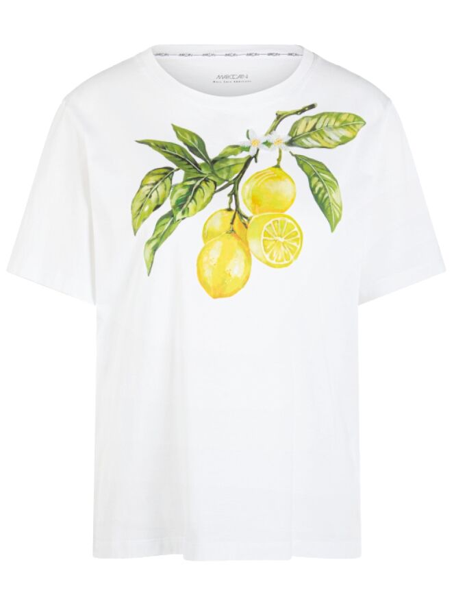 Een shirt van Marc Cain in de kleur wit met een opdruk aan de voorkant van enkele citroenen aan een tak met bladeren. Het shirt heeft korte mouwen en een ronde hals. Dit shirt kan op 30 graden worden gewassen.