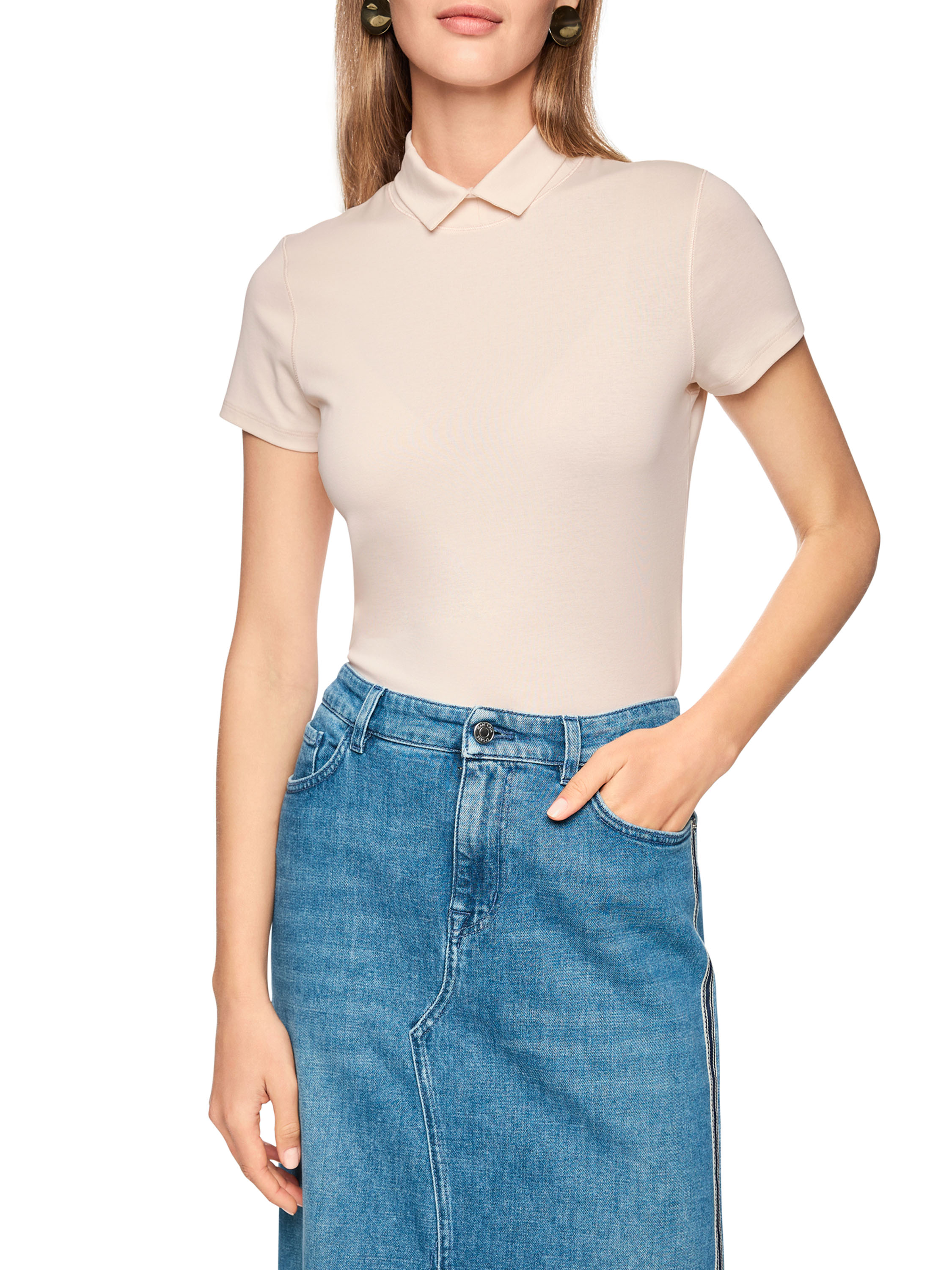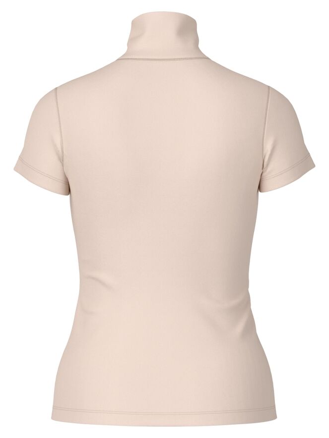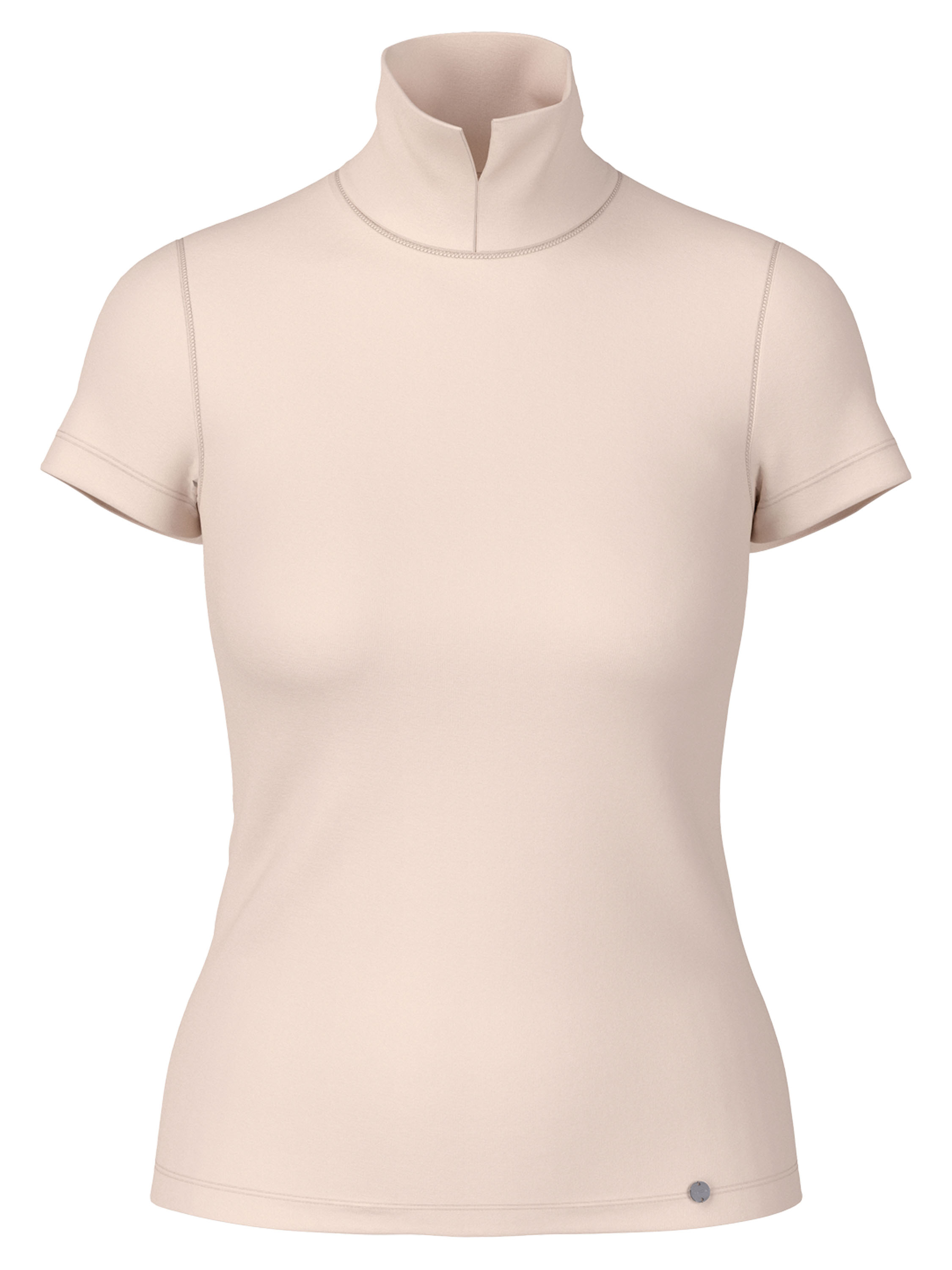 Shirt van Marc Cain in de kleur beige. Het shirt heeft korte mouwen en een turtlehals met een subtiel splitje middenvoor, wat zorgt voor een verfijnde en vrouwelijke uitstraling. Deze exclusieve designer top kan op 30 graden worden gewassen.