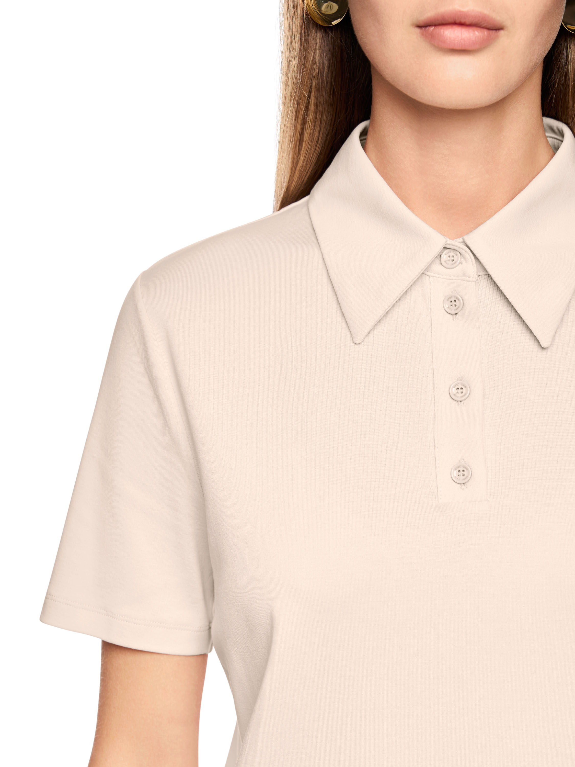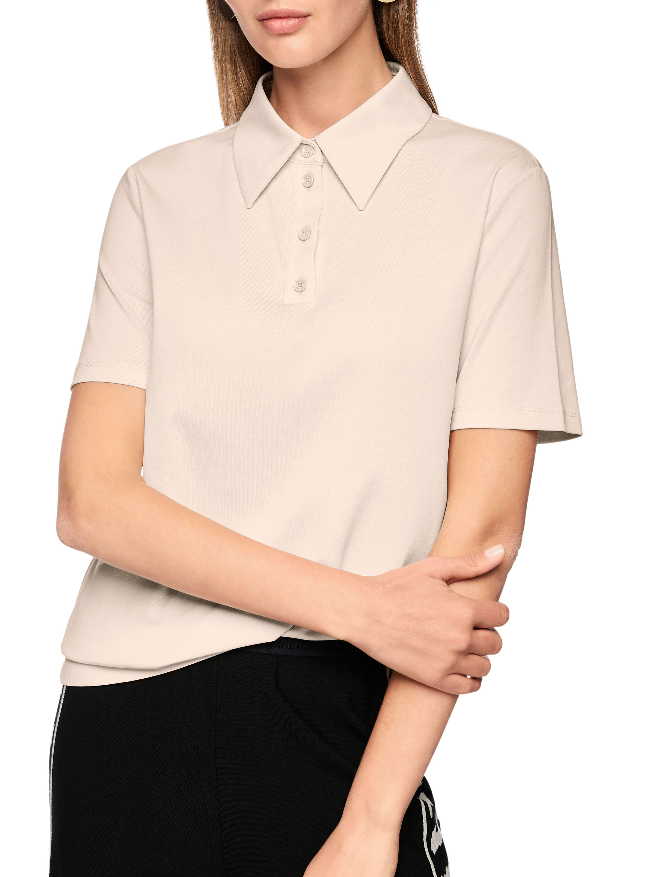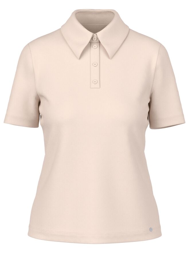 Poloshirt van Marc Cain in de kleur beige. Dit elegante shirt in uni kleur heeft korte mouwen en combineert een sportieve uitstraling met de verfijnde stijl die kenmerkend is voor Marc Cain. Deze exclusieve designerpolo kan op 30 graden worden gewassen.