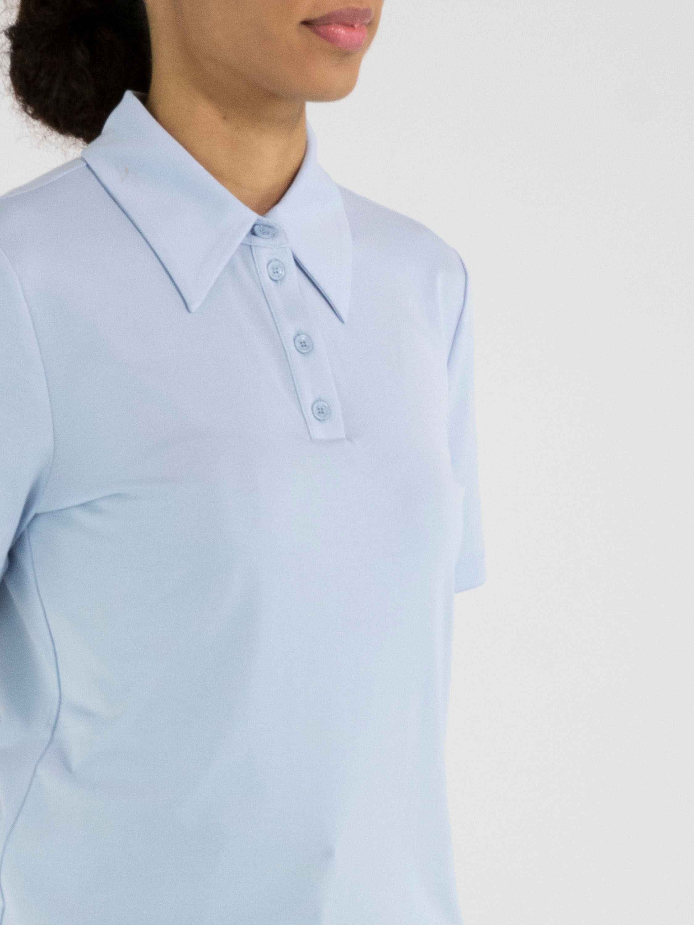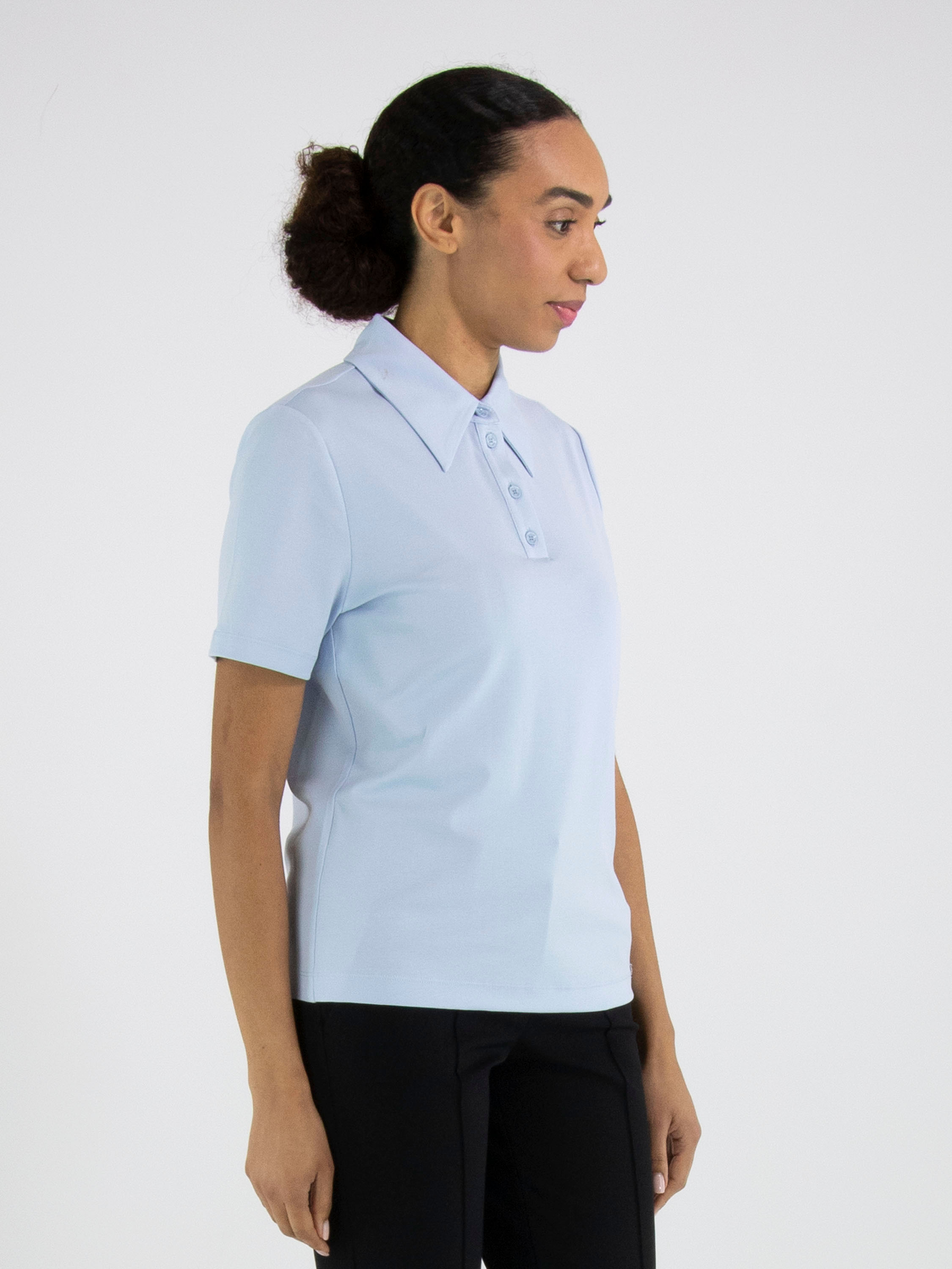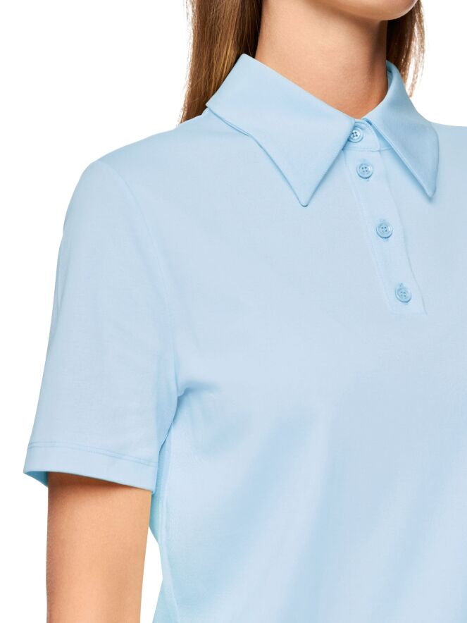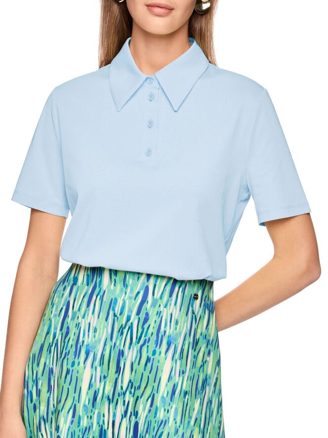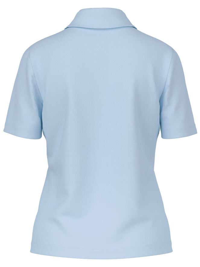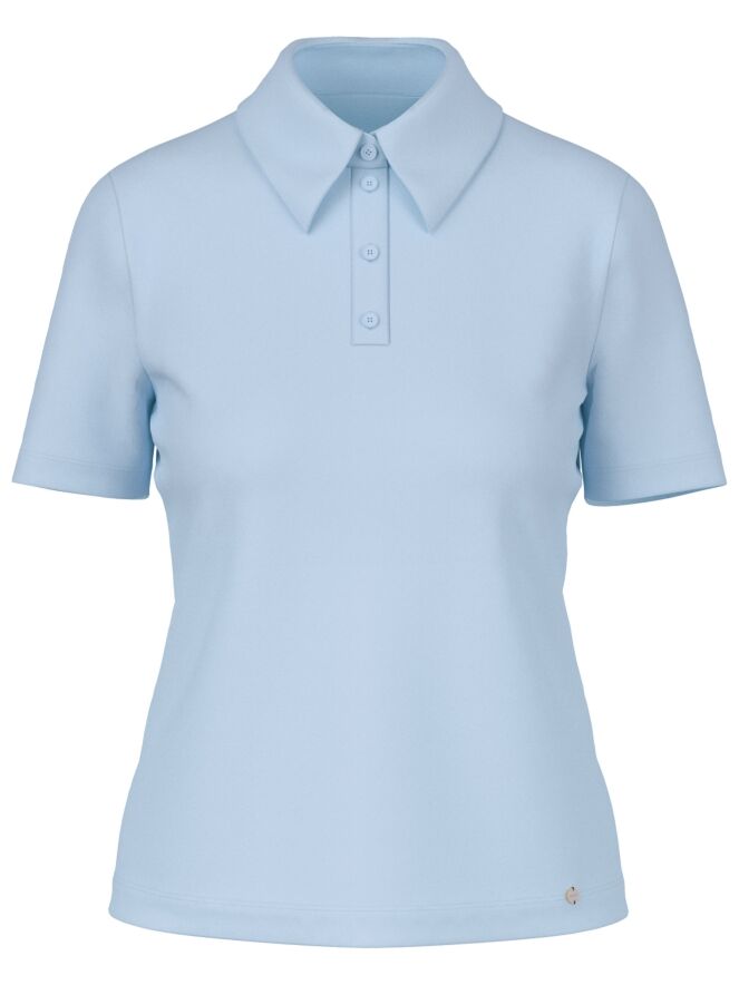 Polo shirt van Marc Cain in een zachte pastelblauwe tint. Dit model is volledig uitgevoerd in een uni kleur en heeft korte mouwen, wat zorgt voor een frisse, sportief-elegante uitstraling. Deze exclusieve designer polo kan op 30 graden worden gewassen.
