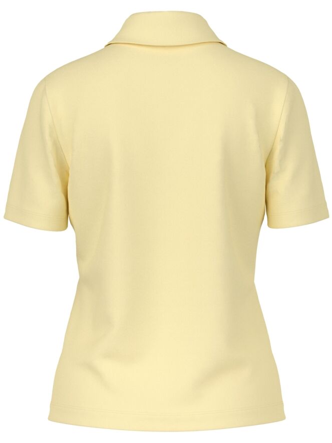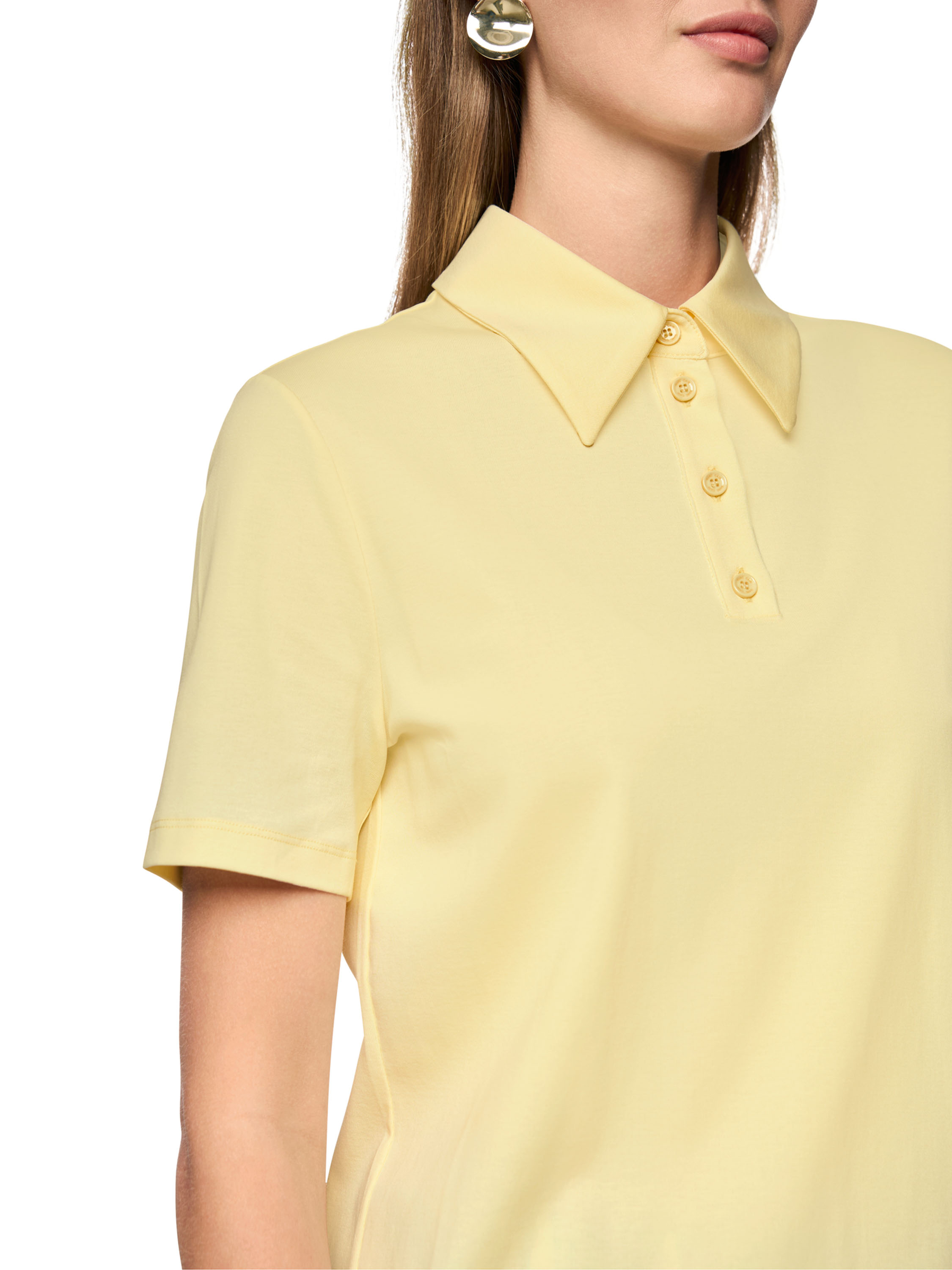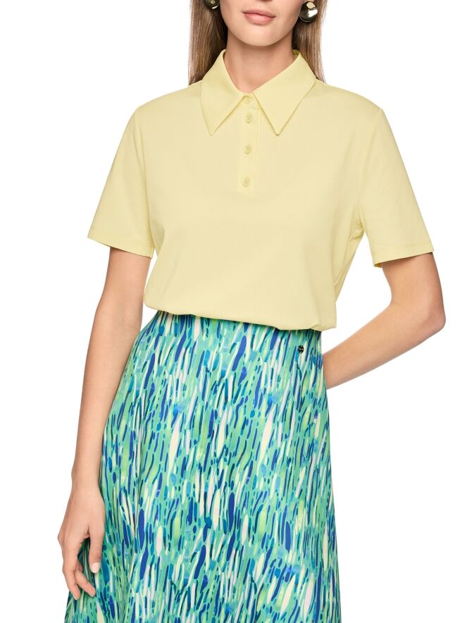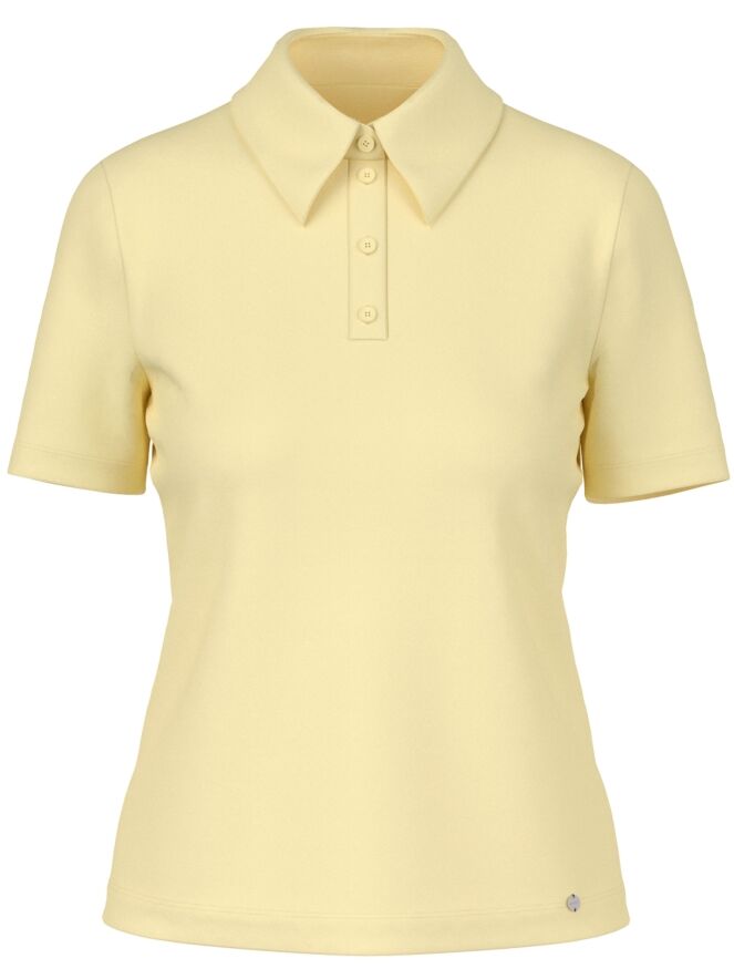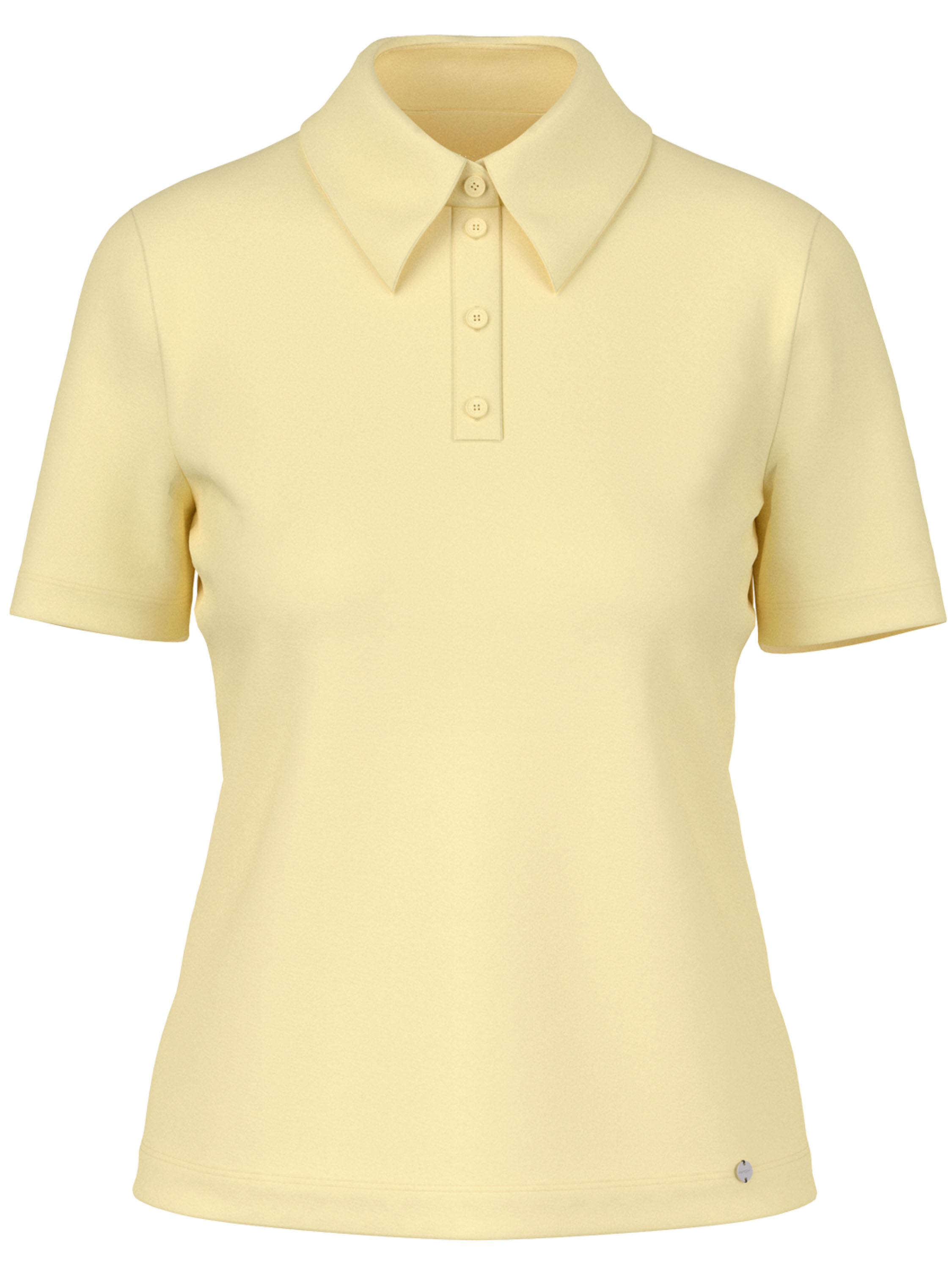 Poloshirt van Marc Cain in een zachte pastedgele tint. Dit elegante shirt in uni kleur heeft korte mouwen en straalt tijdloze klasse en verfijnde eenvoud uit — perfect voor een stijlvolle, zomerse look. Deze exclusieve designerpolo kan op 30 graden worden gewassen.
