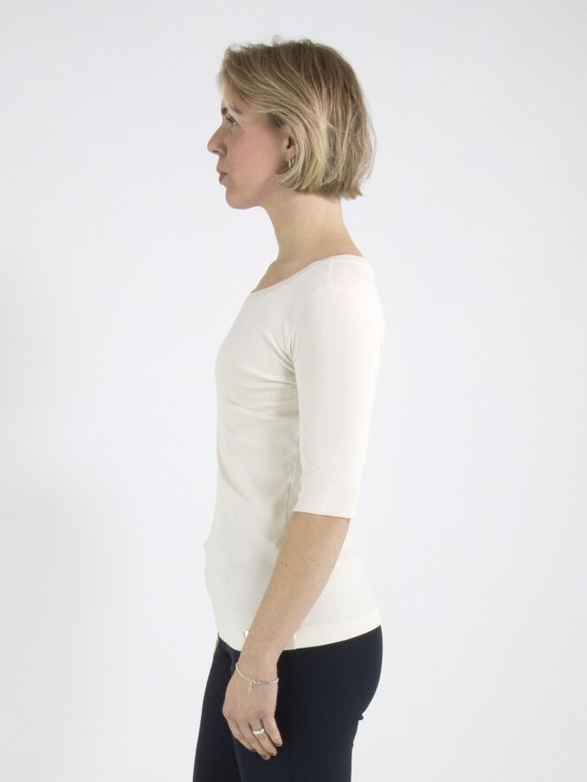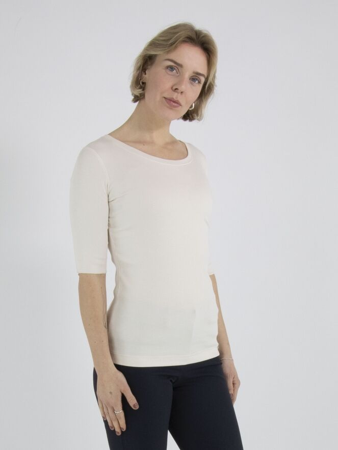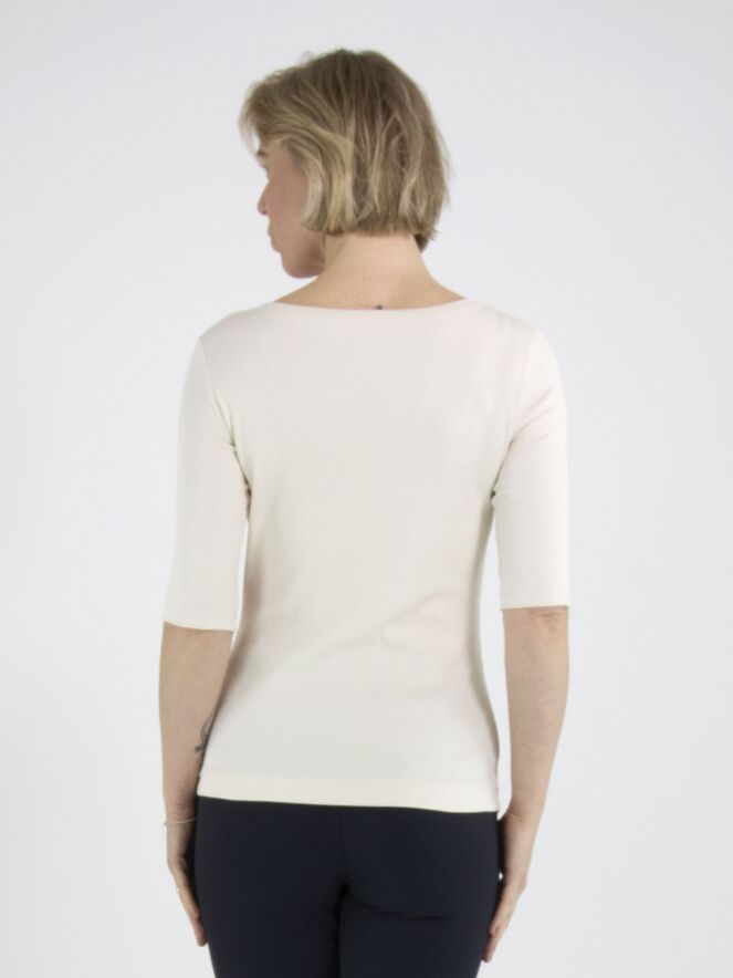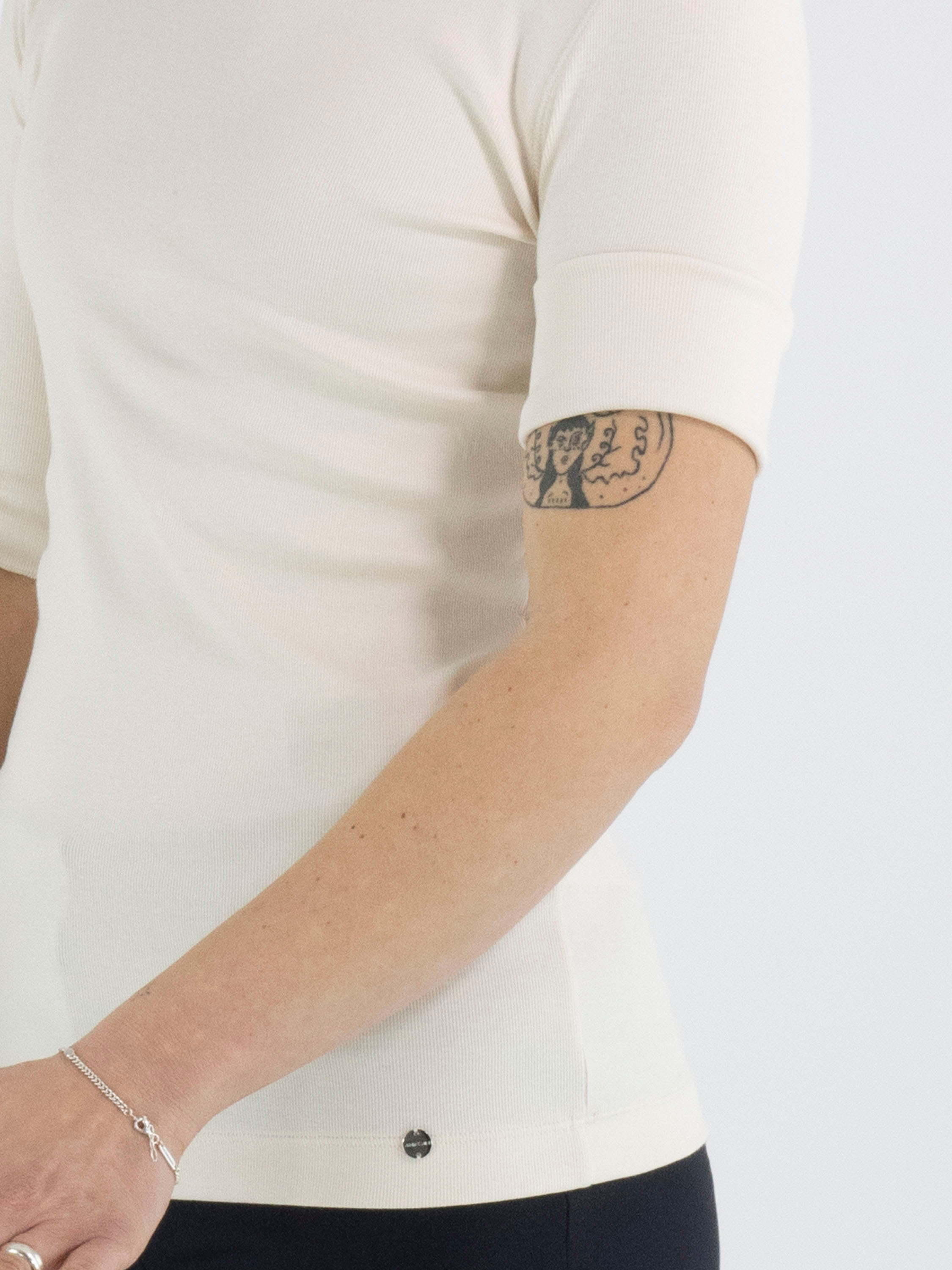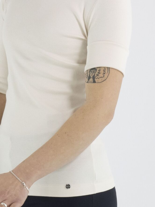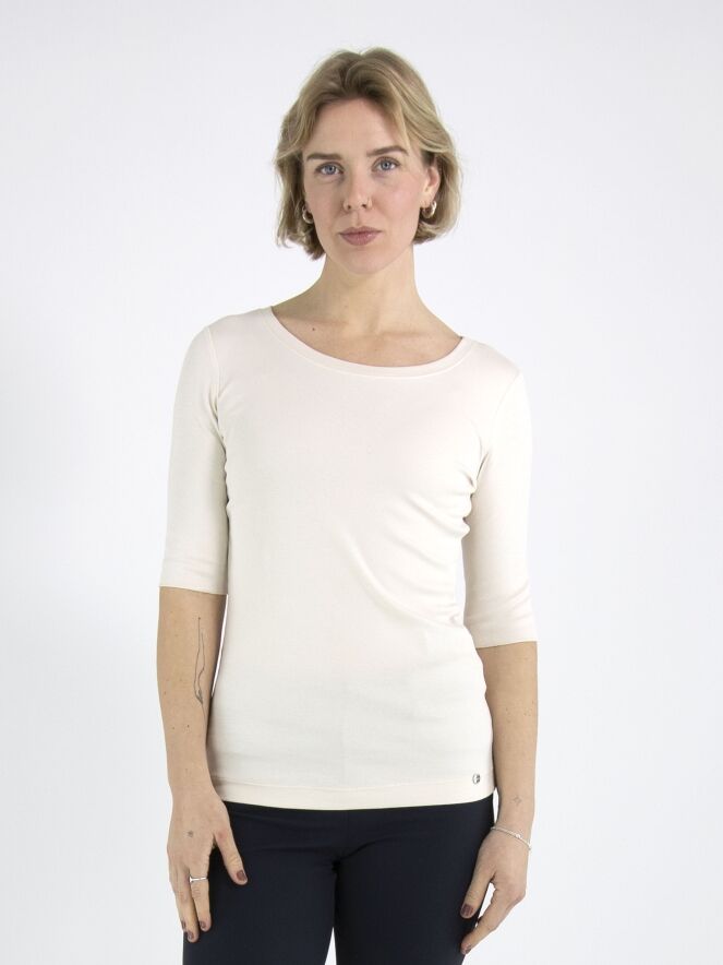 Shirt van Marc Cain in een fijn geribbelde stof in de kleur beige. Het shirt heeft een ronde hals en korte mouwen met een elegante omslag, wat zorgt voor een stijlvolle, casual uitstraling. Deze exclusieve designer top kan op 30 graden worden gewassen.