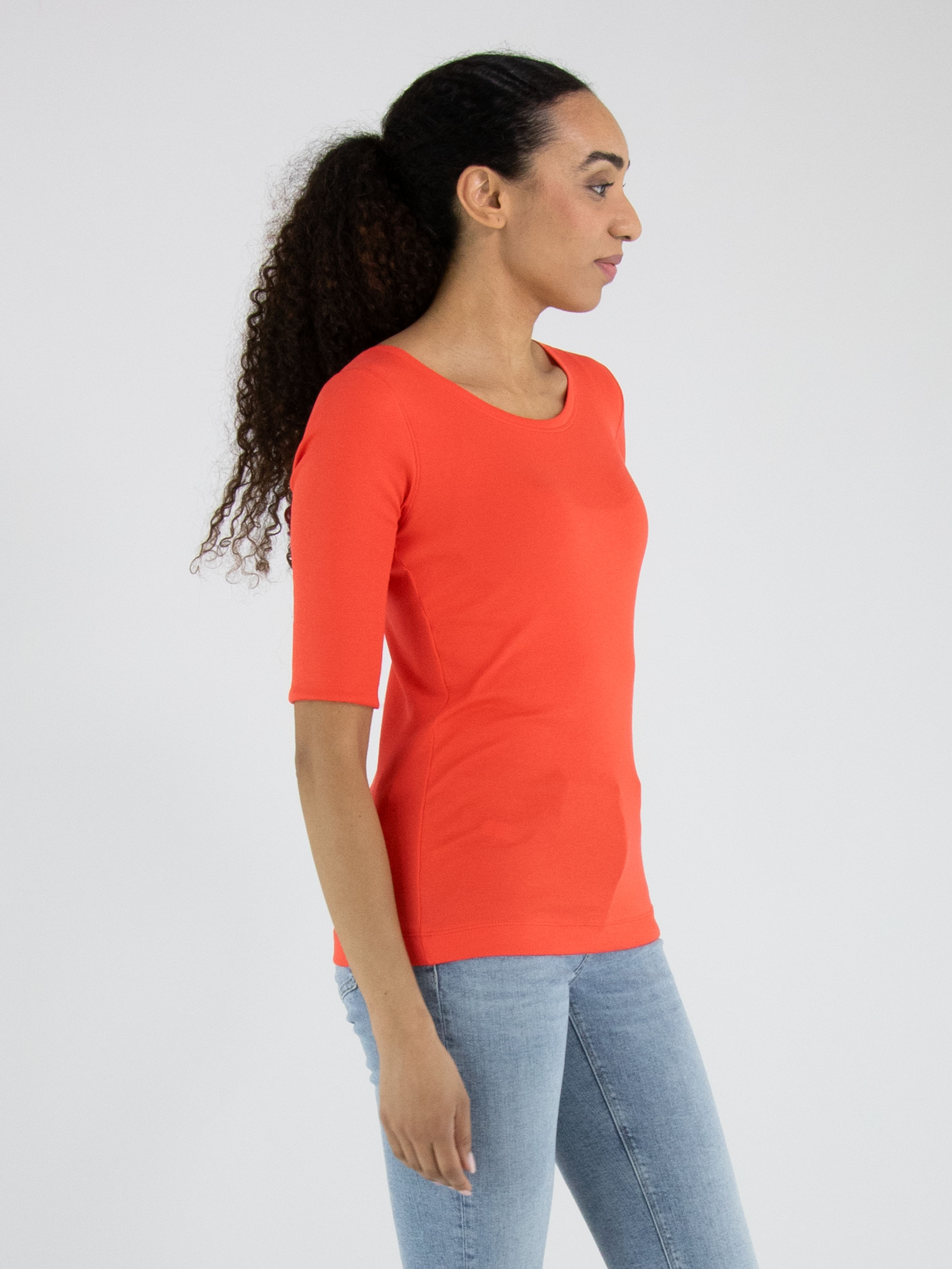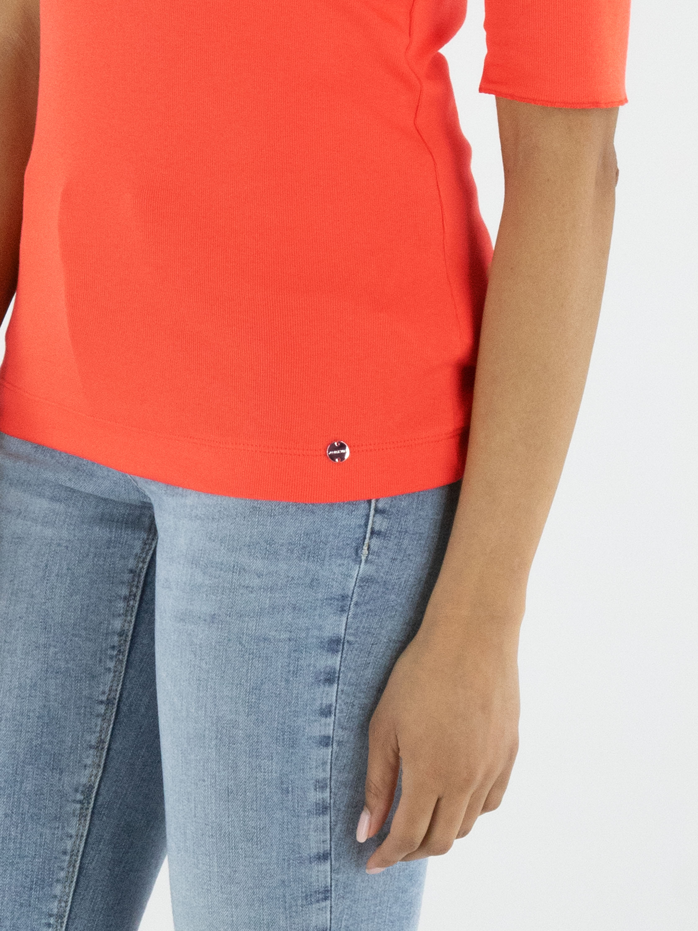 Shirt van Marc Cain in een fijn geribbelde stof in een levendige oranje tint. Het shirt heeft een ronde hals en korte mouwen met een stijlvolle omslag, wat zorgt voor een moderne en vrouwelijke uitstraling. Deze exclusieve designer top kan op 30 graden worden gewassen.