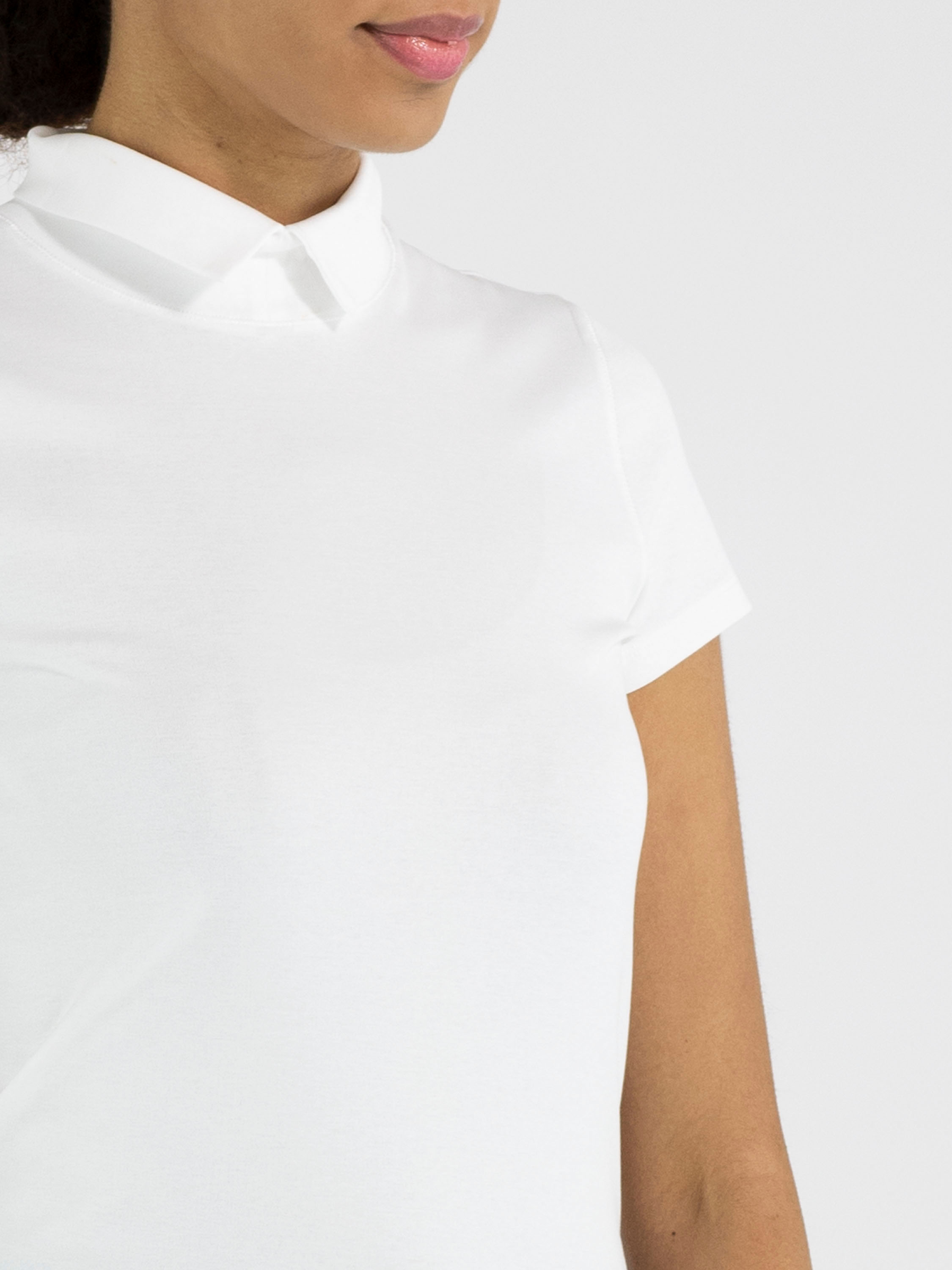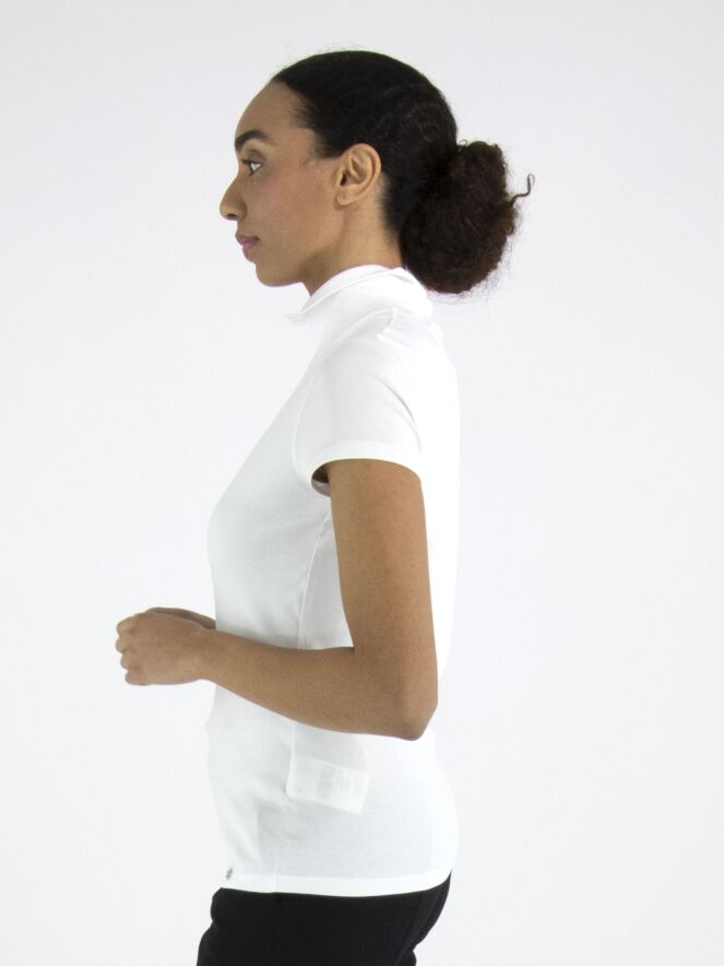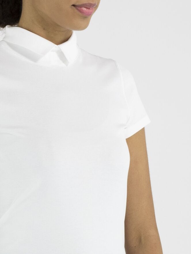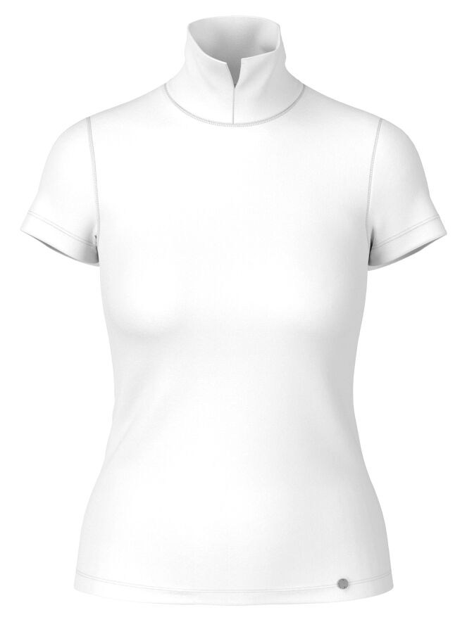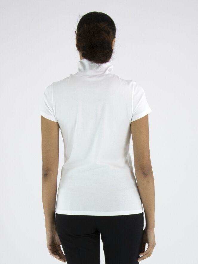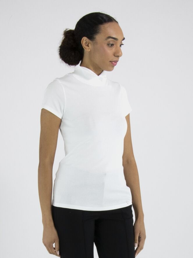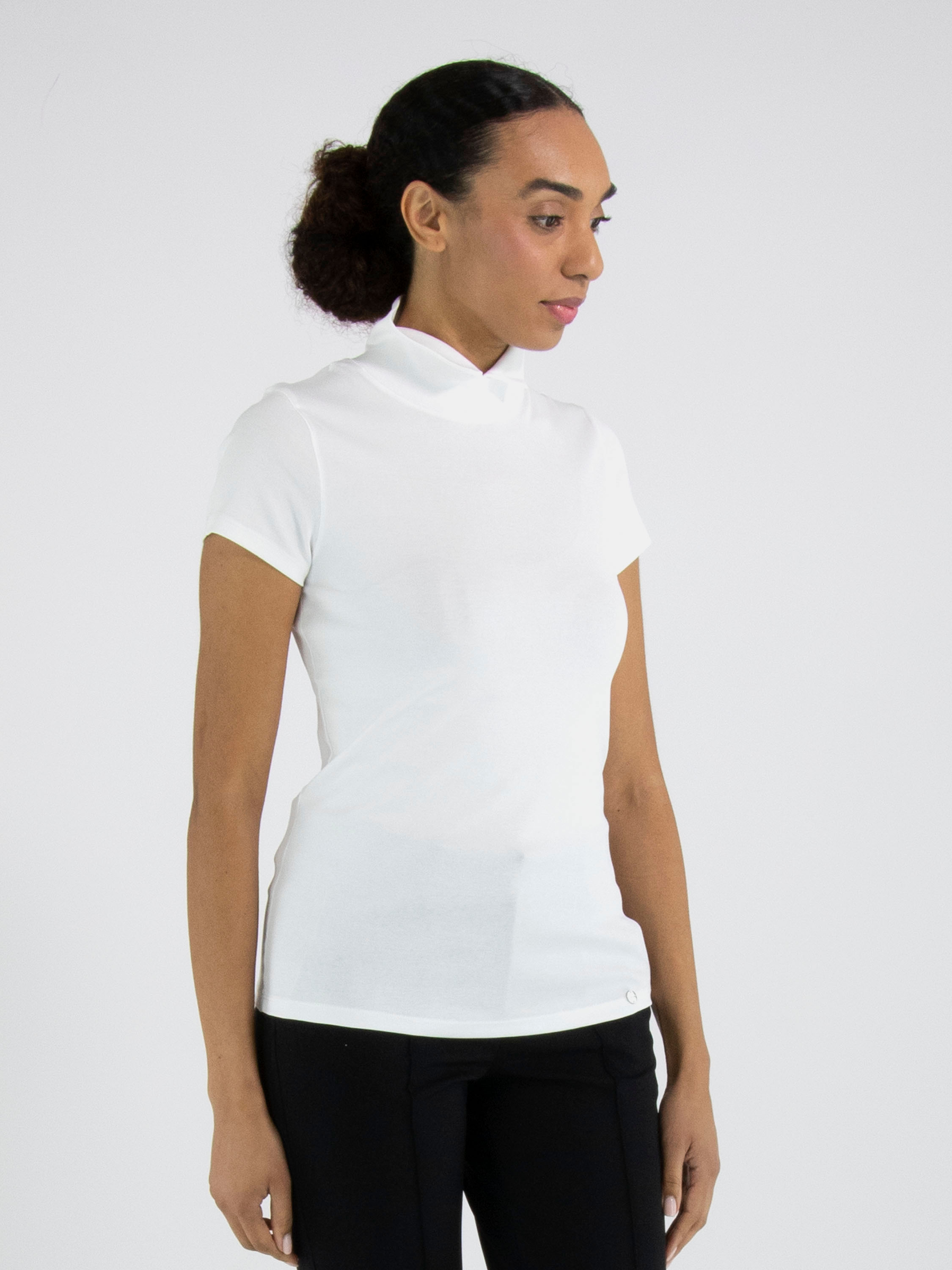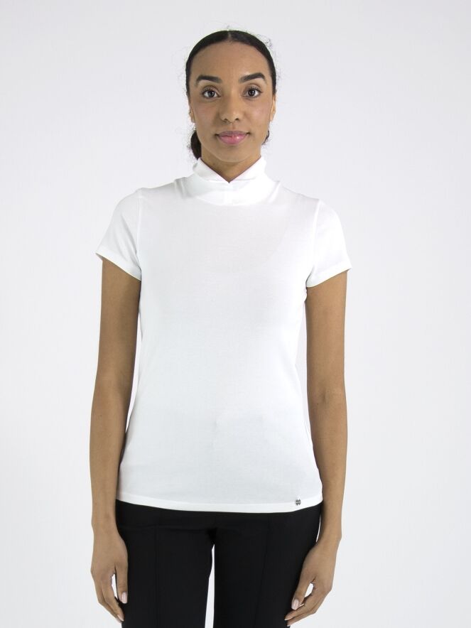 Shirt van Marc Cain in de kleur wit. Dit stijlvolle shirt heeft korte mouwen en een verfijnde turtlehals met een subtiel splitje middenvoor, wat zorgt voor een moderne en vrouwelijke uitstraling. Deze exclusieve dames top kan op 30 graden worden gewassen.