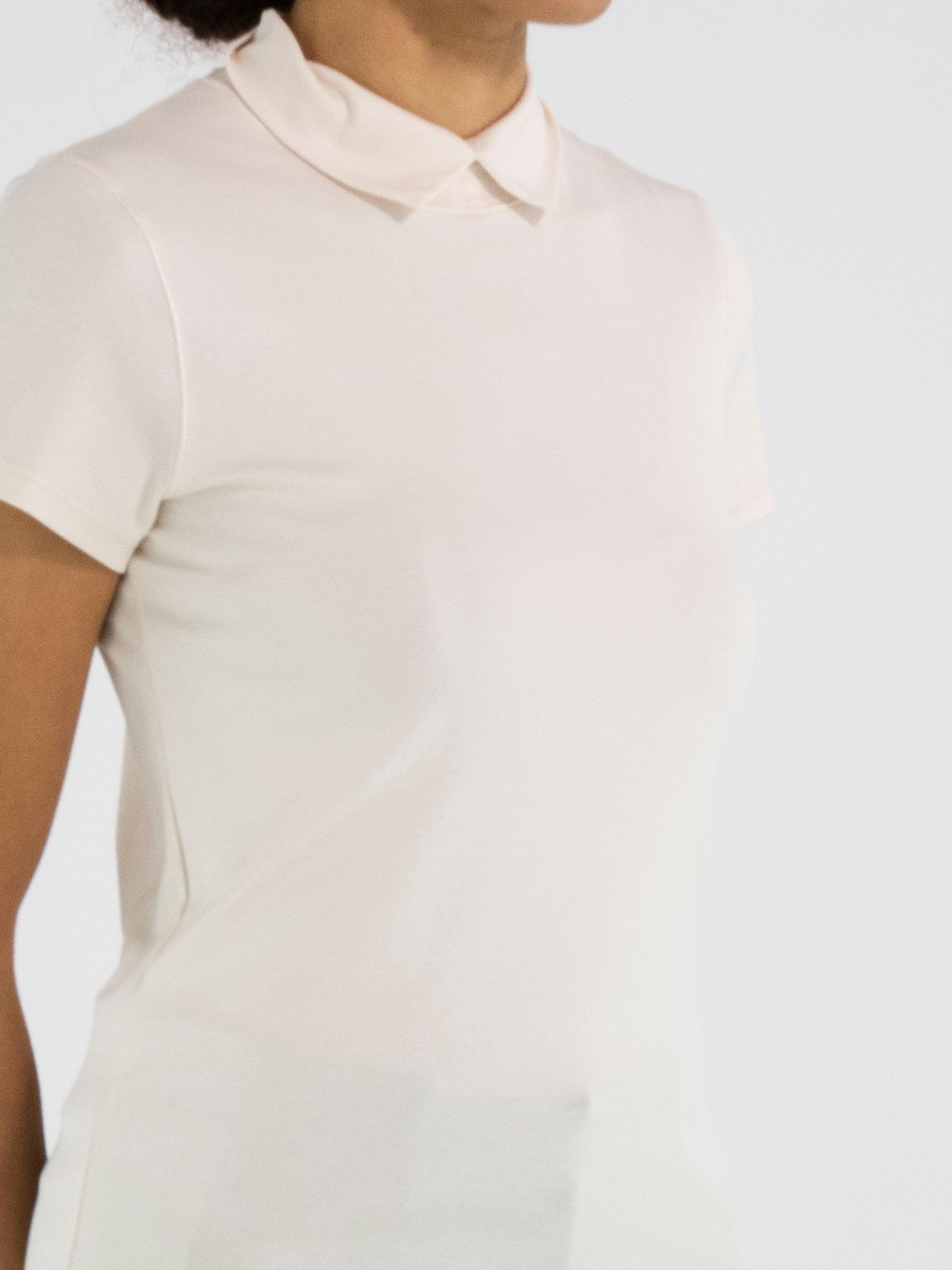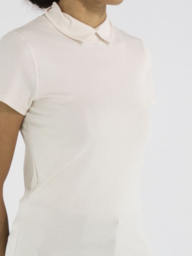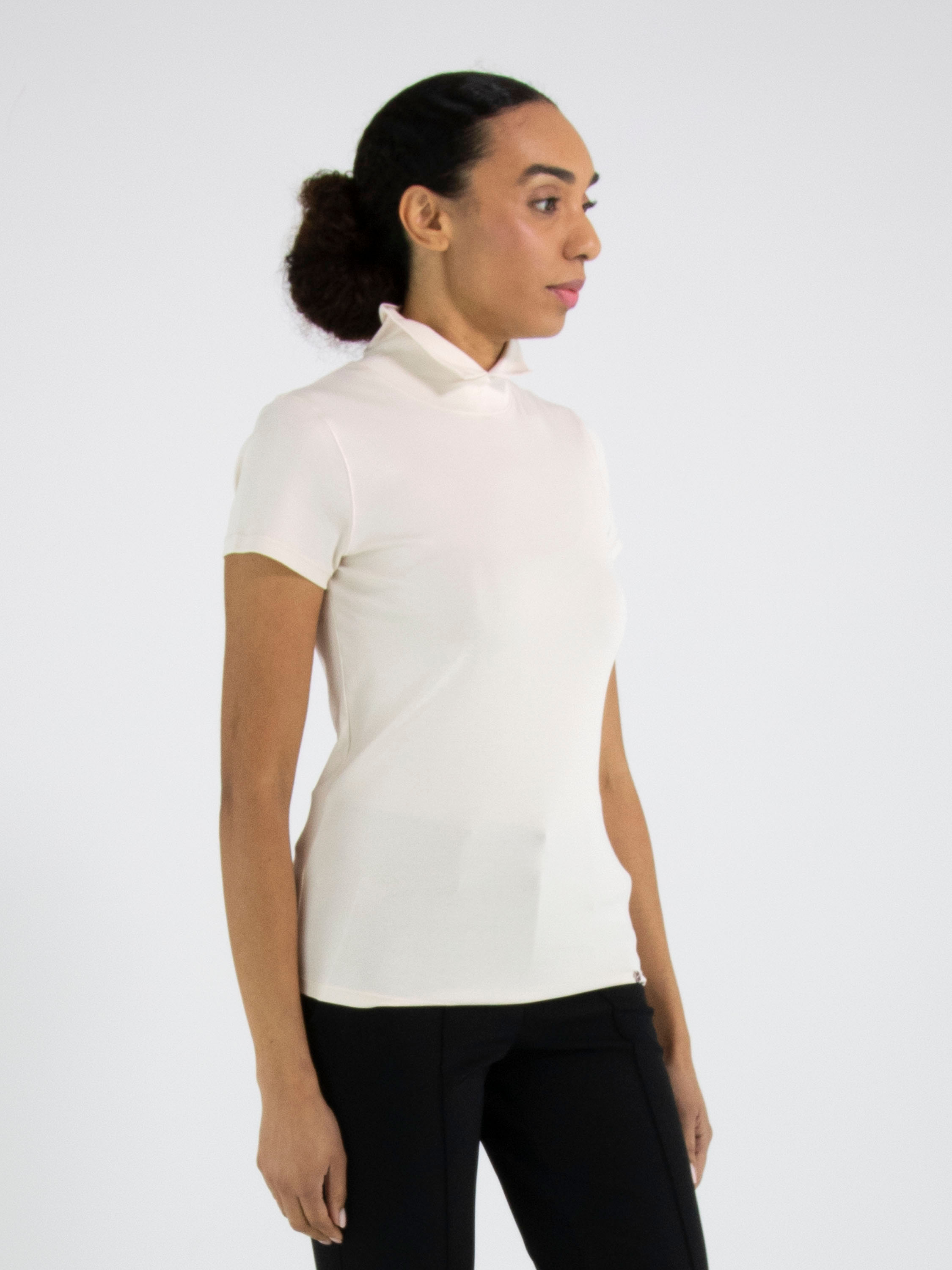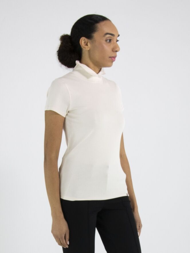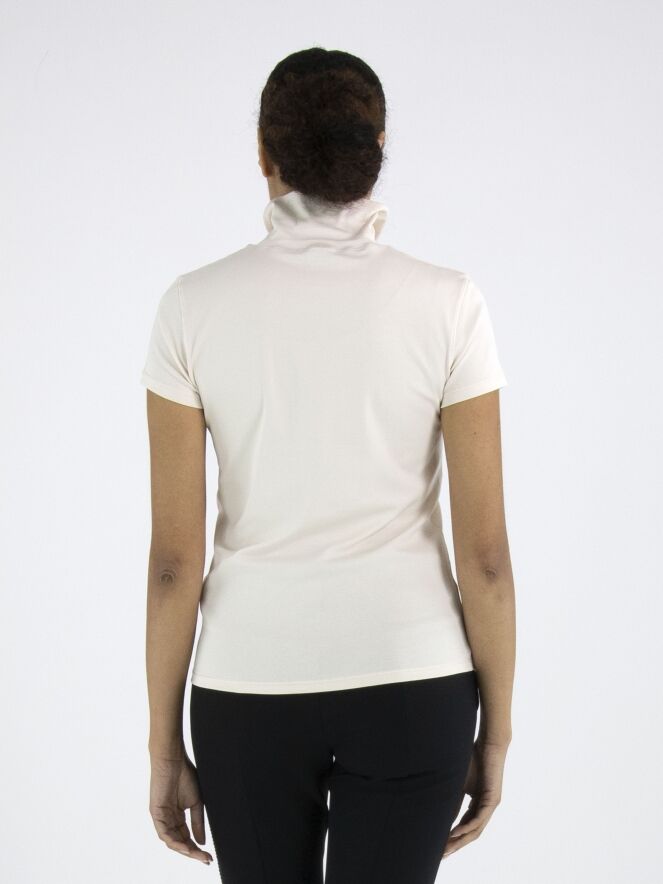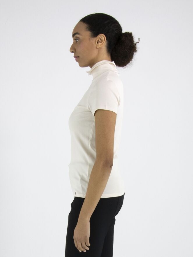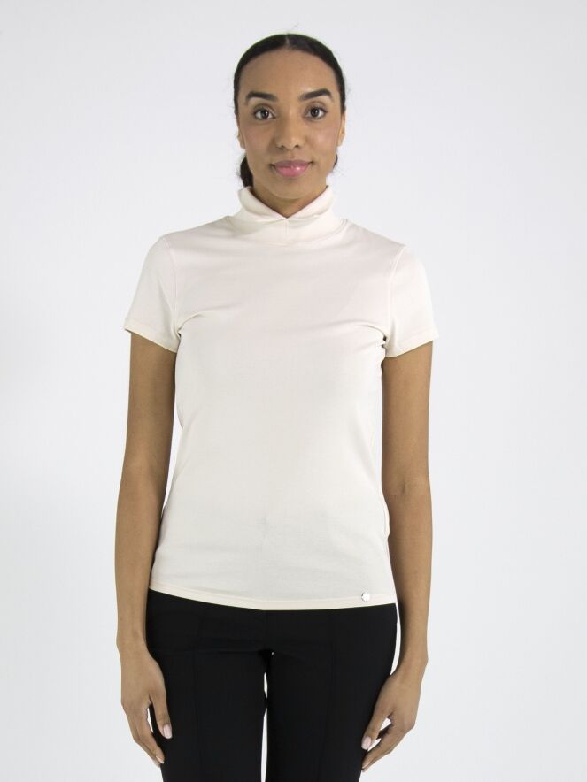 Shirt van Marc Cain in de kleur beige. Het shirt heeft korte mouwen en een turtlehals met een subtiel splitje middenvoor, wat zorgt voor een verfijnde en vrouwelijke uitstraling. Deze exclusieve designer top kan op 30 graden worden gewassen.
