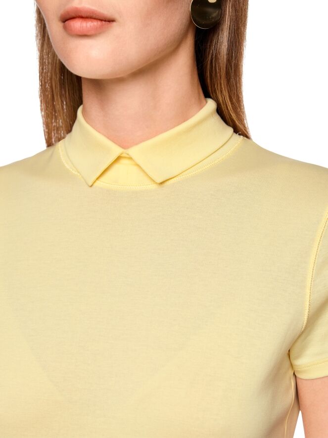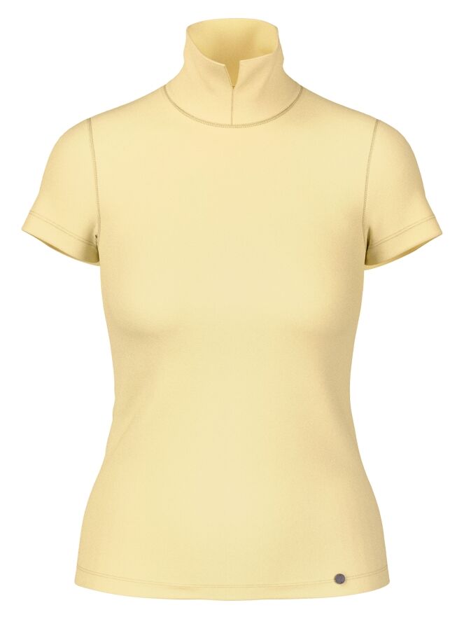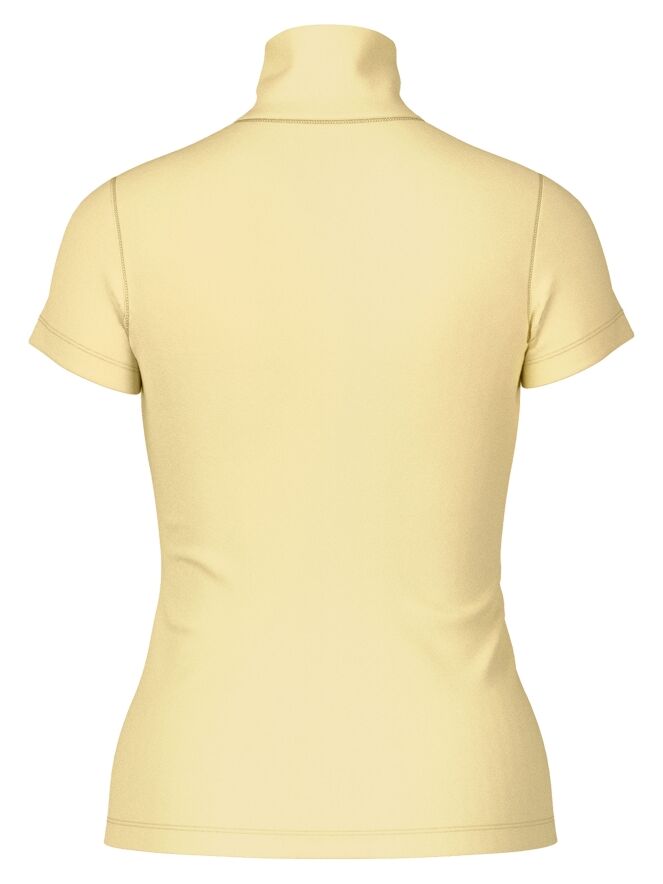 Shirt van Marc Cain in een zachte pastelgele tint. Het shirt heeft korte mouwen en een turtlehals met een klein splitje middenvoor, wat zorgt voor een elegante en vrouwelijke uitstraling. Deze exclusieve dames top kan op 30 graden worden gewassen.