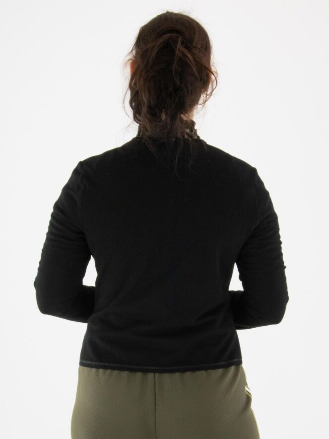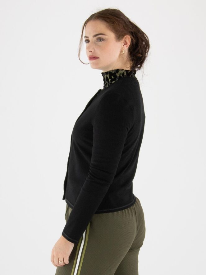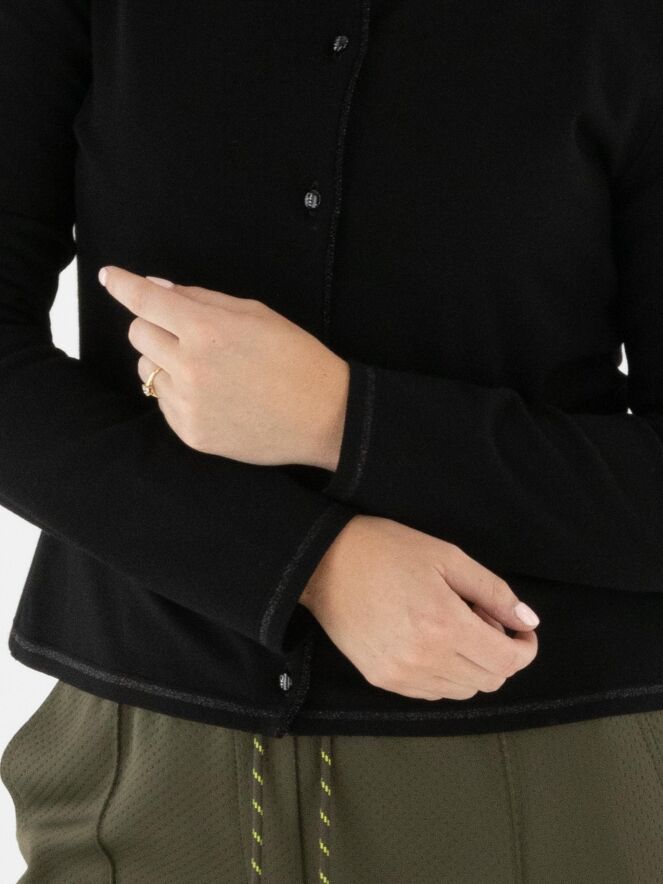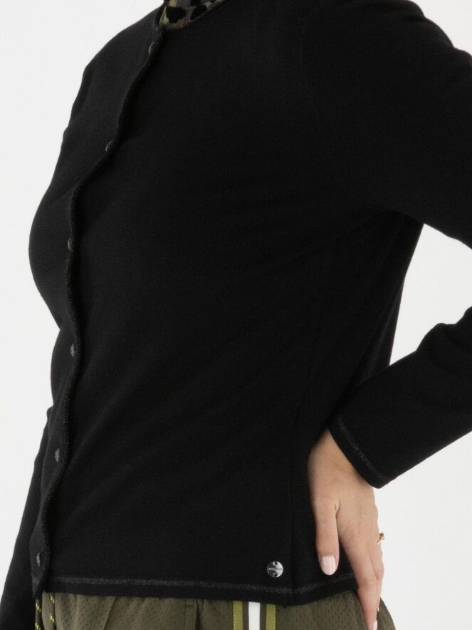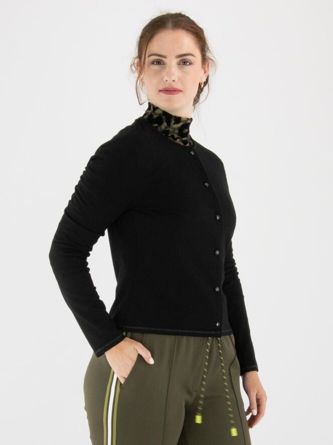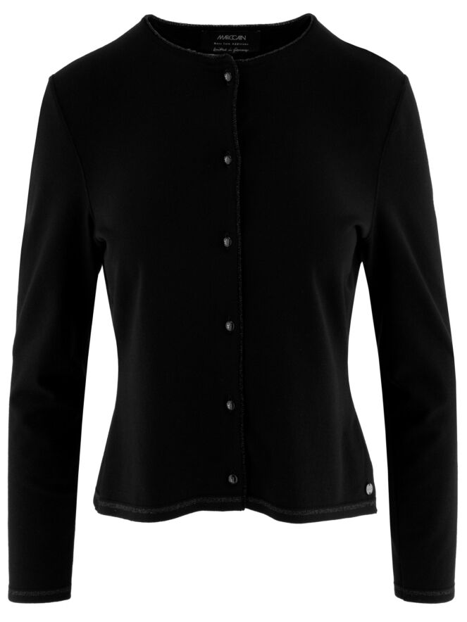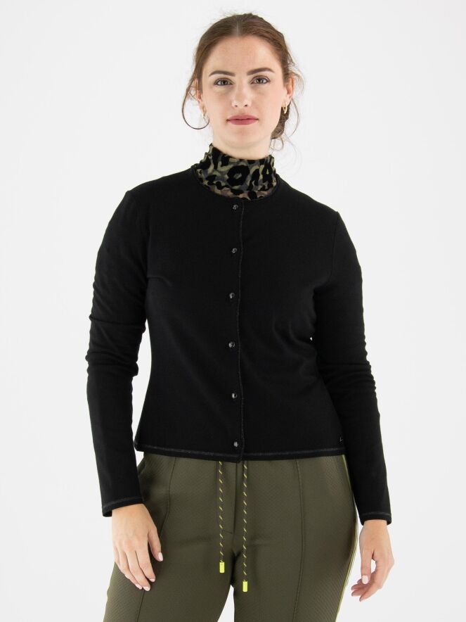 Een kort vest van Marc Cain in de kleur zwart. Langs de rand van de hals en de sluiting loopt een bies waarin een zwart metaaldraad is verweven. Langs de onderrand zit een smalle, fijn geribbelde tricot boord die gelijk is aan de bies. Dit vest mag op 30 graden worden gewassen.