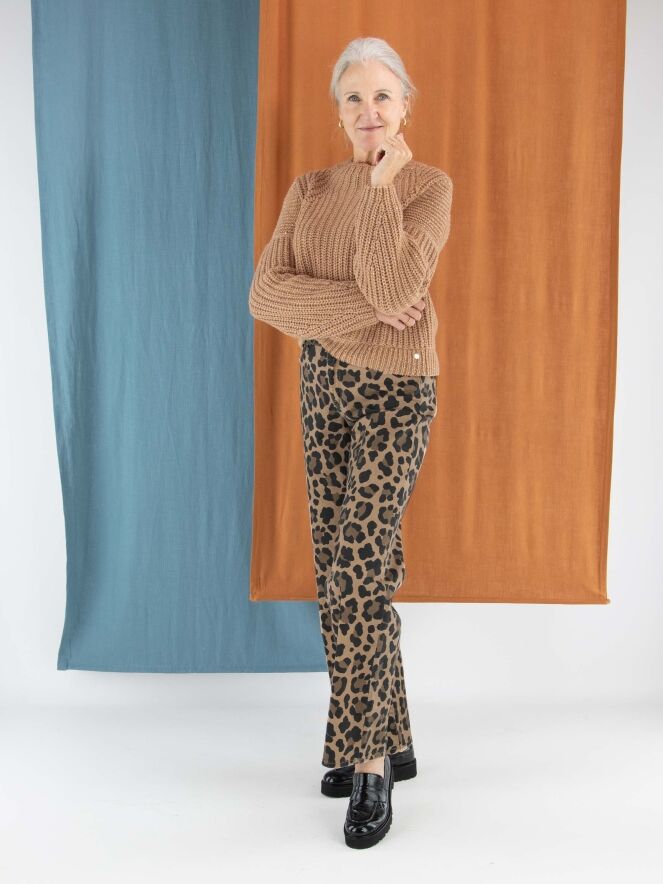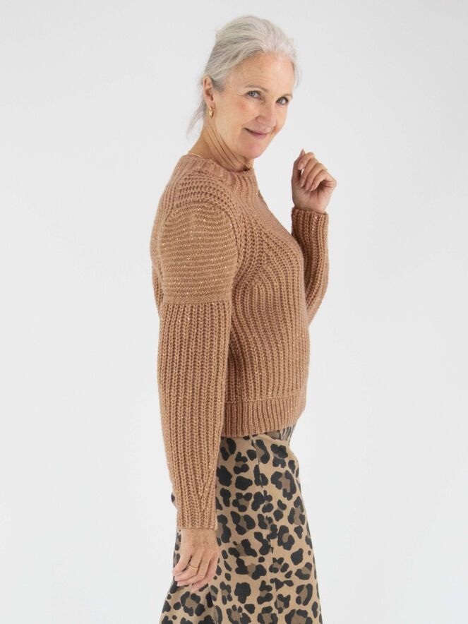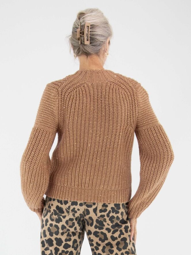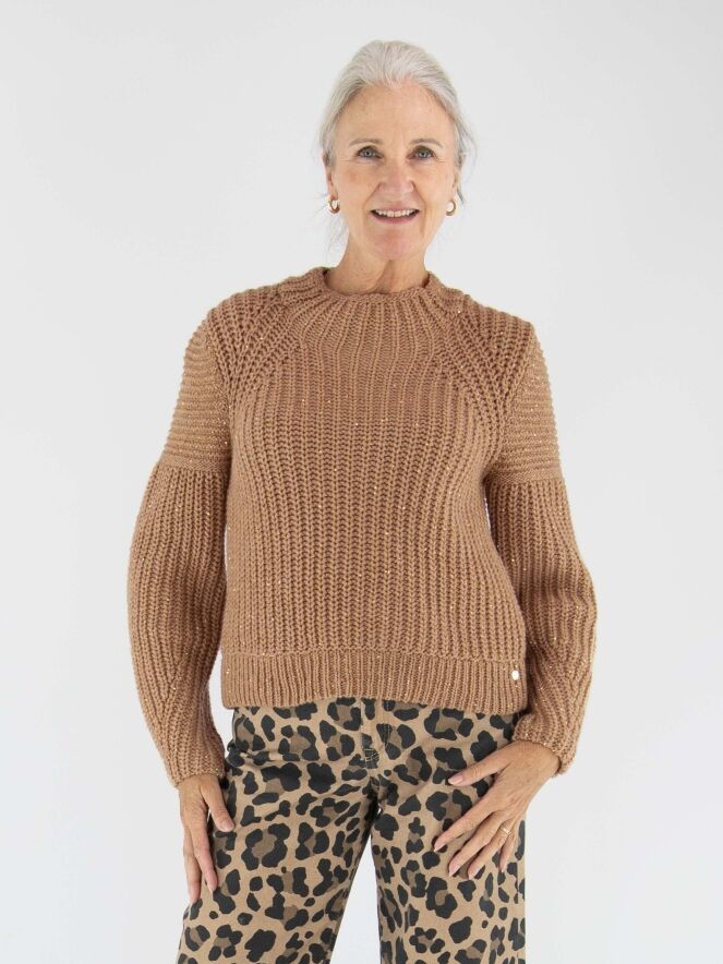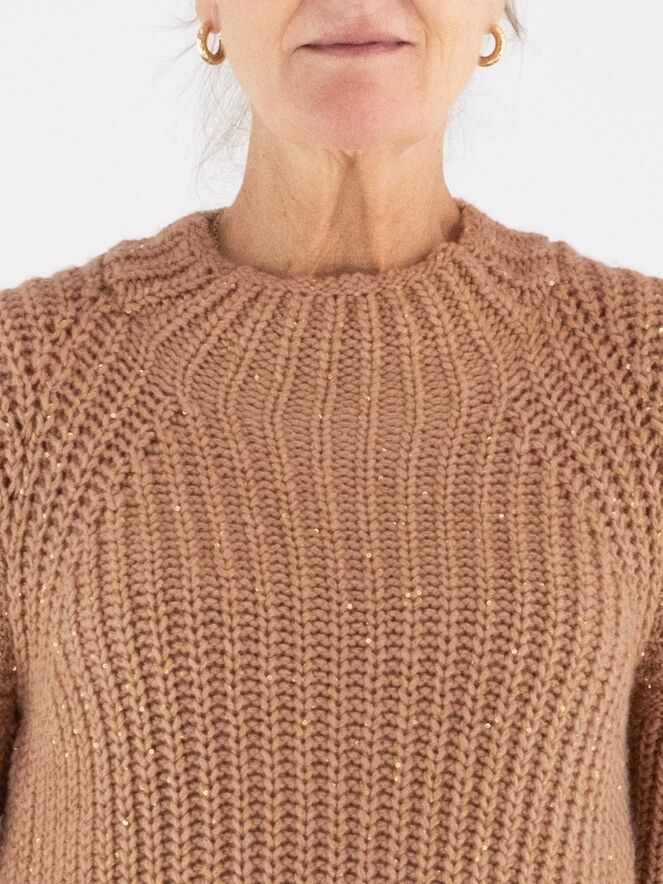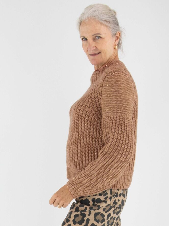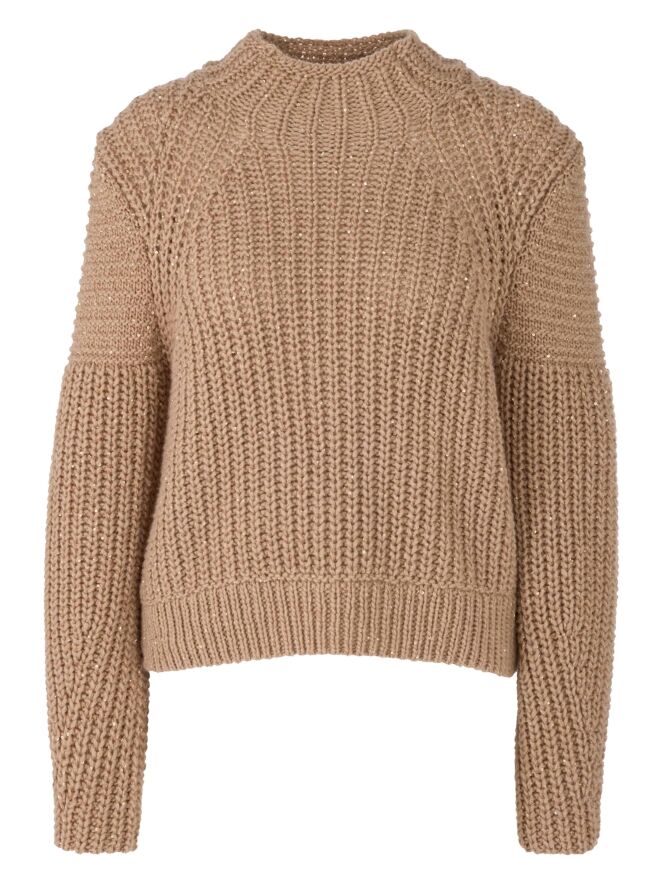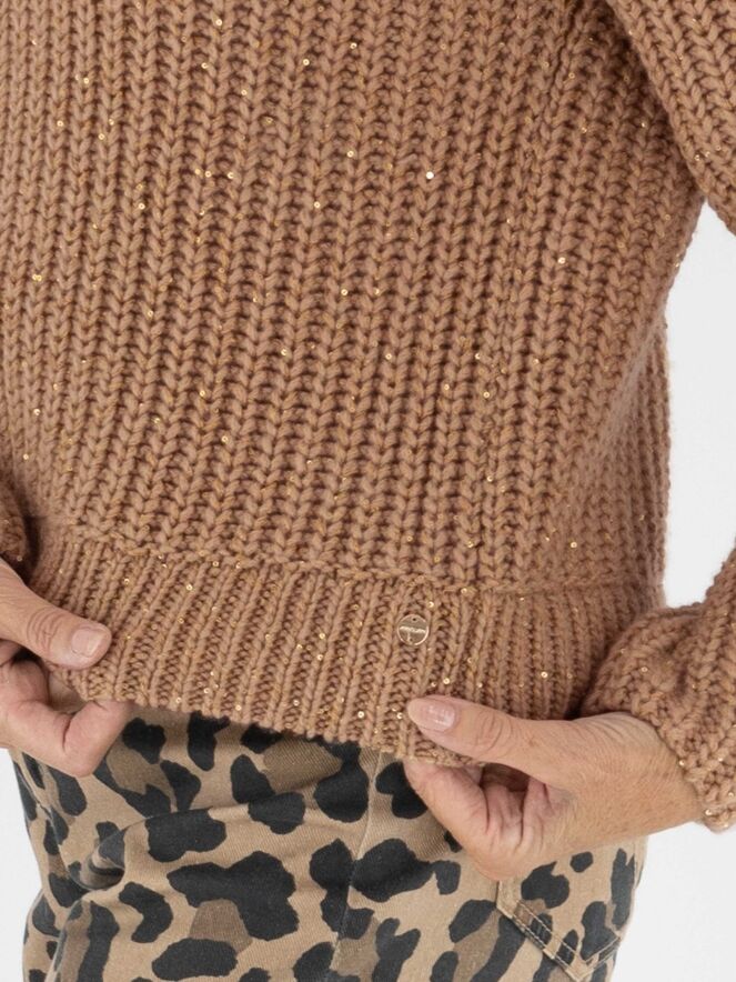 Een pullover van Marc Cain in de kleur camel. In de patentsteek zijn glanzende camelkleurige lovertjes verwerkt. De pullover heeft een turtle hals en mag met de hand worden gewassen.