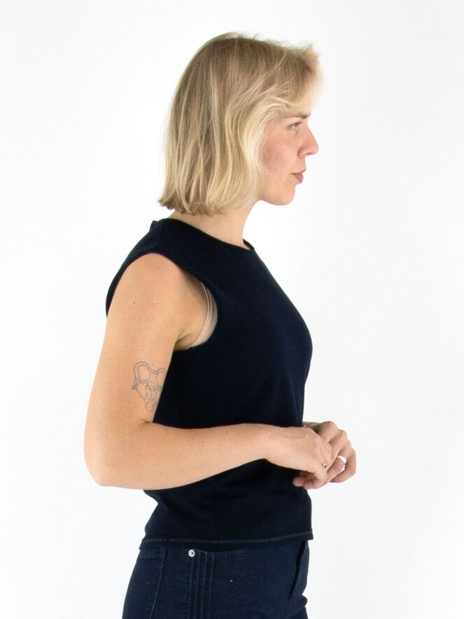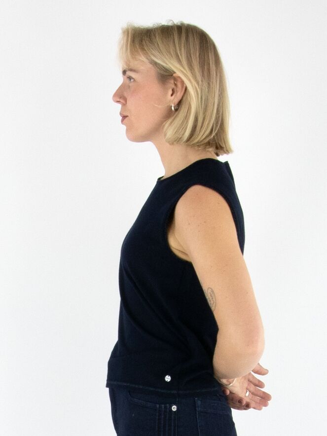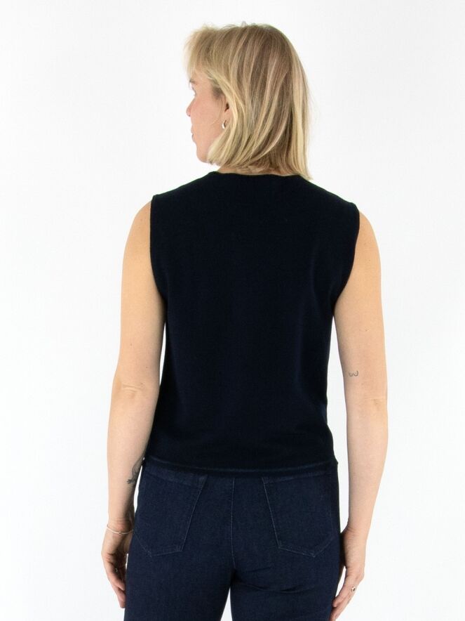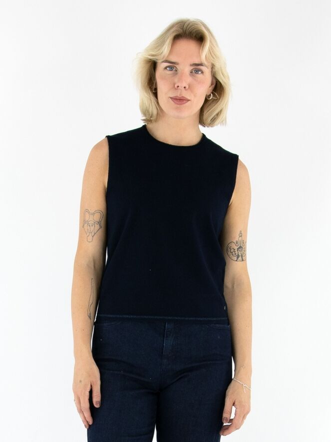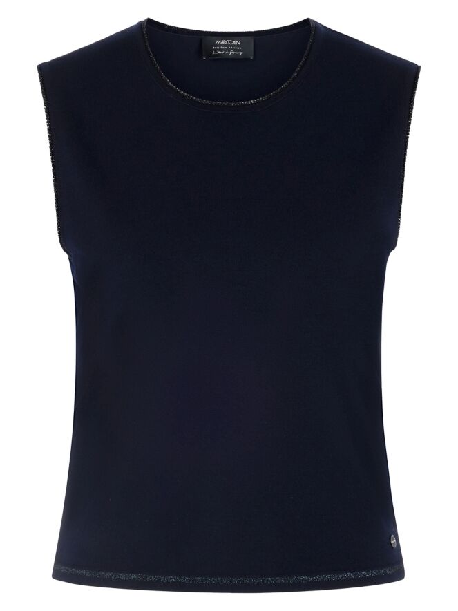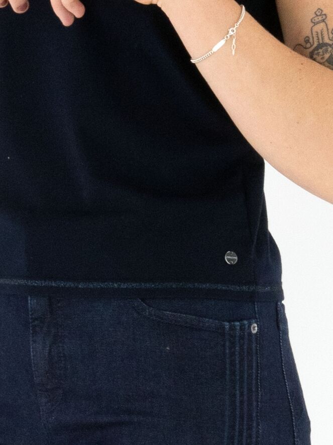 Een korte top van Marc Cain in een diepe marineblauwe tint. Langs de rand van de mouwinzet en de ronde hals loopt een glanzende bies in een verfijnde netstructuur, wat de top een elegante en moderne uitstraling geeft. Deze top kan op 30 graden worden gewassen.