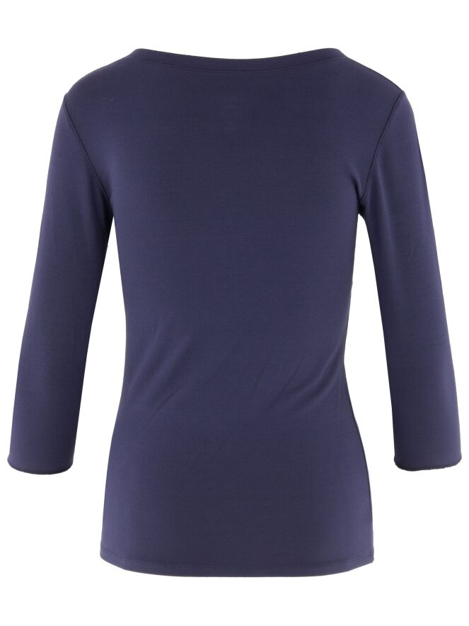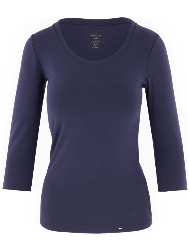 Een uni shirt met een half lange mouw van marc Cain Collections. De mouwen hebben een kleine omslag. De hals heeft een brede bies in hetzelfde materiaal en kleur als het shirt. Het shirt mag op 30 graden worden gewassen.